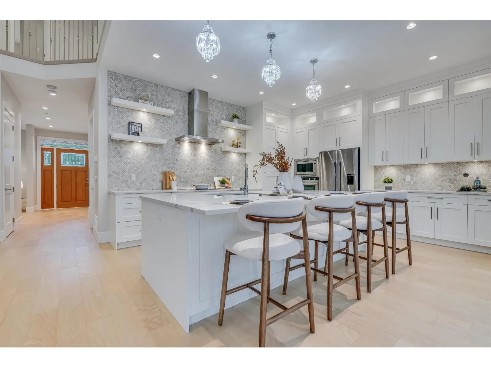 This amazing custom built home is located in White Rock's most desirable area. The astonishing vaulted ceiling in the living room and the natural light that floods in through the south facing front windows. The primary bedroom on the main with full 5 piece ensuite & walk in closet. The massive granite island in the kitchen, herringbone tile backsplash & Fisher Paykel appliance package make this home perfect for entertainers, growing families and multi-generational living. The primary bedroom above has its own balcony along with 2 more large bedrooms w/shared ensuite. Downstairs has a large rec room w/ separate entry & 1 bedroom/bath just off of the roughed in wet bar. 2 AC units/generator, a 1 bedroom legal suite, detached double garage w/lane access. Within the Semiahmoo Catchment. (id:27476)