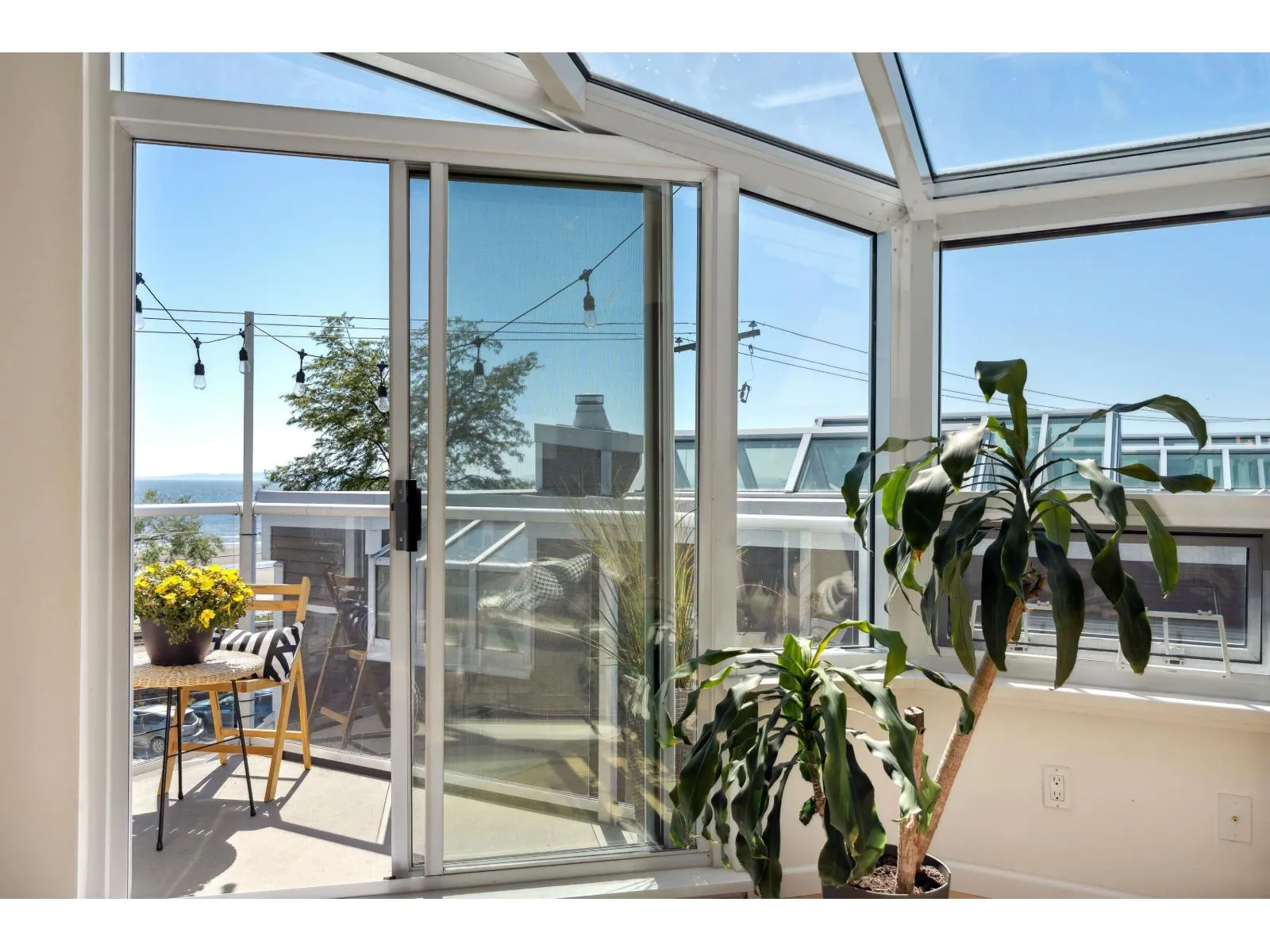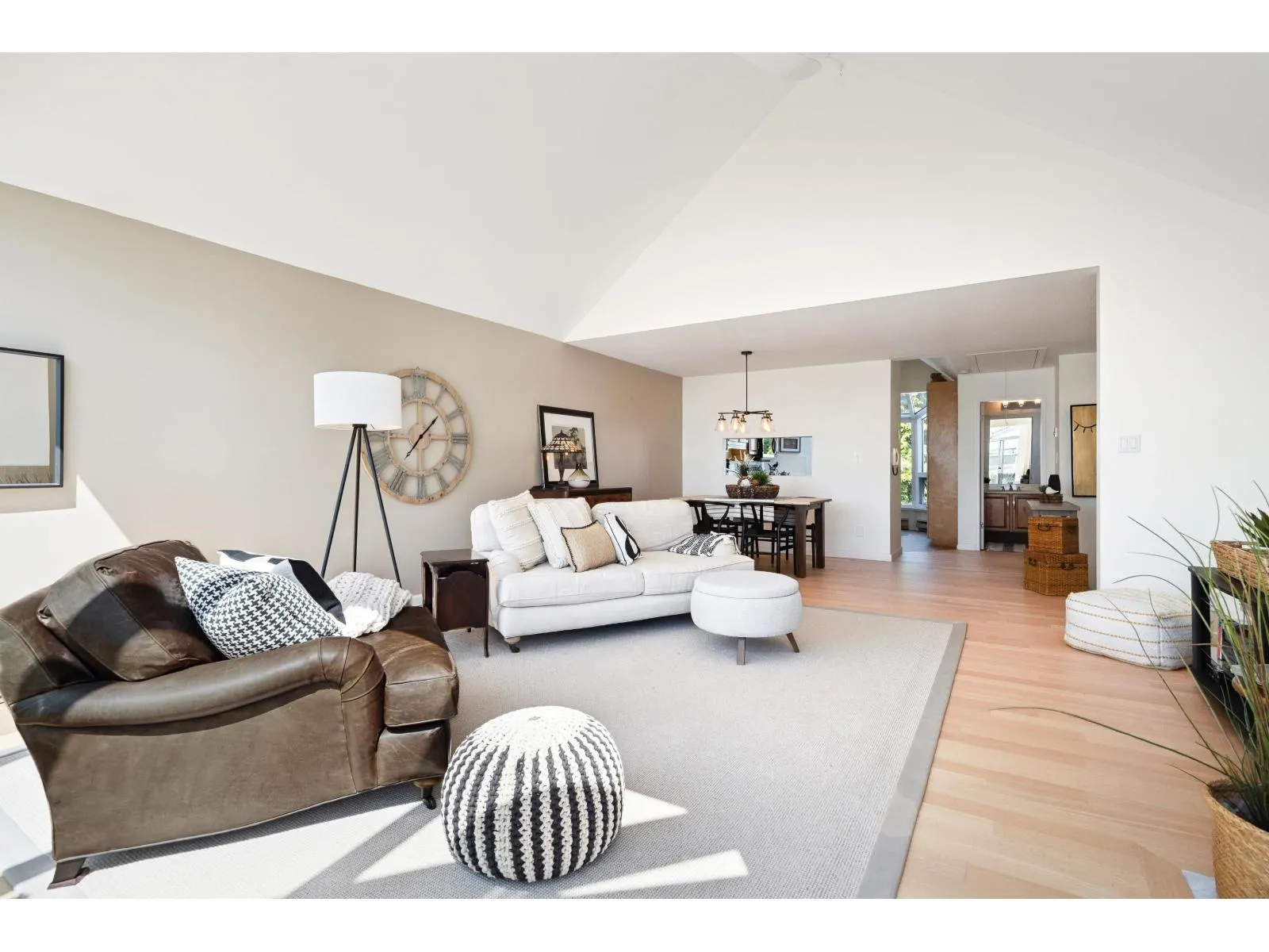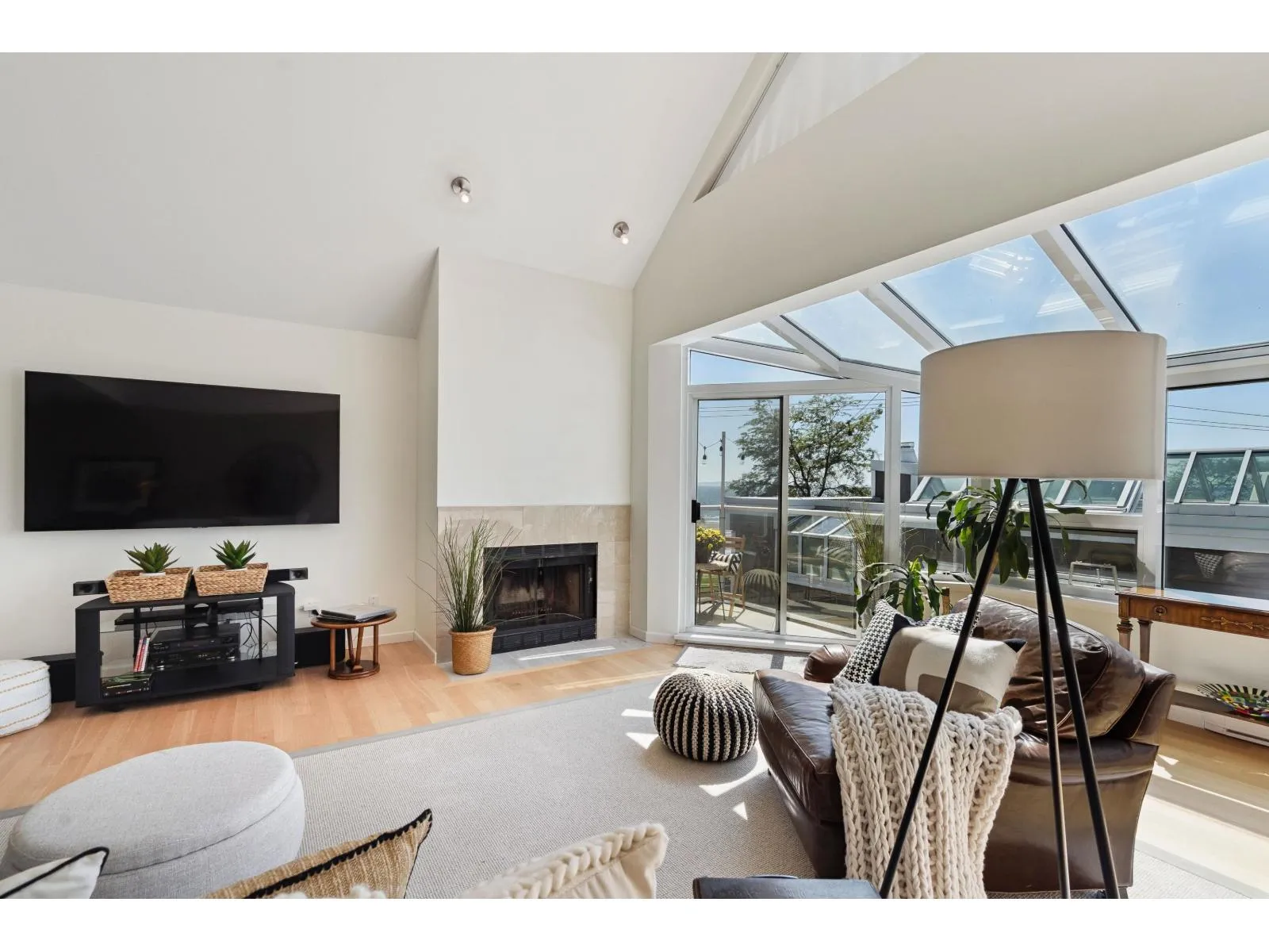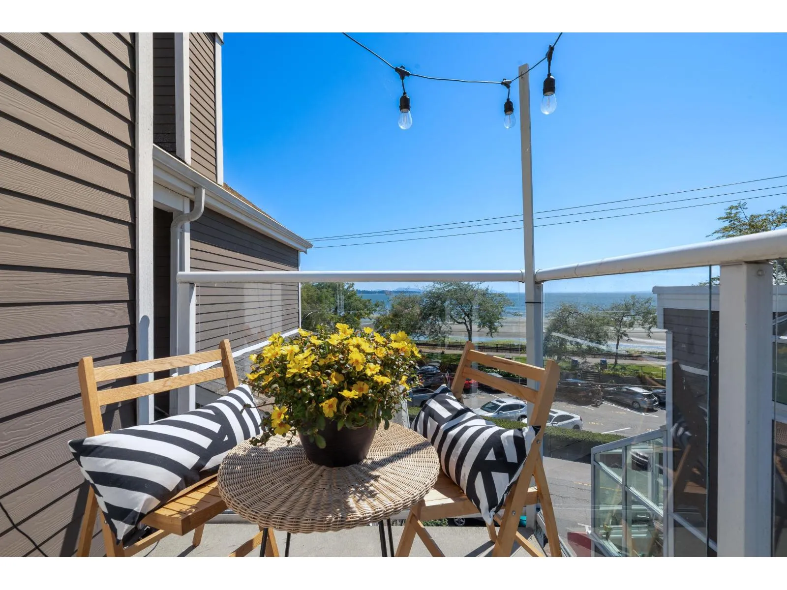 Live by the beach! Ocean views throughout this two storey townhouse across from White Rock beach. Bright & airy w soaring vaulted ceiling, skylights & large windows to capture the views. Almost 1,600 sq ft w generously sized rooms for house sized furniture. 2 sea view balconies to relax & bbq. Reverse floorplan w two large bedrooms & two full ensuite bathrooms on main; living room, dining, kitchen & powder room above. Respected Marine Court, updated w full rainscreen, hardi-plank exterior, vinyl windows, deck membranes, roof, skylights. Underground parking and storage. Pet friendly, no size restrictions. All ages welcome. Move in and enjoy the beach lifestyle. (id:27476)