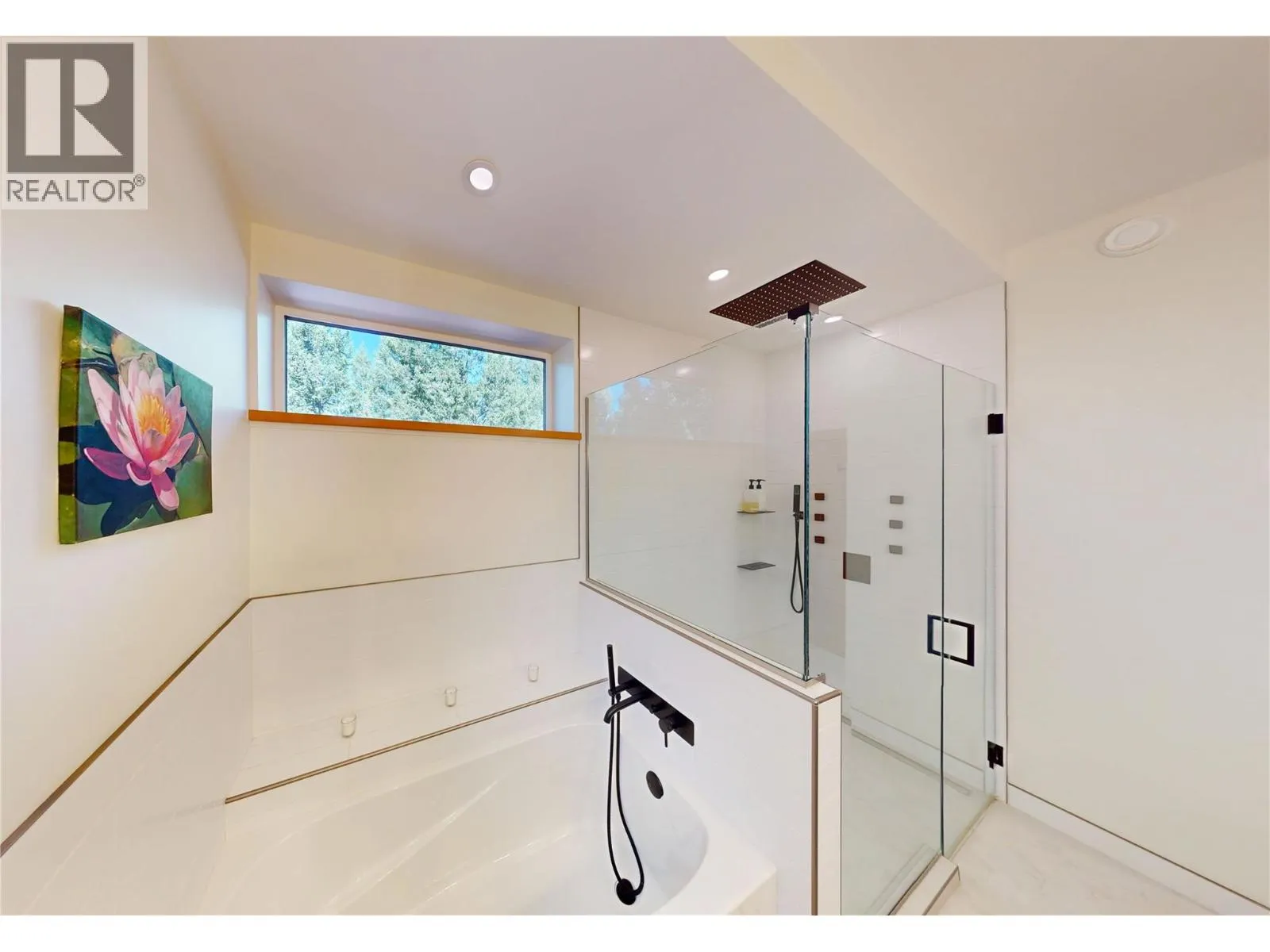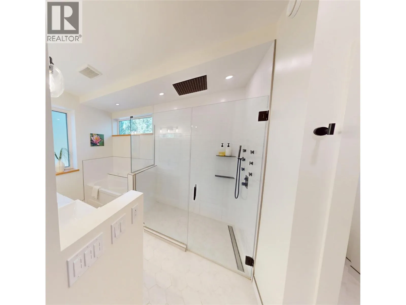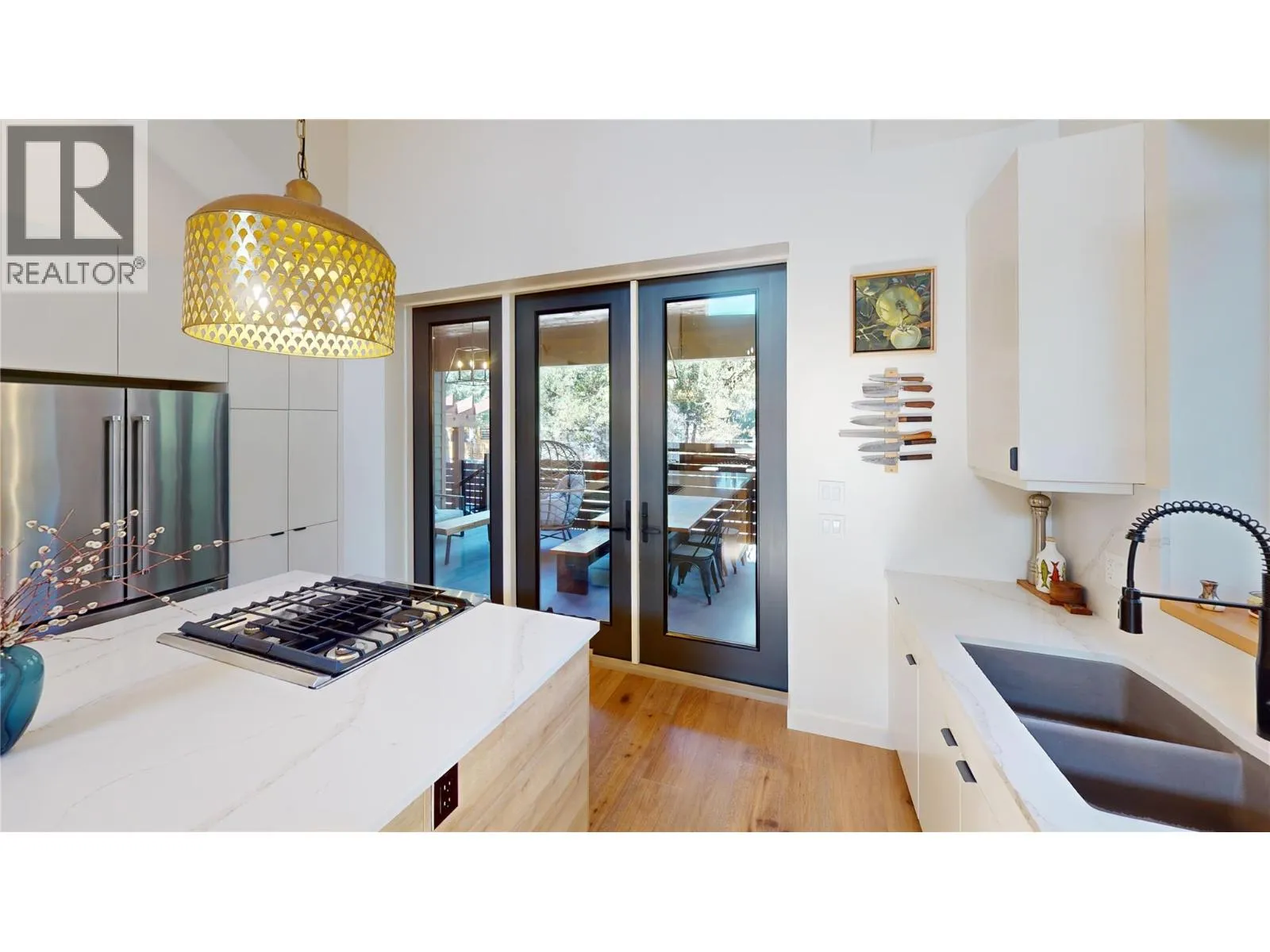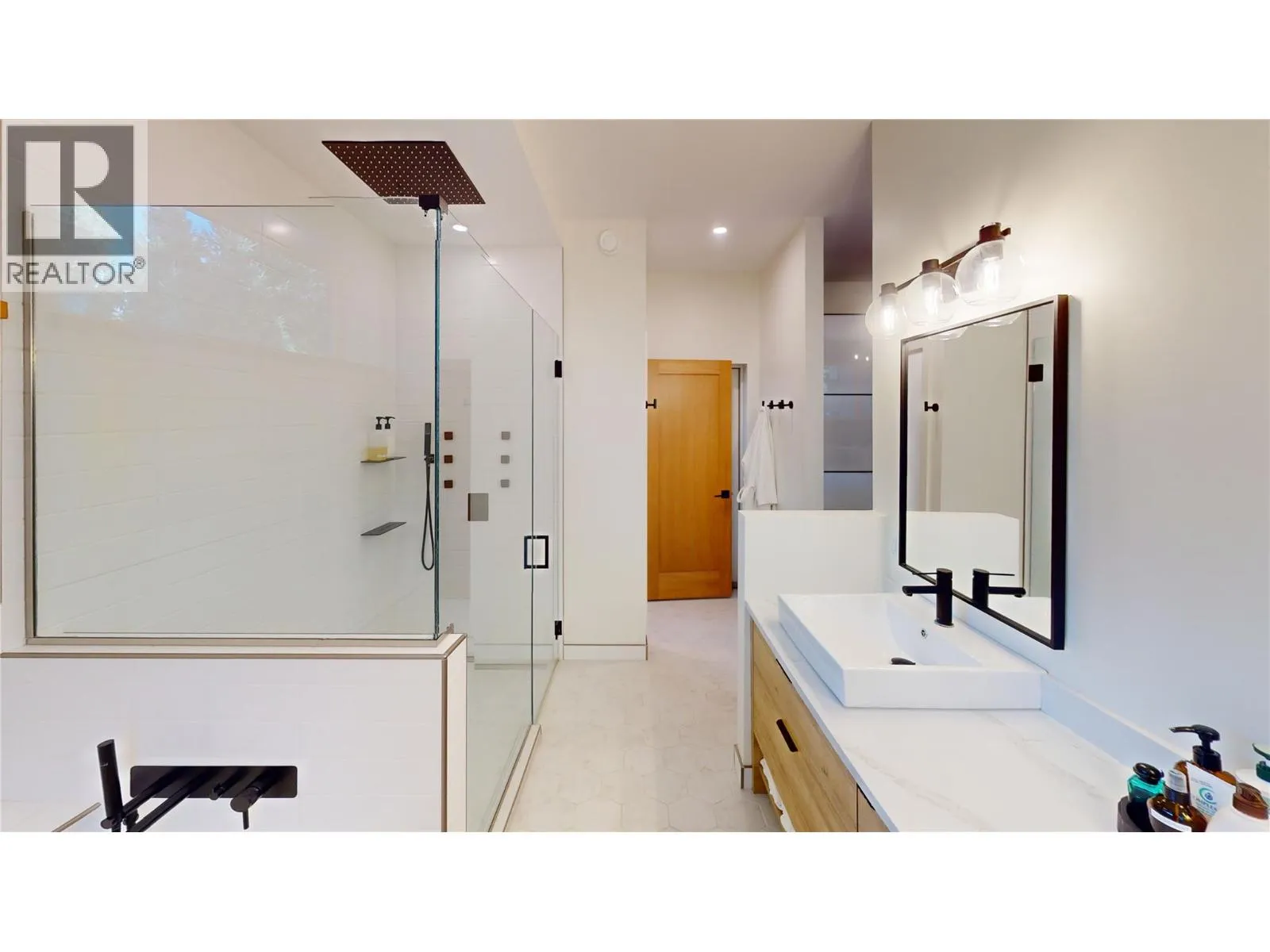 Discover this stunning, nearly-new Pedley Heights residence offering exclusive beach access and modern mountain living at its finest. Featuring three spacious bedrooms plus a versatile den that can serve as a fourth bedroom, this home blends comfort, craftsmanship, and style. The open-concept main floor is designed for effortless entertaining, with two sets of deck doors that extend your living space to a heated concrete patio. Overhead radiant heaters allow you to enjoy the outdoors throughout the year. Inside, vaulted ceilings with locally sourced custom wood beams and large windows fill the space with natural light. A sealed, high-efficiency fireplace with a fan creates the perfect spot to curl up with a book or a warm drink on cold winter nights. The generous primary suite offers private deck access and a bright, spa-inspired ensuite featuring heated floors, a rainfall shower with multiple showerheads, and direct access to the saltwater hot tub. The lower level includes two additional bedrooms, a full bathroom, a laundry room, and a family or recreation room with a custom wet bar that includes wood shelving, a dishwasher, a wine fridge, and a microwave. The oversized garage accommodates trucks and boats and features heated floors, a half bath, and a side gear room for all your equipment. Outside, you will find thoughtful details such as firewood storage for the fireplace and firepit, along with ample storage beneath the rear deck. The custom, low-maintenance landscaping showcases vibrant flowers, mature trees, rock features, and a sweeping rock wall firepit area. A full irrigation system keeps everything lush so you can spend more time enjoying the nearby beach and golf courses. Just steps from your back door, a path leads to the private community beach, playground, and pickleball and basketball courts. This is your opportunity to experience the best of the Columbia Valley lifestyle. (id:27476)