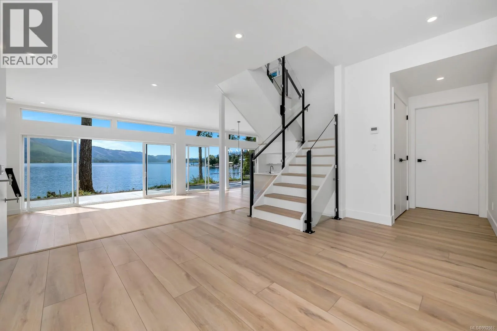 MASSIVE PRICE ADJUSTMENT AND NO FOREIGN BUYERS BAN in this location! NEW CUSTOM HOME - your own private DOCK INCLD IN PURCHASE PRICE (quoted cost credited to buyer on completion, buyer responsible for permit/installation). The ''Epitome of waterfront'' living, boasting breathtaking lake views from ALL major rooms!This meticulously designed custom home seamlessly integrates luxury and comfort. The large, private, flat property faces west, showcasing a walk-on beach with deep water moorage and miles of spectacular, unobstructed lake views, which can be seen from all major rooms. Step inside to discover the sleek, open concept interior, flooded with natural light and high-end finishes, wide plank flooring, as well as recessed lighting inside and out. On the main level, the in-line living, dining and kitchen are highlighted by 11â ceilings, and floor to ceiling patio doors and windows frame the incredible view. A large, linear gas fireplace highlights the living room. The kitchen features quartz countertops and backsplashes, Fisher & Paykel SS appliances, and an island for casual dining. The home gymâs French doors open onto a private patio. The laundry/mud room features a live-edge bench. This beautiful home boasts a luxurious primary suite and a second bedroom on each floor, which accommodates multi-generational, or aging-in-place living. Their spa-like ensuites have in-floor heating, double sinks and elegant wet rooms with amazing views! The upper floor features a home office, and a media room that opens onto a spacious deck with privacy glass and more views! Entertain guests in style in your spacious new home and enjoy the stunning sunsets. Embrace this once in a lifetime opportunity to have your own waterfront paradise retreat! Construction by Made to Last Custom Homes Ltd. 2-5-10 Warranty in place.... EXPERIENCE THIS EXCEPTIONAL HOME IN PERSON (id:27476)