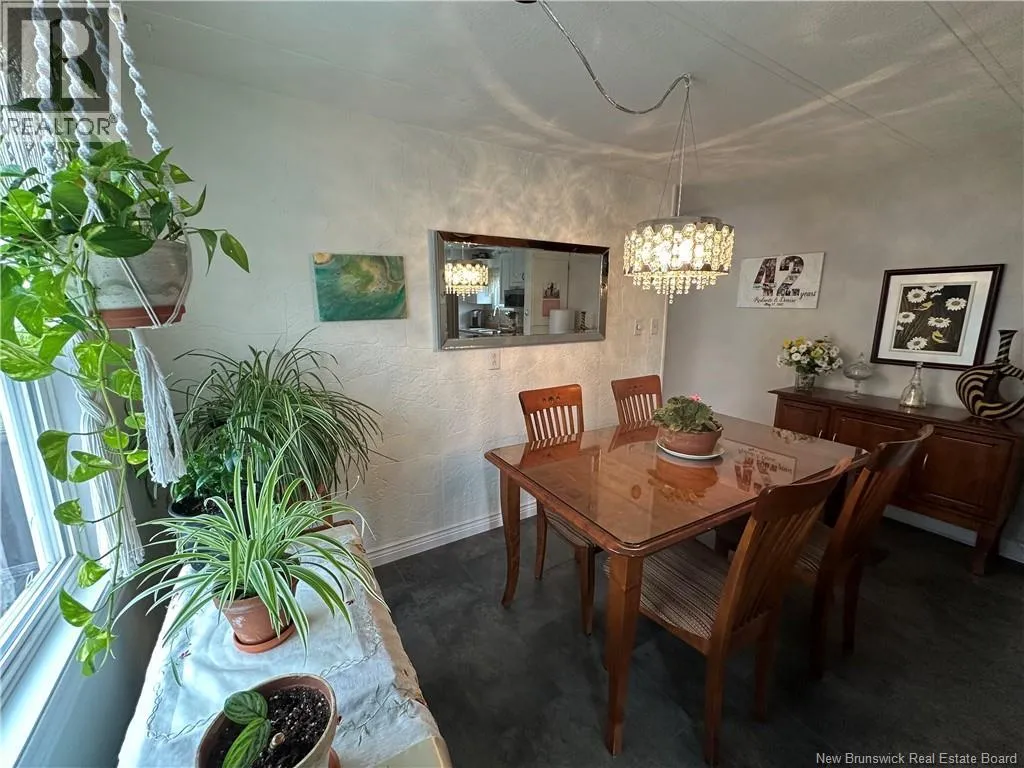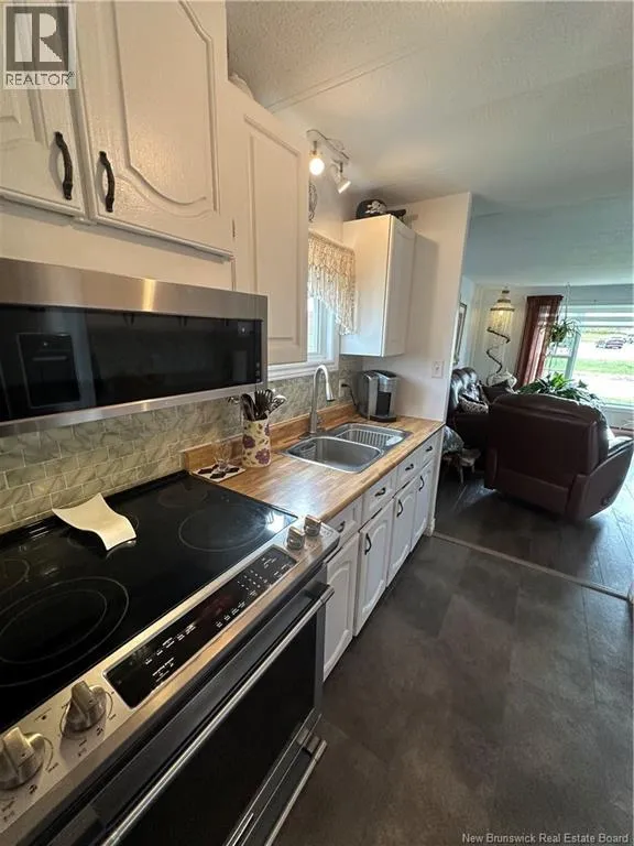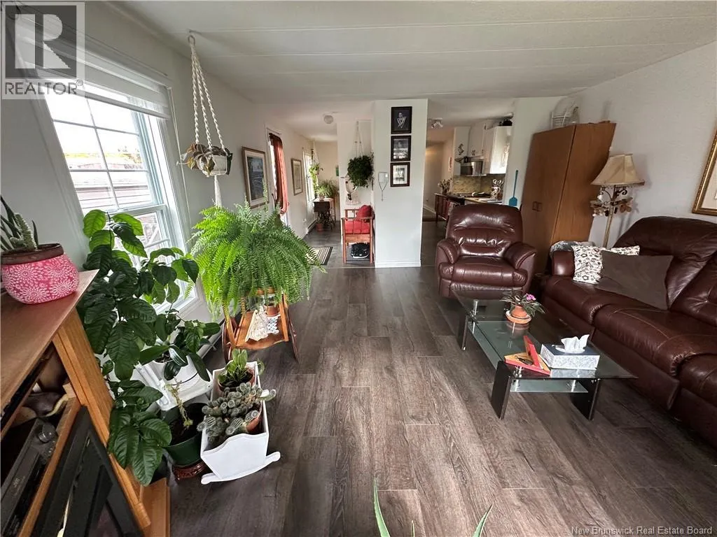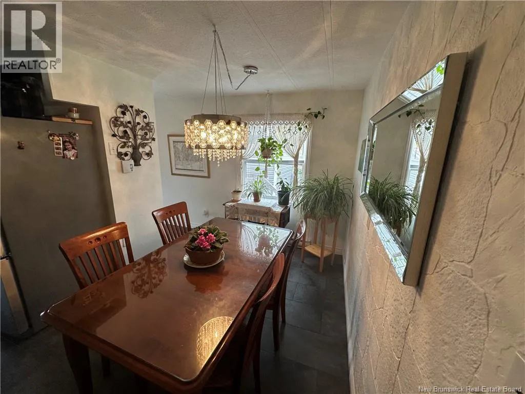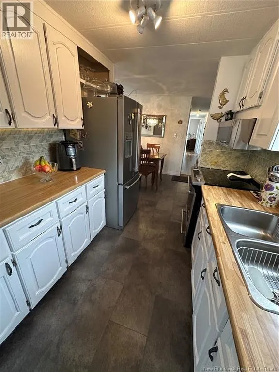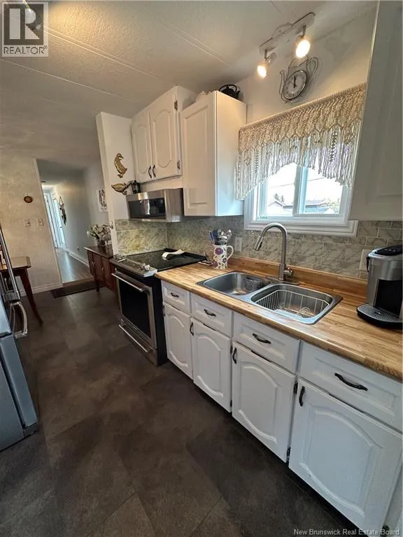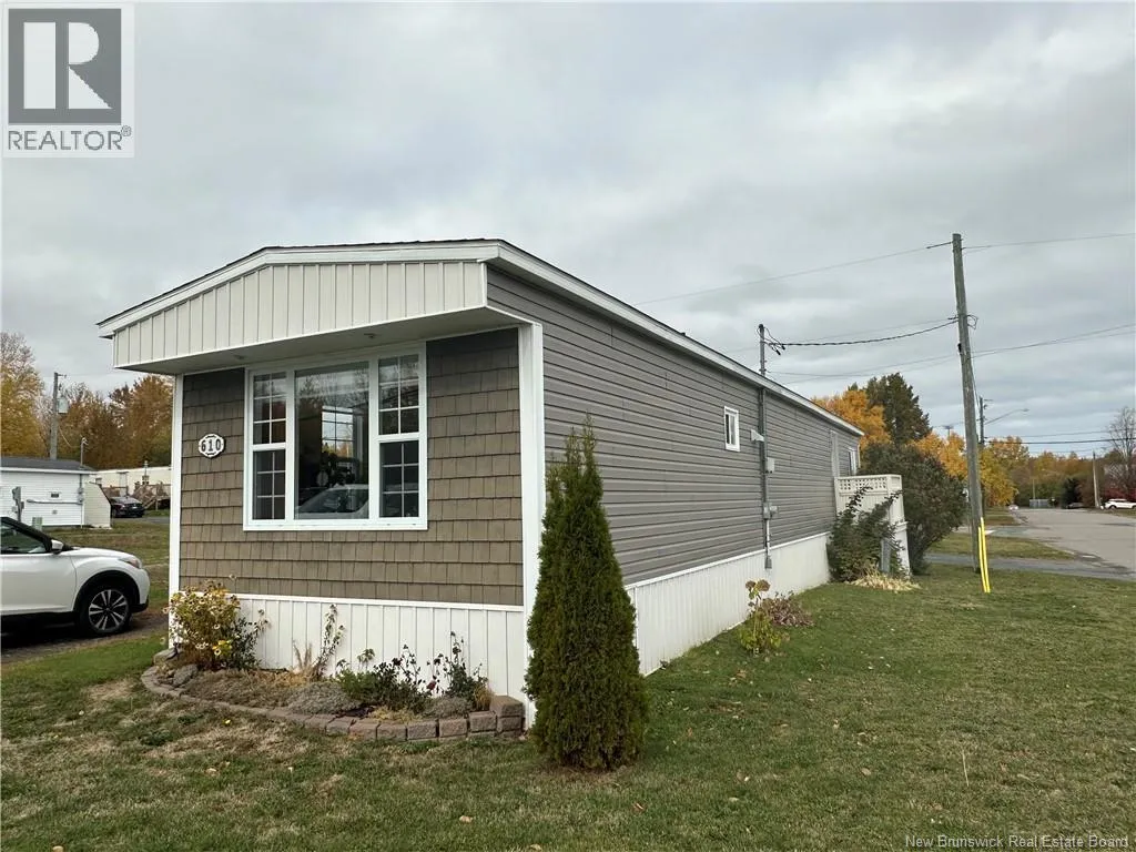 Corner of College St and Lakeside Beautifully appointed mobile home in the Kent Trailer park in Bathurst. Lots of updates and well maintained, sunshine floods this home with light. Situated on a corner lot with large private patio with privacy fencing surrounding it and storage shed for your garden tools and lawn mower etc. Enter the side door and there is an entry with closet and nice space without being in the living area or kitchen. Kitchen has painted cabinets and nice appliances which can be negotiated at time of sale. Dining room is spacious and allows for family dining and entertaining without being in the kitchen. The living room is large and on the front of the home with large PVC windows and amazing sunshine flooding in warming your space all fall and winter with passive energy! A fabulous place to grow plants! Then down the hallway you will find 2 good sized bedrooms and a full bathroom with laundry. The bathroom has nice new vanity and storage tower making it sleek and modern. The other access door off the hallway has a small balcony. There is a second parking space behind this mobile home access from the street behind ideal if you are a two car family and need more parking! (id:27476)