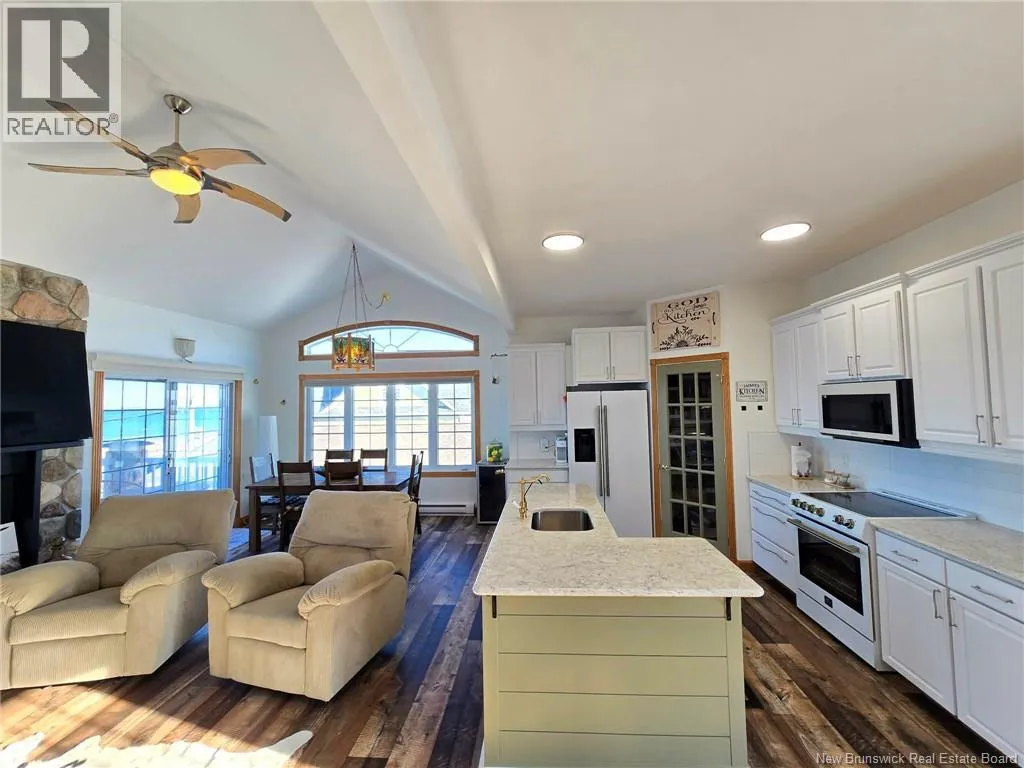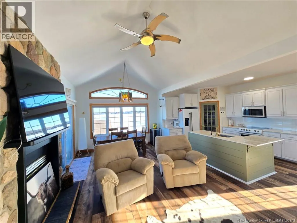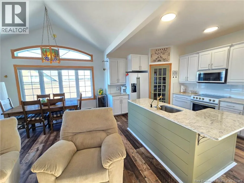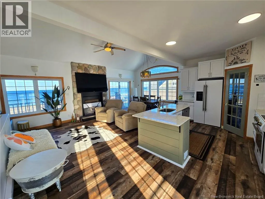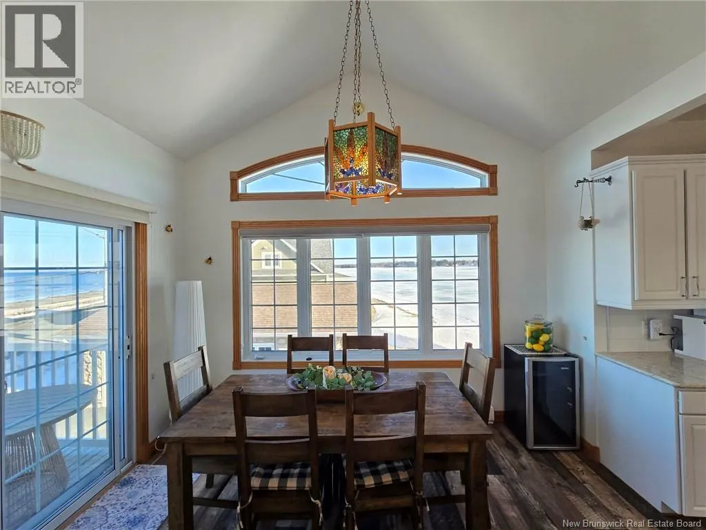Rue Principale to Rue Parc, Right on John Cormier Experience waterfront living in this coastal retreat, perfectly positioned between the Bay of Chaleur and the lagoon, offering stunning sunrise and sunset views. Enjoy the ultimate outdoor lifestyle with your own sandy beachideal for swimming, relaxing, kayaking, and paddleboarding right at your doorstep. Located in a welcoming community, youll enjoy nearby amenities like a kantine, live entertainment, kids park, and arena. The home features a bright open-concept design with cathedral ceilings and large windows showcasing water views throughout. The main living area on the second floor includes a cozy wood-burning fireplace and patio doors leading to an upper deck overlooking the bayperfect for relaxing and taking in the scenery. The kitchen is finished with white oak cabinetry, quartz countertops, a center island, and a walk-in pantry, while the dining area is positioned to enjoy the views. The primary bedroom offers large windows, a walk-in closet, and a full bathroom across the hall with laundry. The fully finished lower level offers flexibility with an open living and dining area, kitchenette, two bedrooms, and a full bathroomideal for an in-law suite or Airbnb potential. A detached 24 x 32 heated garage with a heat pump completes the property. Recent upgrades include fixtures, backsplash, flooring, fresh paint, and new heat pumps. With year-round outdoor activities and waterfront access on both sides, this property is a rare lifestyle opportunity. (id:27476)