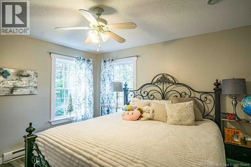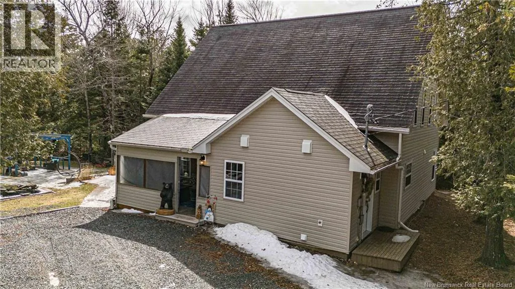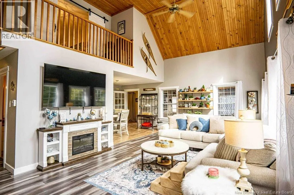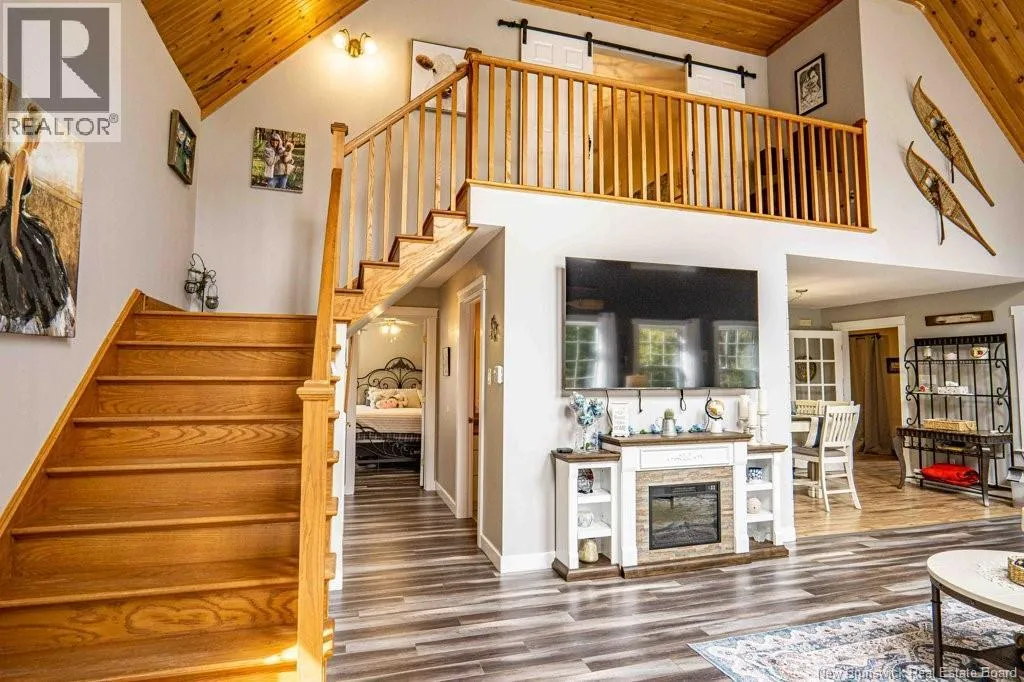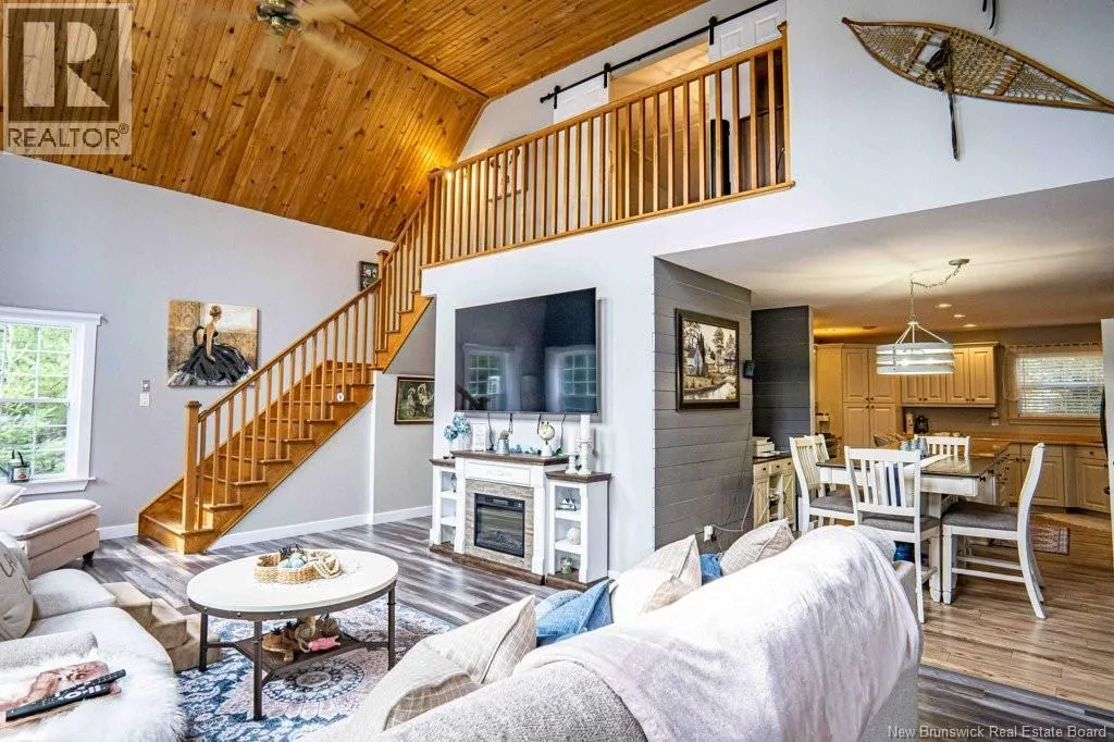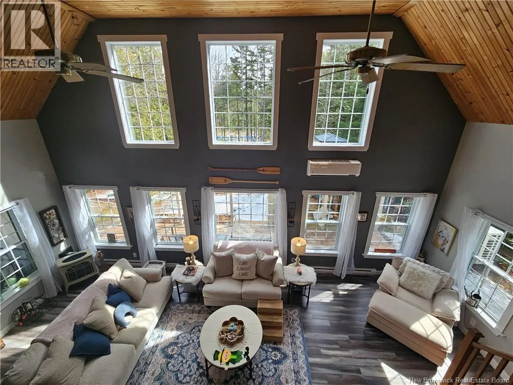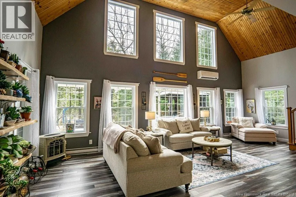 From Fredericton: Follow highway 101 to Charters Settlement. Follow Charters Settlement Road to Country Squire, turn right onto Lakeview, in 500 m your destination will be on your left. Tucked away on a beautifully secluded lot, this stunning 1.5-storey home offers a rare blend of privacy and modern comfort. With 2 spacious bedrooms and 2 full bathrooms, the thoughtfully designed layout creates an inviting space that feels like home the moment you arrive. As you step inside the screened in porch, there's an immediate sense of anticipation for what awaits inside. The open concept living area showcases jaw dropping cathedral ceilings and an expansive wall of windows that flood the space with natural light, creating an airy, uplifting atmosphere. The kitchen features newly painted cabinets and a large island that provides plenty of extra storage. The neutral color palette and striking shiplap accent wall adds character and elegance. This main floor also incorporates a large bedroom with his-and-hers closets, a full bathroom, and a convenient mudroom and laundry area. Upstairs, the renovated primary bedroom retreat feels like a private sanctuary. Imagine unwinding in the freestanding tub while taking in a quiet snowfall or the glow of vibrant autumn colors through the large showcase windows. This elegantly designed space also includes two walk-in closets, one leading directly to the private ensuite. Outside, the beautifully landscaped property offers multiple entertaining spaces as well as the privacy to enjoy the quiet beauty of nature. This incredible property is a peaceful escape for those seeking country living without sacrificing style or comfort. (id:27476)