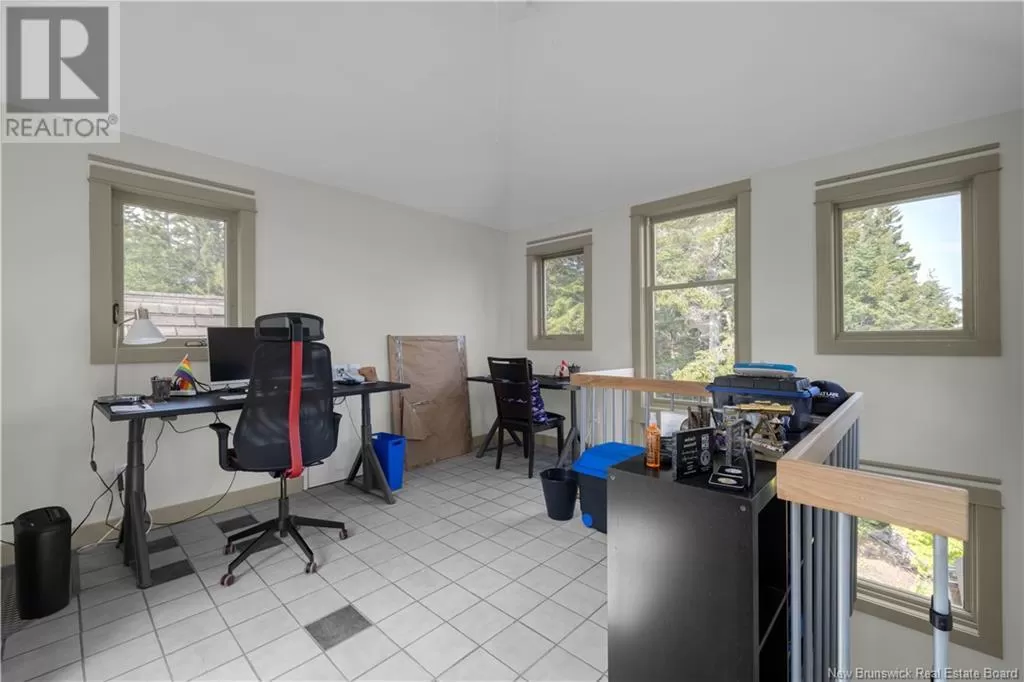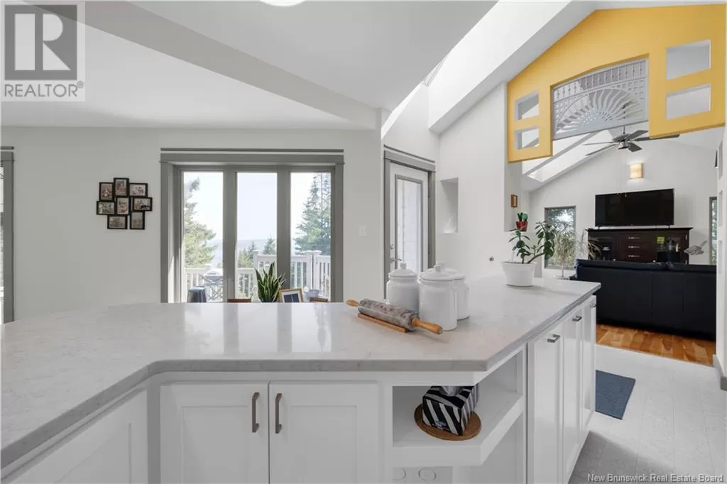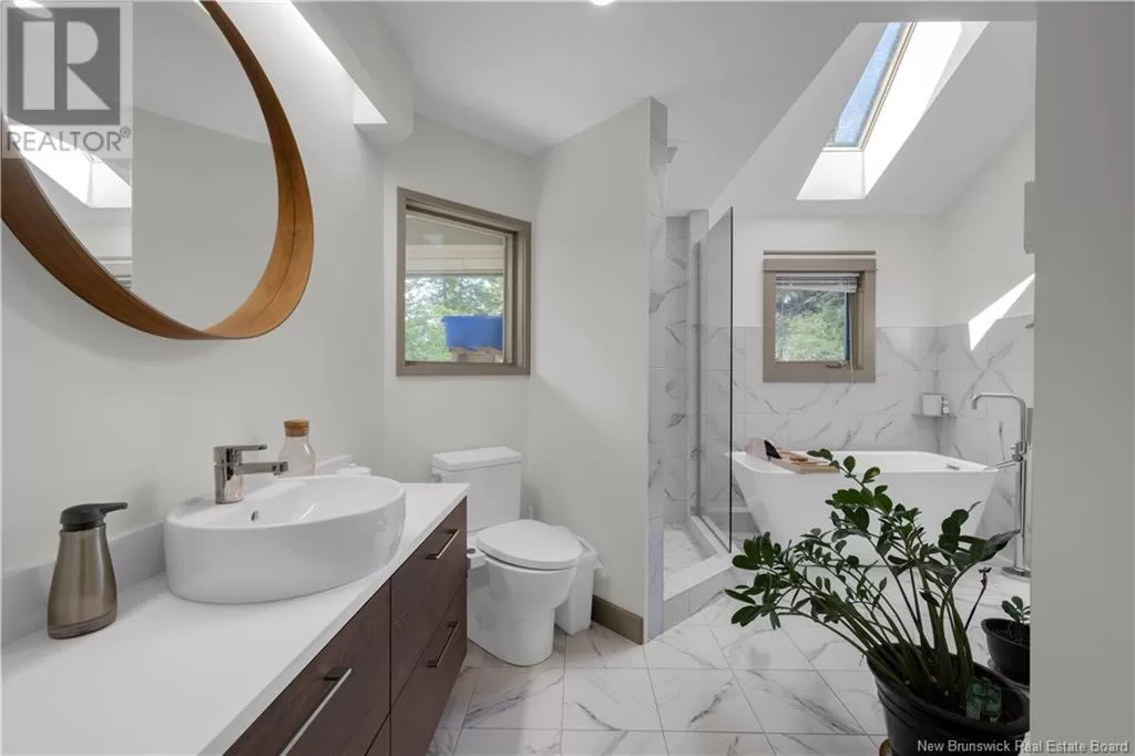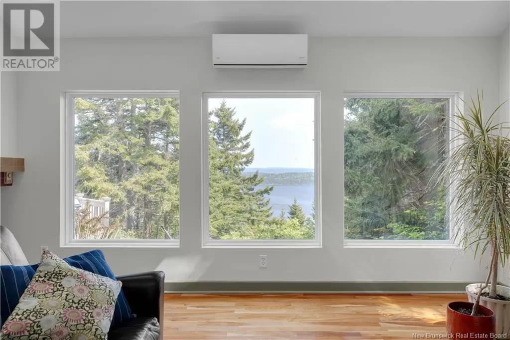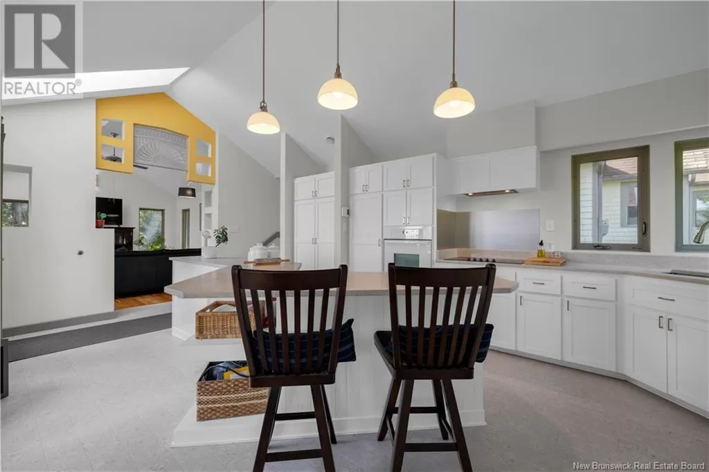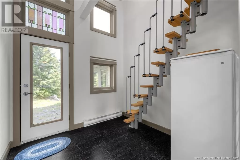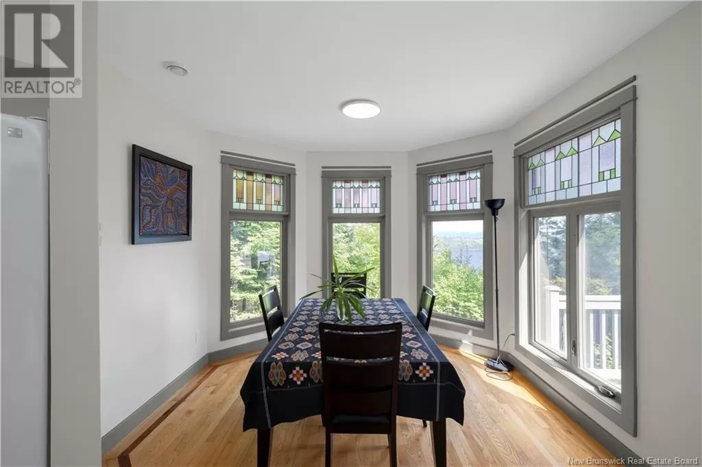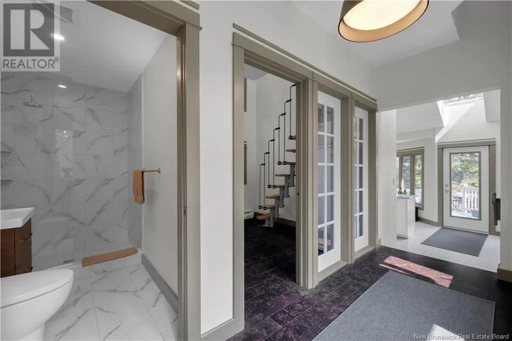 From Gondola Point Ferry turn left on Route 845. Drive approx. 12 km - on your right is Rock Ridge Lane. Welcome to a truly unique and thoughtfully designed home, nestled on 18 acres of privacy with sweeping views of the stunning Kennebecasis River. This one-of-a-kind, architecturally inspired residence offers stylish one-level living with a seamless connection to its natural surroundings. The spectacular open-concept living space features a bright, renovated kitchen that flows effortlessly into the dining and living room. Large windows offer a picturesque frame of the breathtaking river vistas, while the unique stained glass features in the dining room and skylights in the living room make the space feel truly connected to the natural outdoor surroundings. Step outside onto the back deck accessible from the kitchen and main living space and take in the beauty of your private oasis. The spacious primary suite is a serene escape, featuring a walk-in closet, as well as privacy doors to beautifully updated spa-like bathroom. Two additional bedrooms and another fully renovated bathroom provide comfortable accommodations for family or guests. Adding to the home's charm is a unique Italian-designed alternating tread staircase leading to a cozy loft retreatperfect for an additional living space, or home office - complete with its own balcony. Whether you're entertaining, relaxing, or exploring the acreage of your own land, this home offers a rare blend of architectural style, modern comfort, and natural beauty. (id:27476)