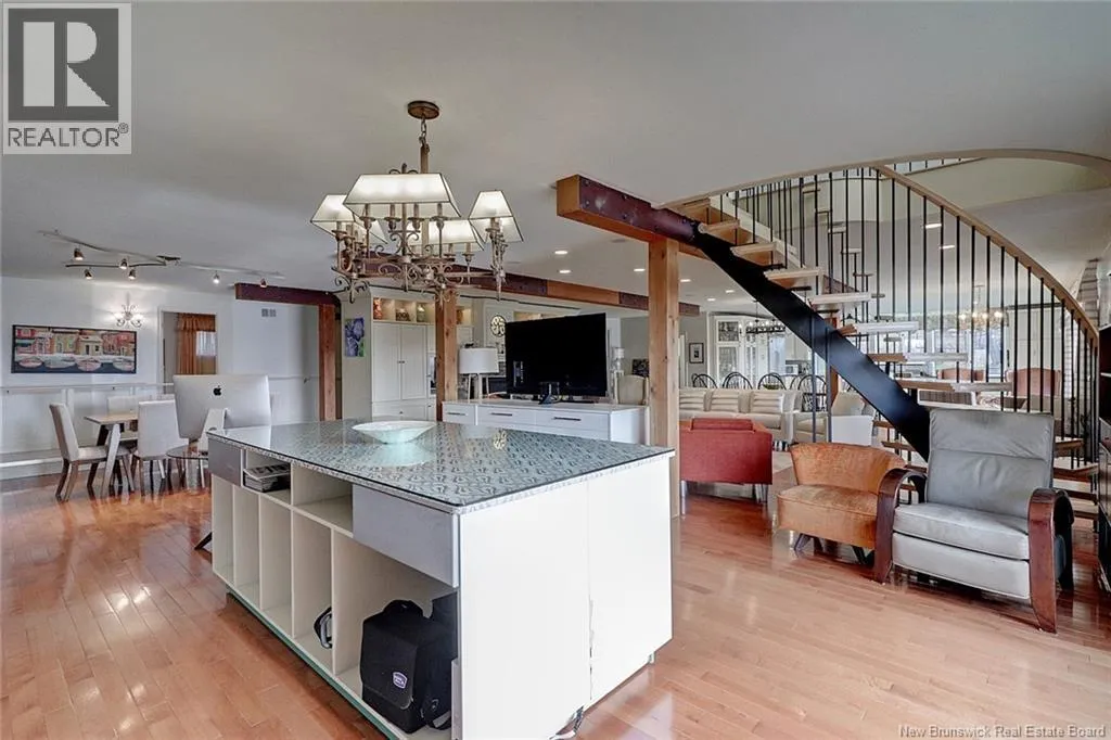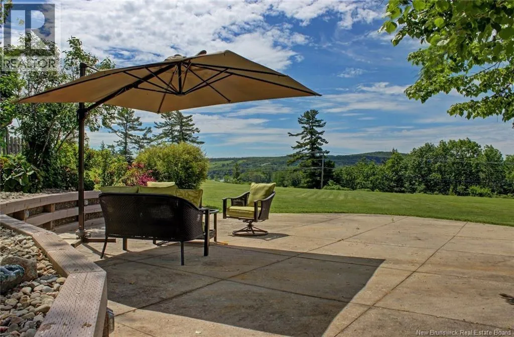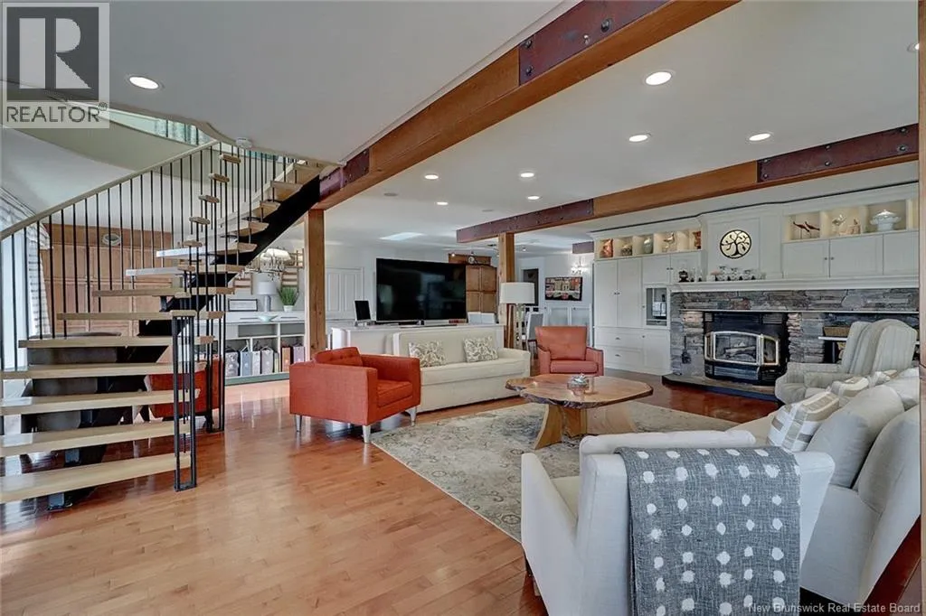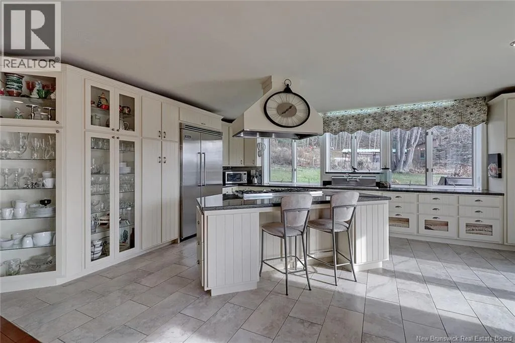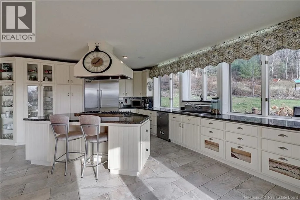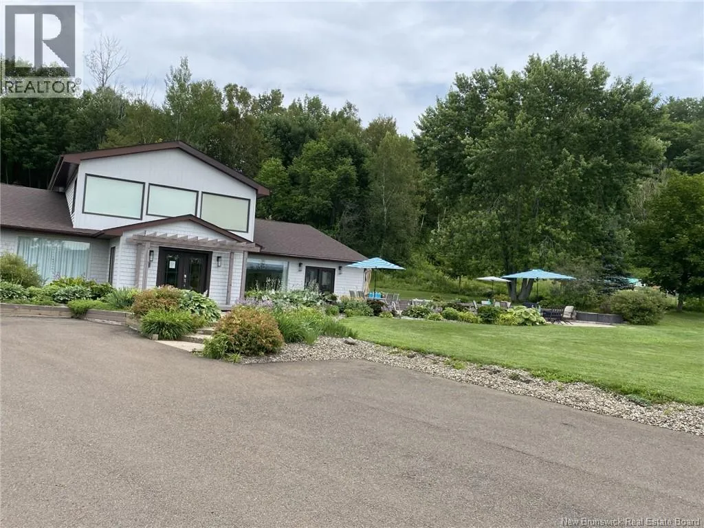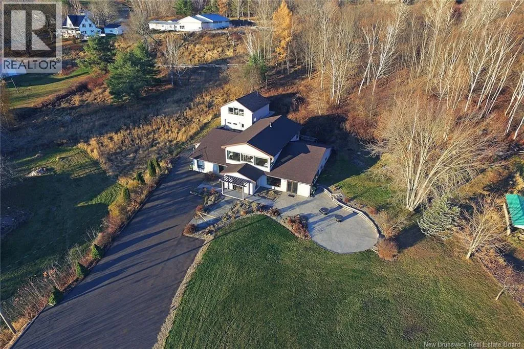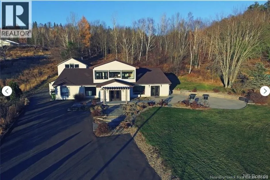 Fredericton North Route 105 from Fredericton West to Douglas, past Currie Mountain on right. An elegant custom designed home with views of the Saint John River is embraced by this 1.25 acre property: mature trees, meticulously sculptured landscaping & lush perennial gardens. The foyer invites you into a stunning open concept home with center core post & beam structure framing the beautiful 17 x 8.5 custom built display cabinet & full back library. Second story windows filter through the open spine staircase enjoying beautiful southern exposure throughout the day. A chefs dream kitchen surrounded by windows, custom cabinets, a walk-in pantry. The 48 combination full length fridge & freezer, a 4 rangehood, complete with granite counters, a 4 wide propane stove with 6 burners, a grill and 2 ovens. This home has 5 bedrooms, 4 powder rooms & 2 - 4 piece bathrooms with custom built tile, walk in showers, a large separate laundry room & lots of closet space. A 18x 9.5 home office with its own private entrance from outside & a door into the main house completes the main floor. The Master Suite, dressing room, huge walk-in closet, 2nd laundry room & 4 piece bath embrace 2/3 of the 1300 square foot 2nd level along with an additional living space & a kitchen! A 1,560 square foot 2 level detached garage top floor level of garage fully completed with vinyl click flooring & amazing studio space on the second level also with beautiful views of the Saint John River valley. It also has an electric car charger in the garage. This property has so much to offer! (id:27476)