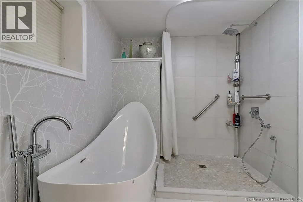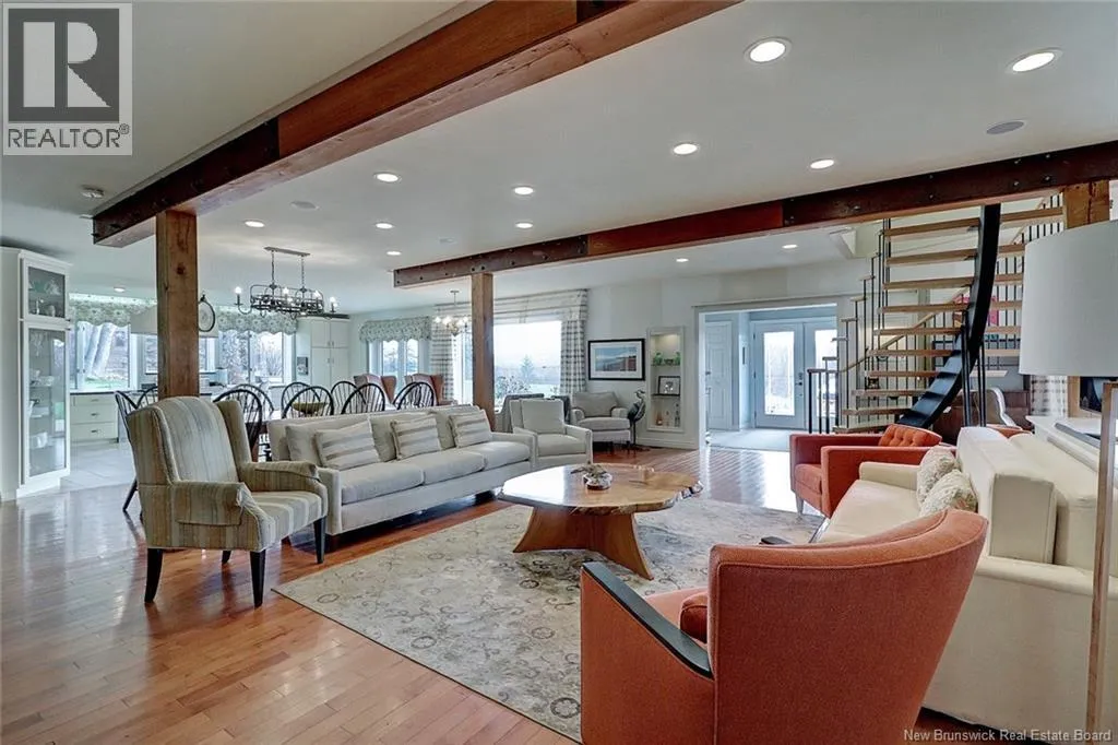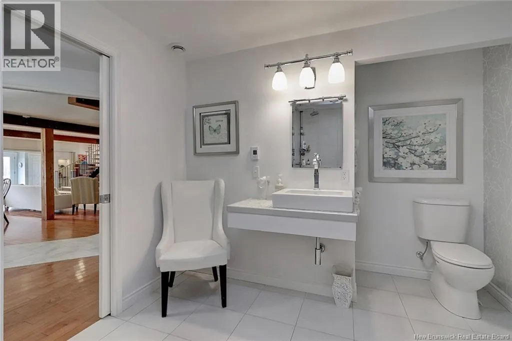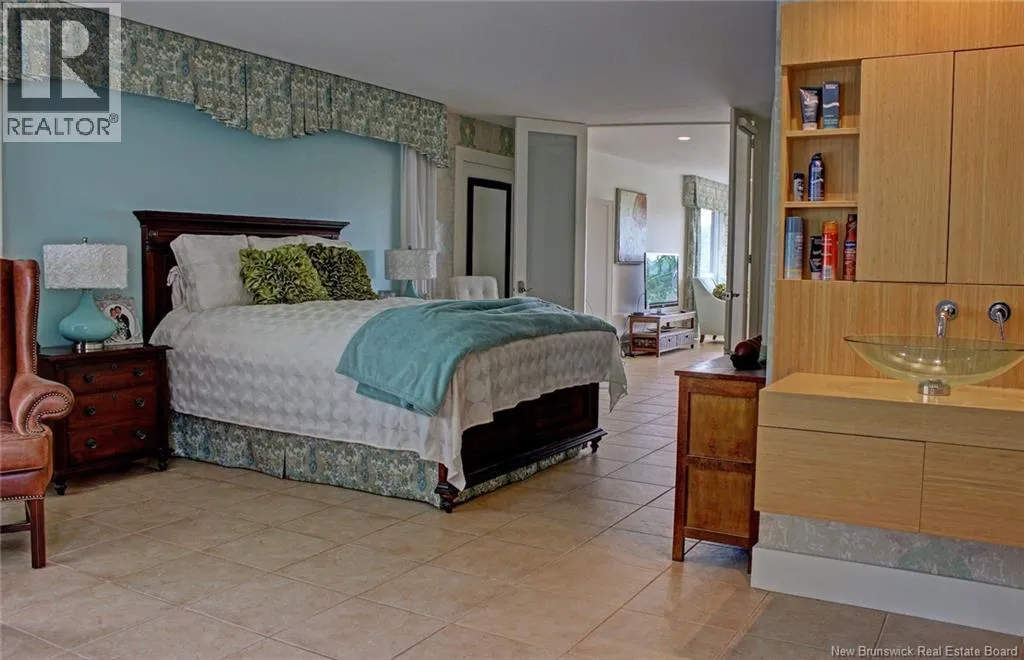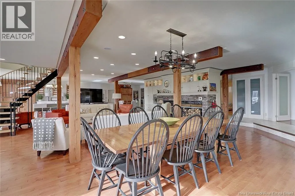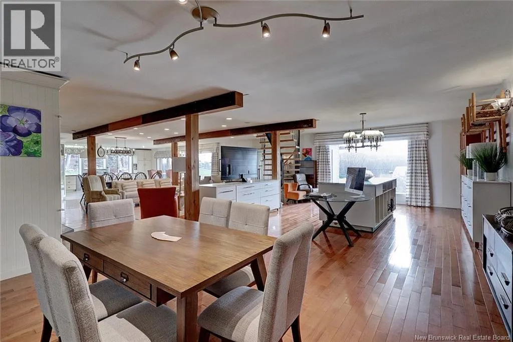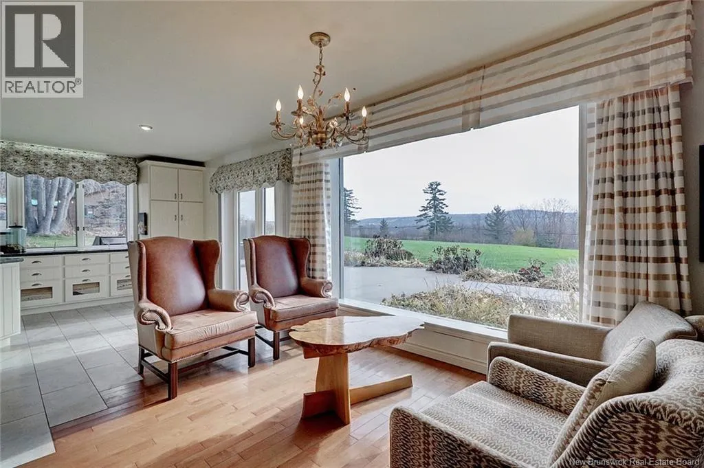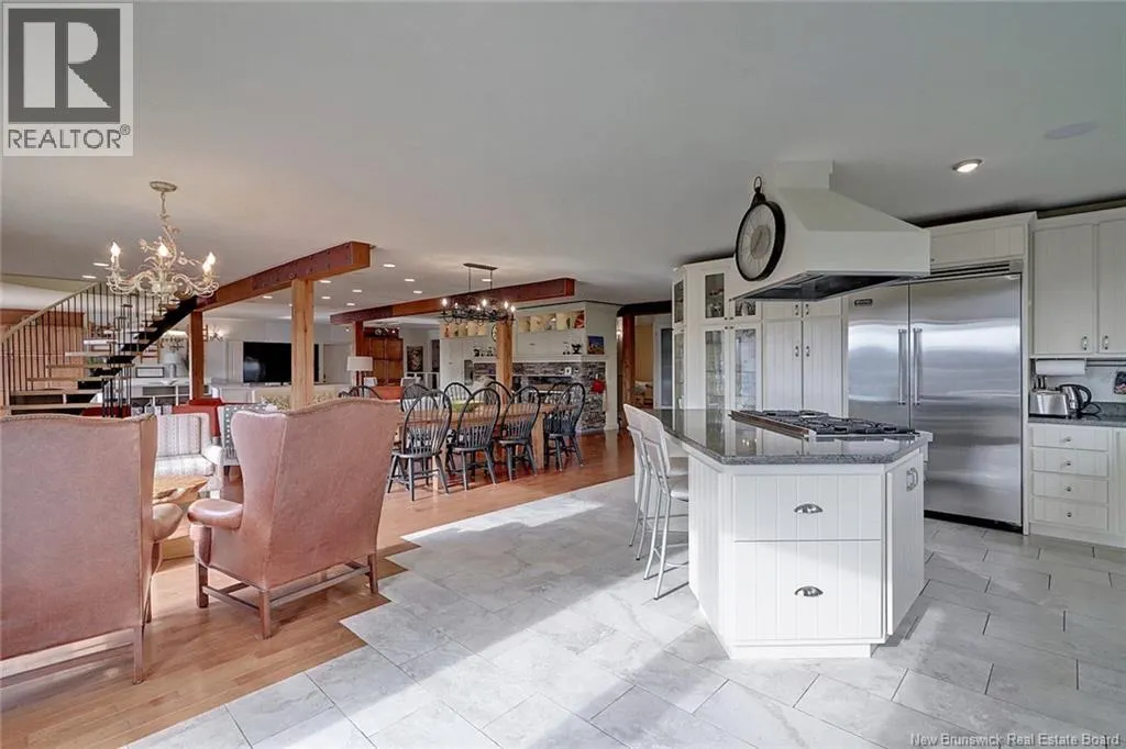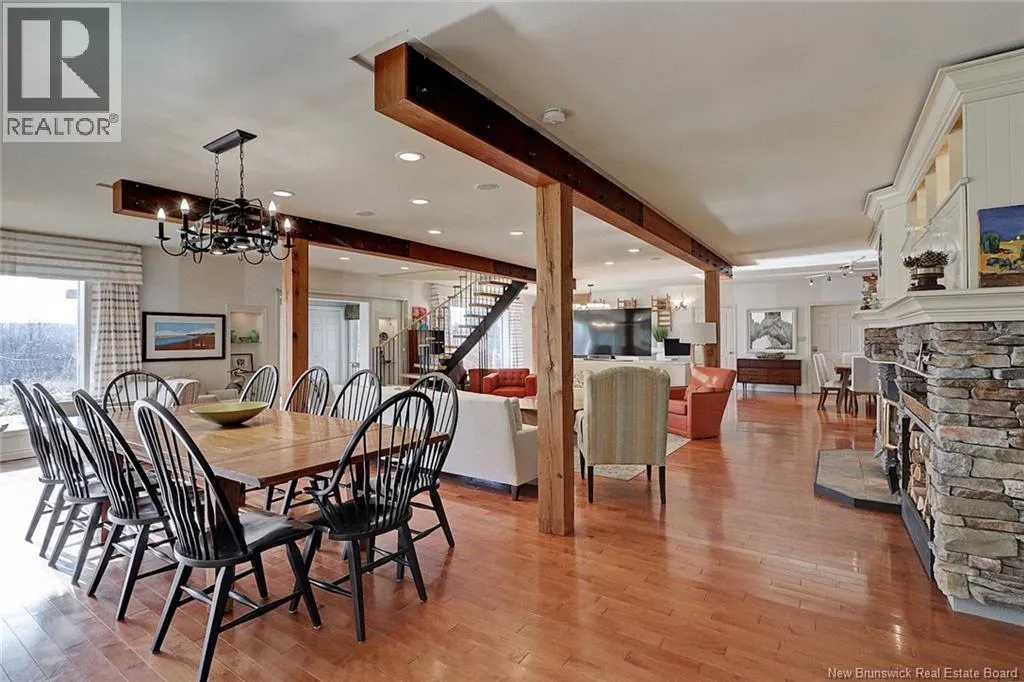 Fredericton North Route 105 from Fredericton West to Douglas, past Currie Mountain on right. An elegant custom designed home with views of the Saint John River is embraced by this 1.25 acre property: mature trees, meticulously sculptured landscaping & lush perennial gardens. The foyer invites you into a stunning open concept home with center core post & beam structure framing the beautiful 17 x 8.5 custom built display cabinet & full back library. Second story windows filter through the open spine staircase enjoying beautiful southern exposure throughout the day. A chefs dream kitchen surrounded by windows, custom cabinets, a walk-in pantry. The 48 combination full length fridge & freezer, a 4 rangehood, complete with granite counters, a 4 wide propane stove with 6 burners, a grill and 2 ovens. This home has 5 bedrooms, 4 powder rooms & 2 - 4 piece bathrooms with custom built tile, walk in showers, a large separate laundry room & lots of closet space. A 18x 9.5 home office with its own private entrance from outside & a door into the main house completes the main floor. The Master Suite, dressing room, huge walk-in closet, 2nd laundry room & 4 piece bath embrace 2/3 of the 1300 square foot 2nd level along with an additional living space & a kitchen! A 1,560 square foot 2 level detached garage top floor level of garage fully completed with vinyl click flooring & amazing studio space on the second level also with beautiful views of the Saint John River valley. It also has an electric car charger in the garage. This property has so much to offer! (id:27476)