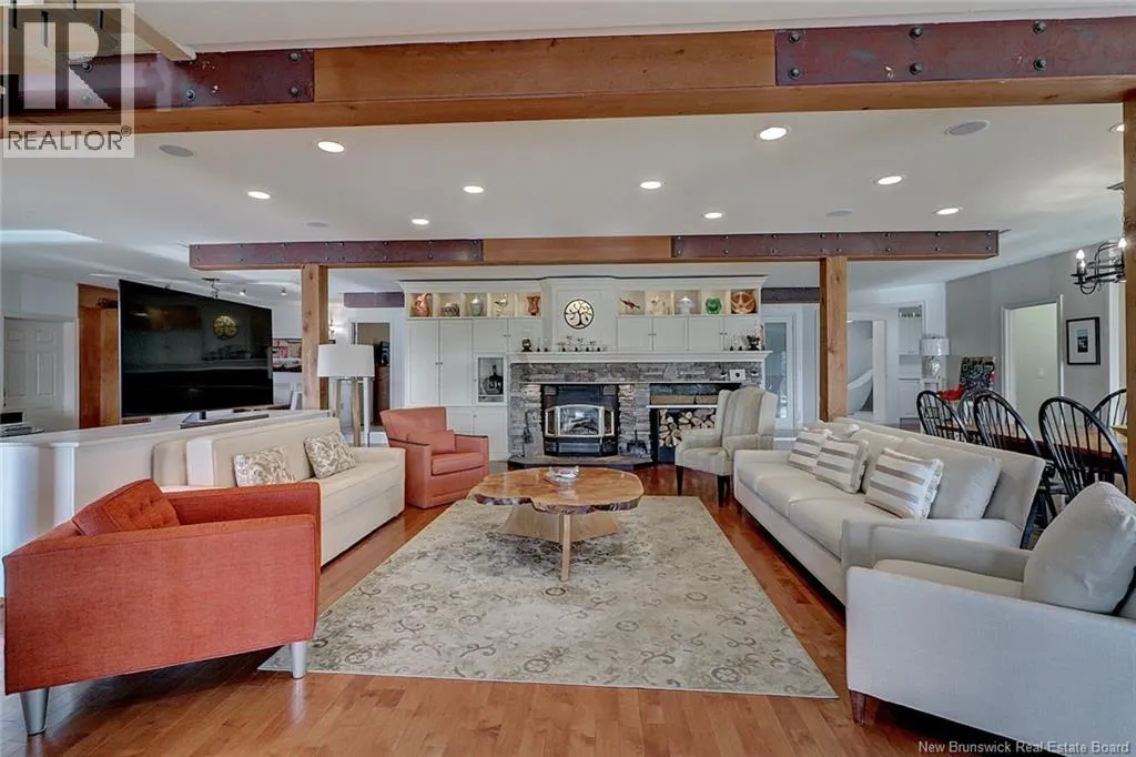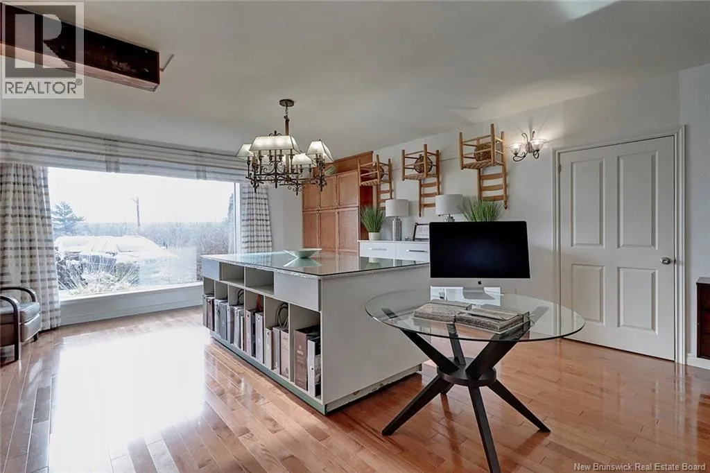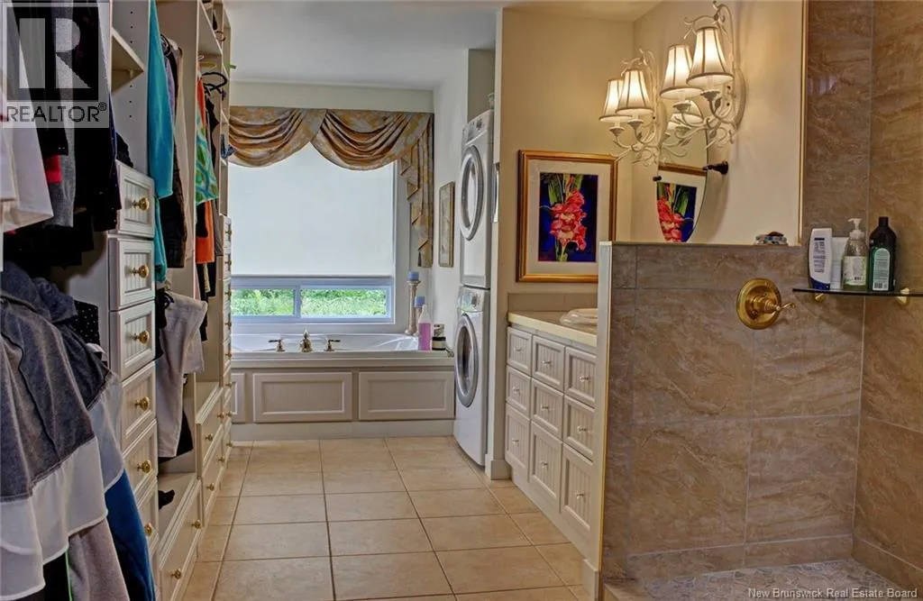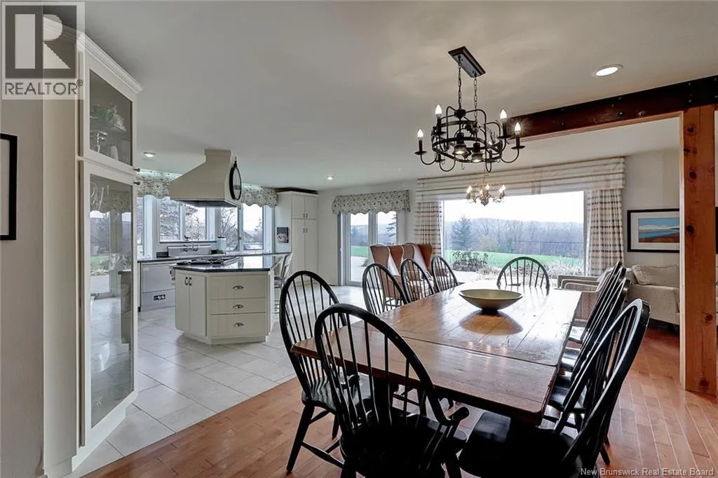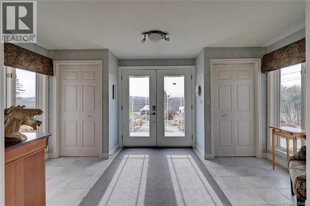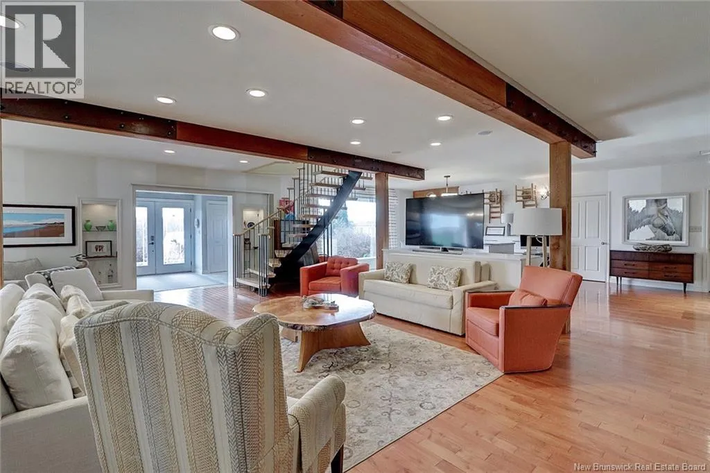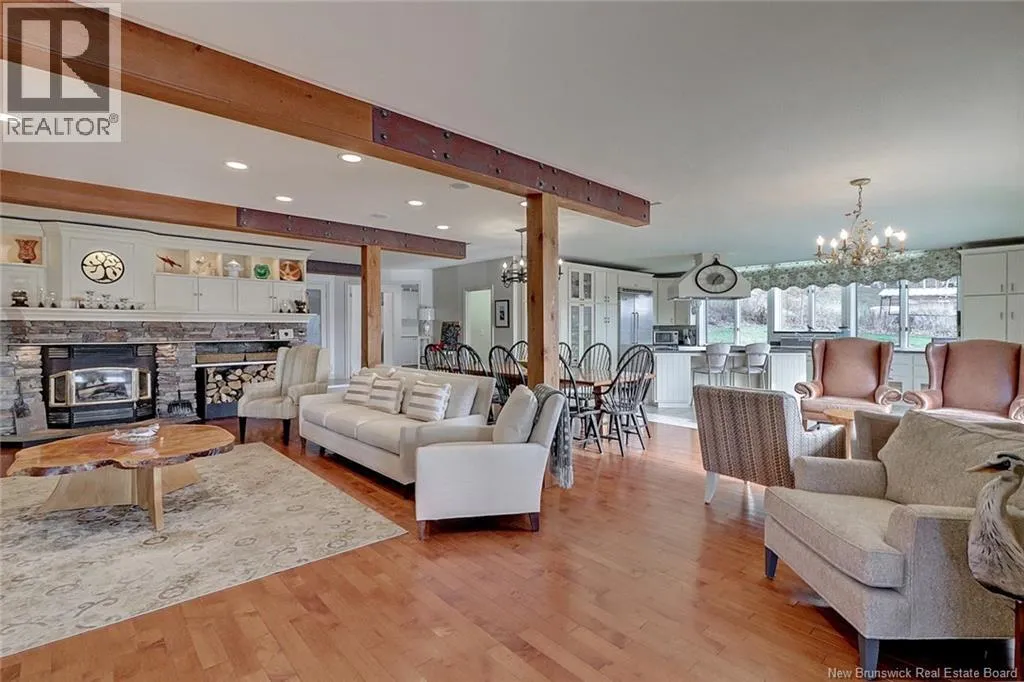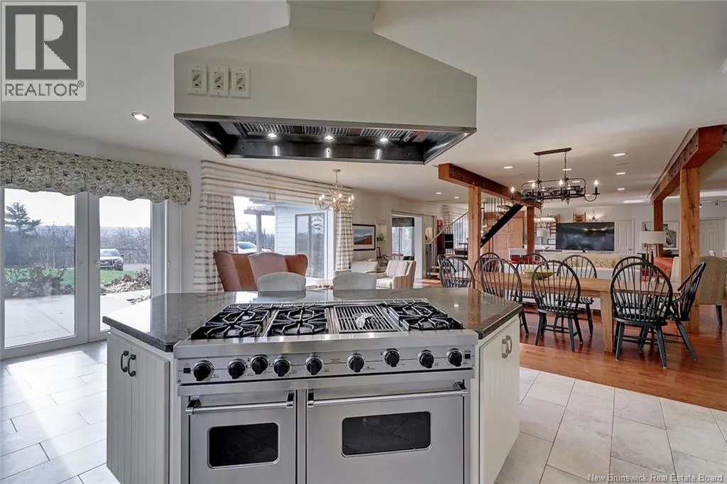 Fredericton North Route 105 from Fredericton West to Douglas, past Currie Mountain on right. An elegant custom designed home with views of the Saint John River is embraced by this 1.25 acre property: mature trees, meticulously sculptured landscaping & lush perennial gardens. The foyer invites you into a stunning open concept home with center core post & beam structure framing the beautiful 17 x 8.5 custom built display cabinet & full back library. Second story windows filter through the open spine staircase enjoying beautiful southern exposure throughout the day. A chefs dream kitchen surrounded by windows, custom cabinets, a walk-in pantry. The 48 combination full length fridge & freezer, a 4 rangehood, complete with granite counters, a 4 wide propane stove with 6 burners, a grill and 2 ovens. This home has 5 bedrooms, 4 powder rooms & 2 - 4 piece bathrooms with custom built tile, walk in showers, a large separate laundry room & lots of closet space. A 18x 9.5 home office with its own private entrance from outside & a door into the main house completes the main floor. The Master Suite, dressing room, huge walk-in closet, 2nd laundry room & 4 piece bath embrace 2/3 of the 1300 square foot 2nd level along with an additional living space & a kitchen! A 1,560 square foot 2 level detached garage top floor level of garage fully completed with vinyl click flooring & amazing studio space on the second level also with beautiful views of the Saint John River valley. It also has an electric car charger in the garage. This property has so much to offer! (id:27476)