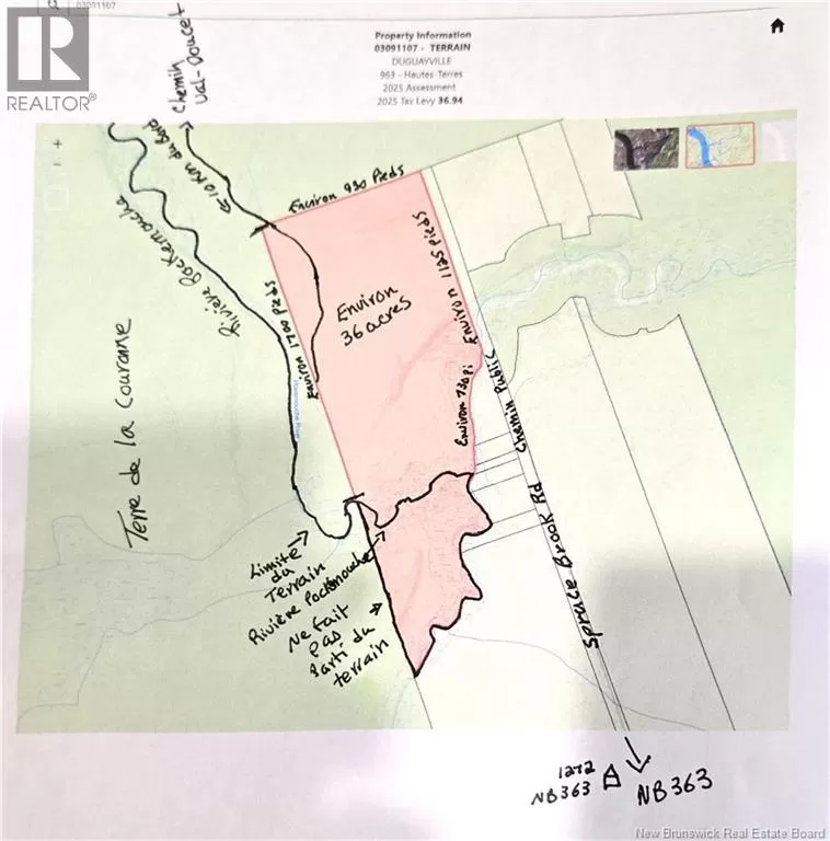 There are two ways to reach the property. The first option is to take NB-363 in Duguayville, at the corner of the house located at 1272 NB-363 and Bruce-Brooke Road. This is a public road that leads directly to the property. The second option is also through Duguayville, which provides another possible entrance to the property. Discover this unique 36-acre property, a true paradise for nature lovers! Bordered by the beautiful Pokemouche River for about 930 feet, with a depth ranging between 1700 and 1850 feet, it is the last lot before Crown lands, ensuring privacy and tranquility. On the property, there is an old well with a traditional system as well as an unusable former camp, giving you the opportunity to build your own retreat in the heart of nature. Two access points lead to the property: from Hachéville via NB-363 and Spruce Brook Road (at the corner of 1272 NB-363), where a path allows you to cross a small 15 to 20-foot section of the river; or from Val-Doucet Road, driving about 10 km to the site of the old camp. Access is currently by ATV, snowmobile, or a suitable truck, but with some improvements, it could be made accessible by car. However, the seller never intended to make it car-accessible, preferring to enjoy the peace and quiet ensured by limited access. Ideal for trout fishing, hunting, ATV or snowmobile adventures, or simply disconnecting and recharging in the forest, this property offers exceptional potential to build a cabin or off-grid camp with solar panels and enjoy a life in harmony with nature. (id:27476)