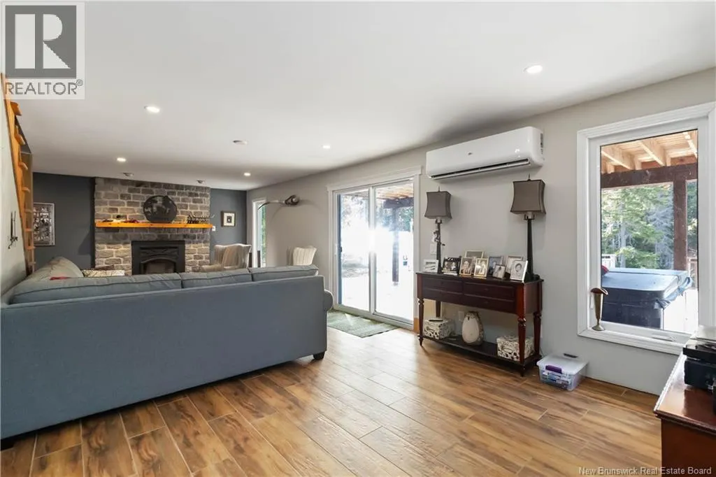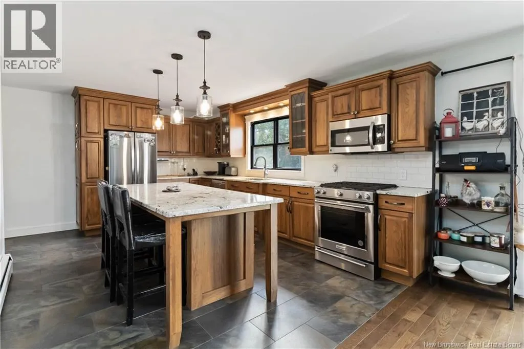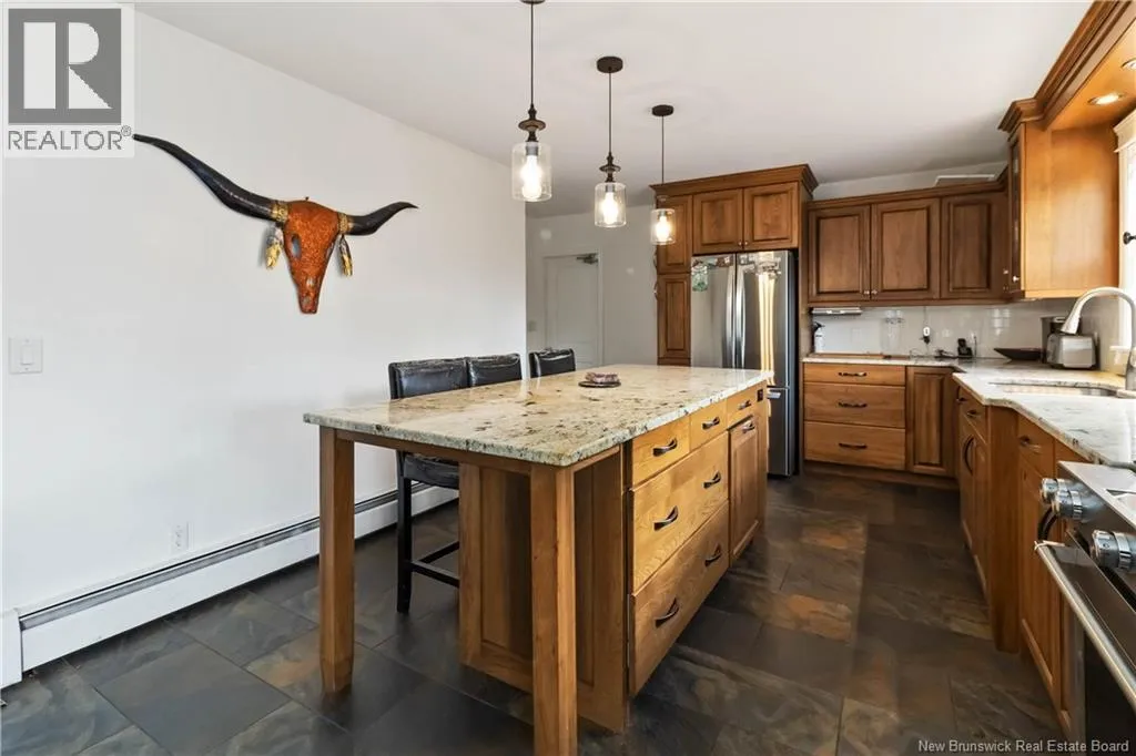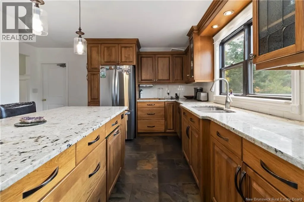 From Petitcodiac follow route 905 to route 895 Parkindale road Elegant Lakeview Home with Expansive Living Spaces. Arrive in style as you pass through fenced frontage and stately stone columns and picket fence that frame the paved driveway leading to this spacious 3,360 sq. ft. home (28 ft x 60 ft). This property sits on a gently sloping lot that flows down to a serene brook-fed lake. With 1.8 acres of land, the property feels even larger thanks to wide side yards, & peaceful lake view. Inside, the single-car garage entry brings you into a practical space with laundry and a walk-in pantry, which seamlessly connects to the heart of the homea custom-built hickory kitchen. The kitchen features a massive 40 x 90 island with seating for four, white granite countertops, and excellent storage, making it both stylish and functional. The spacious dining and living rooms provide the perfect setting for entertaining or hosting large family gatherings. From here, step out through a 6 ft patio door onto the deck, complete with glass railings and a private view of the lake. The bright family room downstairs features tall windows, space for a pool table or bunkroom, and walk-out access. A high-efficiency wood-burning fireplace heats up to 2,500 sq. ft., creating a cozy retreat. (id:27476)
