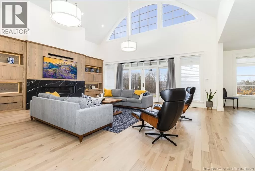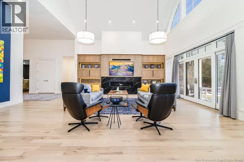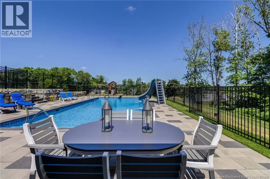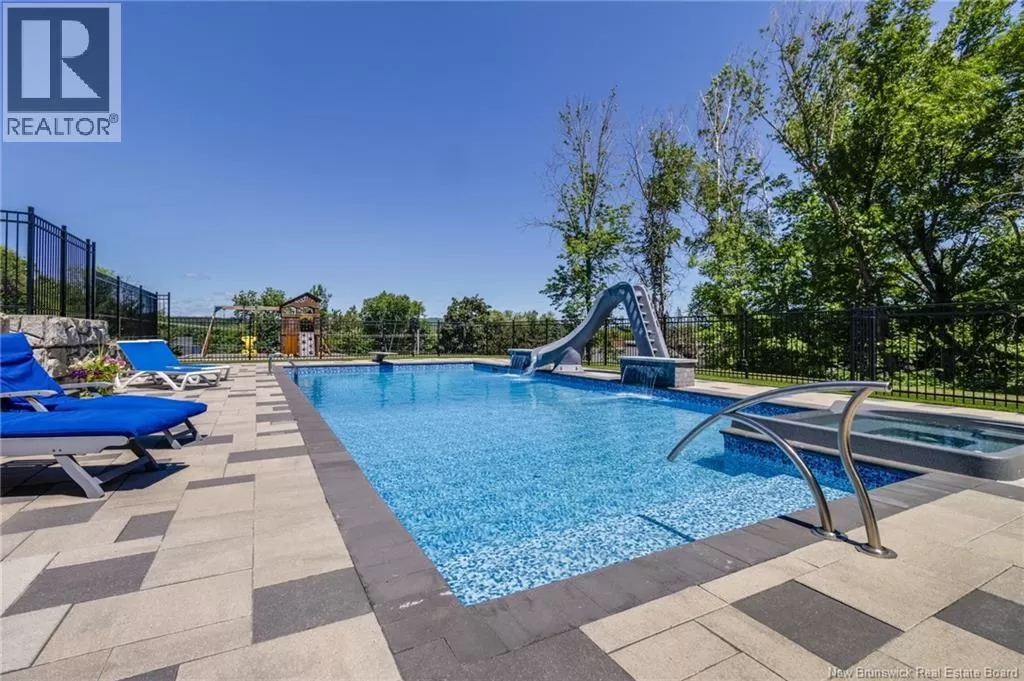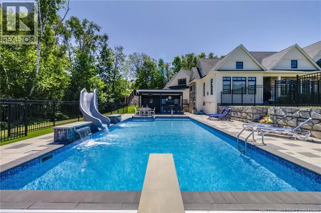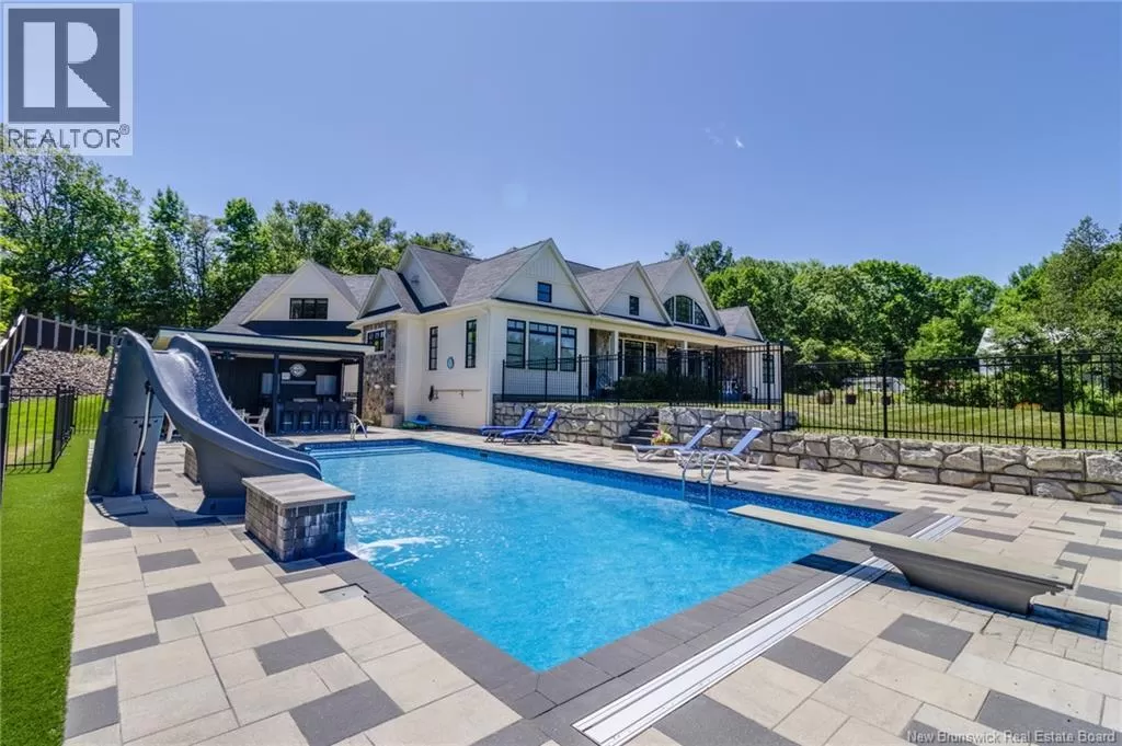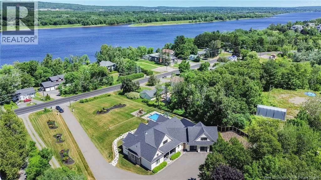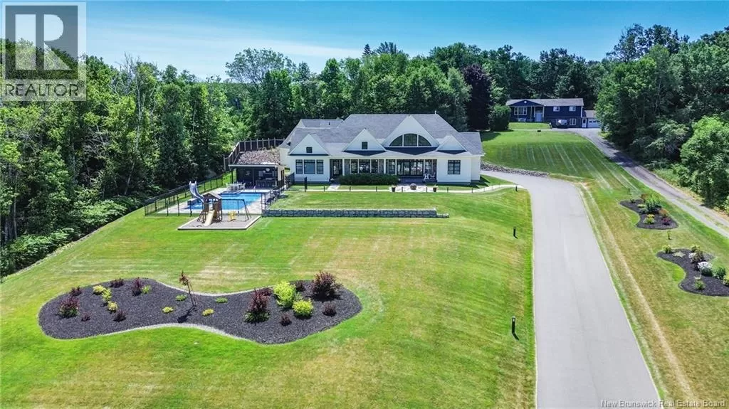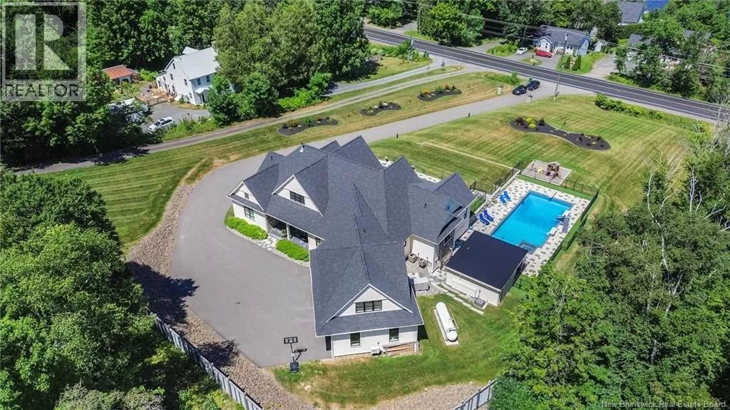 Woodstock Rd just past Garden Creek School on the left side An exquisitely crafted, custom-built home situated on 1.5 acres in Fredericton South. No detail has been spared in the conception and construction of this remarkable estate-style property with over 5,300 sqft of finished space. The open-concept main living area features a spacious living room adorned with bespoke built-in cabinetry,23 foot ceilings, gas fireplace, and patio doors that lead to an outdoor sitting area offering serene river and overland views. The gourmet kitchen showcases a generous island, a eight-burner gas stove, dual dishwashers and a butlers pantry. The primary suite is a sanctuary of luxury featuring cathedral ceilings, a sprawling 15x18 walk-in closet and a spa-inspired bathroom featuring dual vanities, a custom-tiled shower and heated floors. At the opposite end of the home are two additional well-appointed bedrooms each with its own ensuite bath. A versatile fourth bedroom, currently utilized as a media room, and a large office complete this level. Staircase accessed from the mudroom, leads to the gym area and ½ bath located above the oversized 3 car garage. The lower level is partially finished including a 4th full bath, a spacious family room, and a children's secret room featuring a ball pit and climbing ladder. The outdoor amenities are equally impressive, with an exquisite in-ground pool, an expansive pool house complete with a bar and bathroom, and even an artificial turf putting green the perfect complement to this stunning estate. (id:27476)