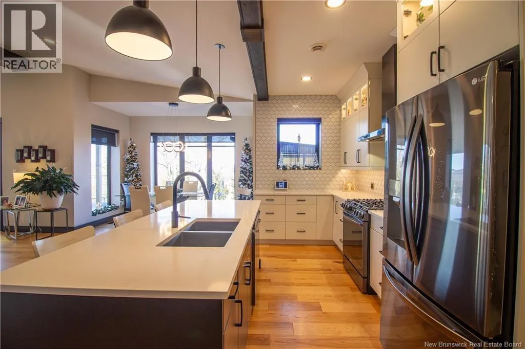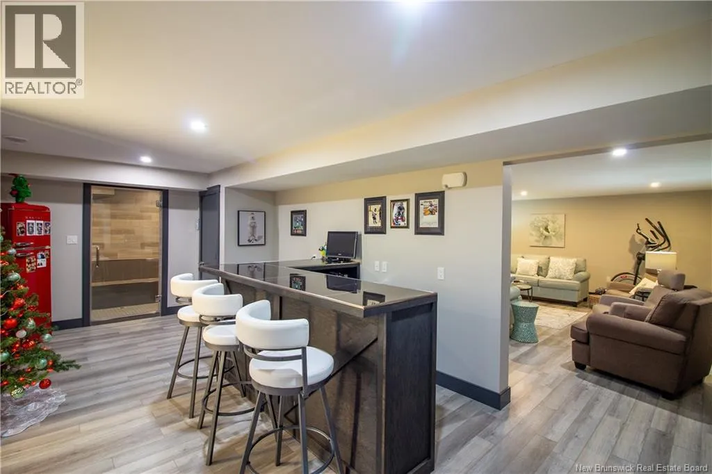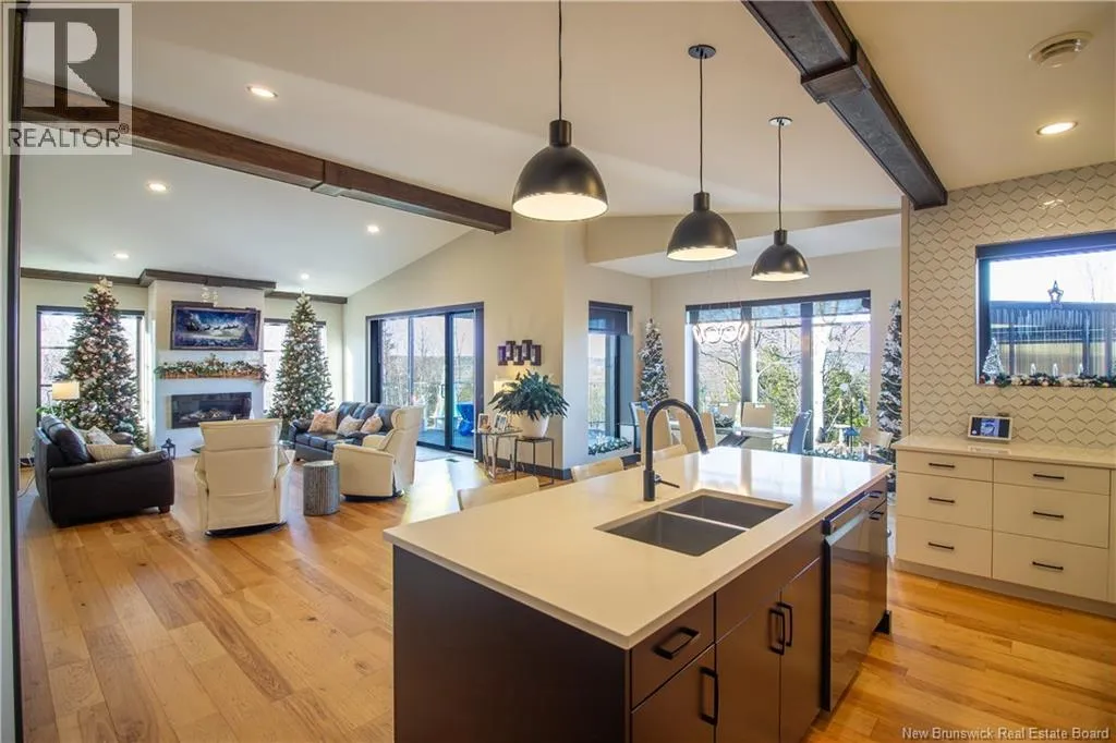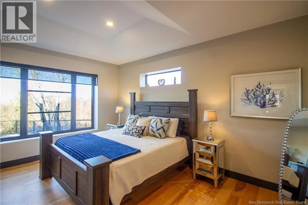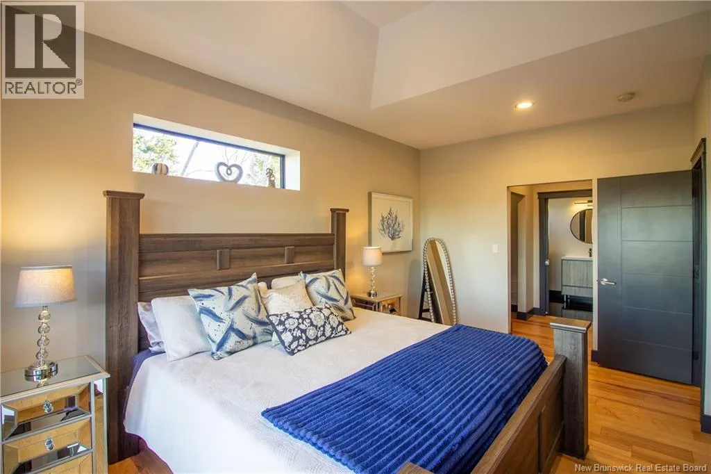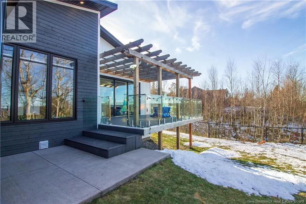 William Bell Dr to Robert Ross Blvd Welcome to 11 Robert Ross, this exceptional home is located 10 minutes from Quispamsis and walking distance to the new Summit Centre. Contemporary design and tasteful finishes, no expense spared. Stamped concrete covered fron veranda. Off the foyer you will find 2 bedrooms with large windows and 4 pc bath with laundry. Large living room with vaulted ceilings, fireplace, patio door to back deck (Composite) with pergola and glass rails looking over Darlings Lake and stunning sunsets. Open concept with stunning kitchen with quartz counters, cabinet lighting, walk in pantry with microwave and cabinetry, island, gas range and bright dining room. Master bedroom features a tray ceiling, pot lights, picture window, walk in closet and 4 pc ensuite with pocket door and custom dual head shower. Attached heated garage boasts epoxy floor, glass door, and a roll up screen door to enjoy the fresh air and add to your living space. Tile and engineered hardwood floors throughout main level. Down features a bar with sink, large sauna, family room, 2 bedrooms and a non-conforming bedroom. 4 pc bath, storage mechanical room, 2nd mechanical room with storage, ducted heat pump and generator panel. Fully finished basement with pot lights throughout, ICF foundation to the roof. Detached 2nd garage, fenced yard with lighting, concrete patio with enclosed hot tub, soffet lights, metal roof, central vac, and much more. Call today. (id:27476)