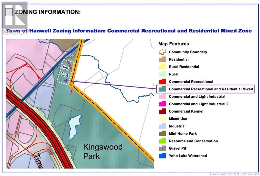 Unique development opportunity -- 3.78 acre commercial site located in the upscale Kingswood Resort neighborhood! Ideal corner lot site on Kingswood Way -- a short walk to the Kingswood 9 & 18 hole golf courses, Sam Sneads Oak Grill & Tavern, the Kingswood Entertainment Center, and the Radisson Kingswood Hotel & Suites. The property is currently zoned as CRRM (Commercial Recreation & Residential Mixed) under the Hanwell Zoning Bylaw. While this zoning classification permits a wide variety of possible development options, in order to preserve the beauty and charm of this well established neighborhood and to ensure compatibility with the other businesses in the area, the seller reserves the right to approve the Buyer's intended business use and their related site and building development plans as a condition of any sale. Any property sale shall also be subject the execution of various related agreements, including a Non-Compete, a Right of Way Agreement, a Site Plan Agreement (which specifies that the buyer shall be responsible for installing underground electrical service, well and septic services, and various other terms), and Restrictive Covenants -- all of which are designed to protect the interests of all parties and to ensure neighborhood compatibility. The attached Subdivision Plan contains additional info re. the boundaries and dimensions of this prime1.53 Hectare (3.78 acre) site. Don't delay, contact your REALTOR® for additional information today! (id:27476)
