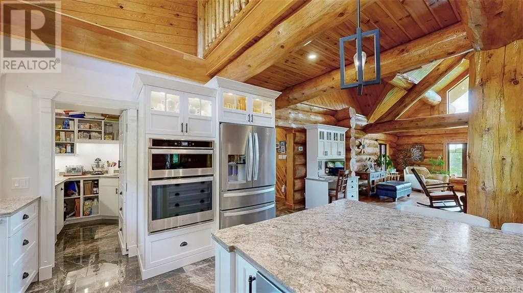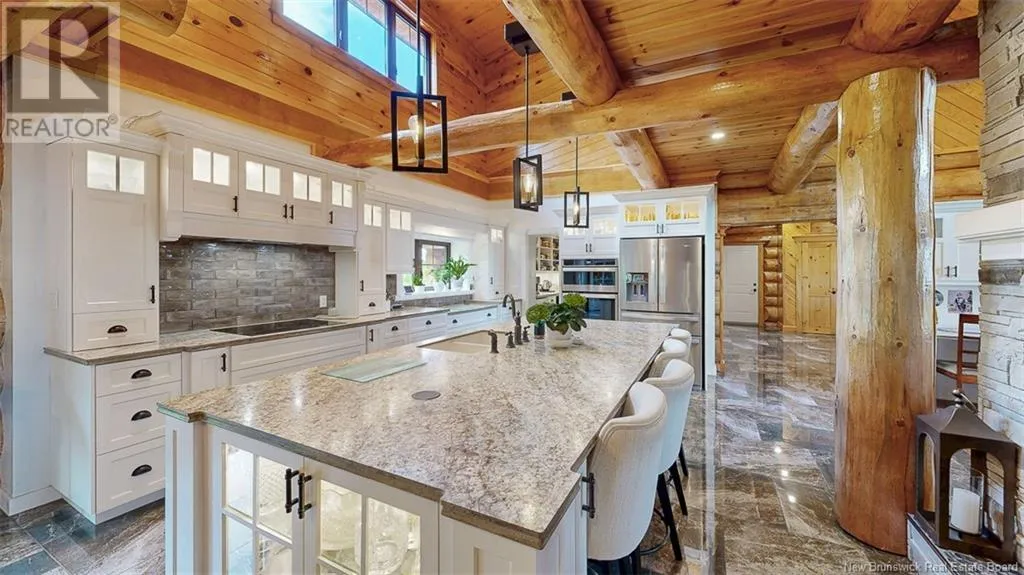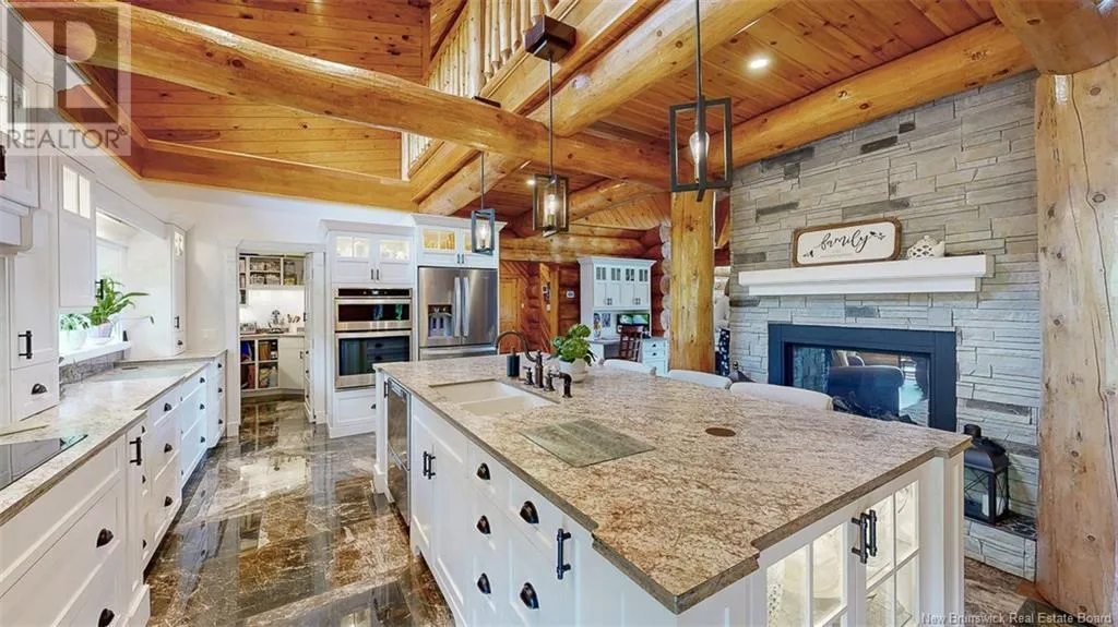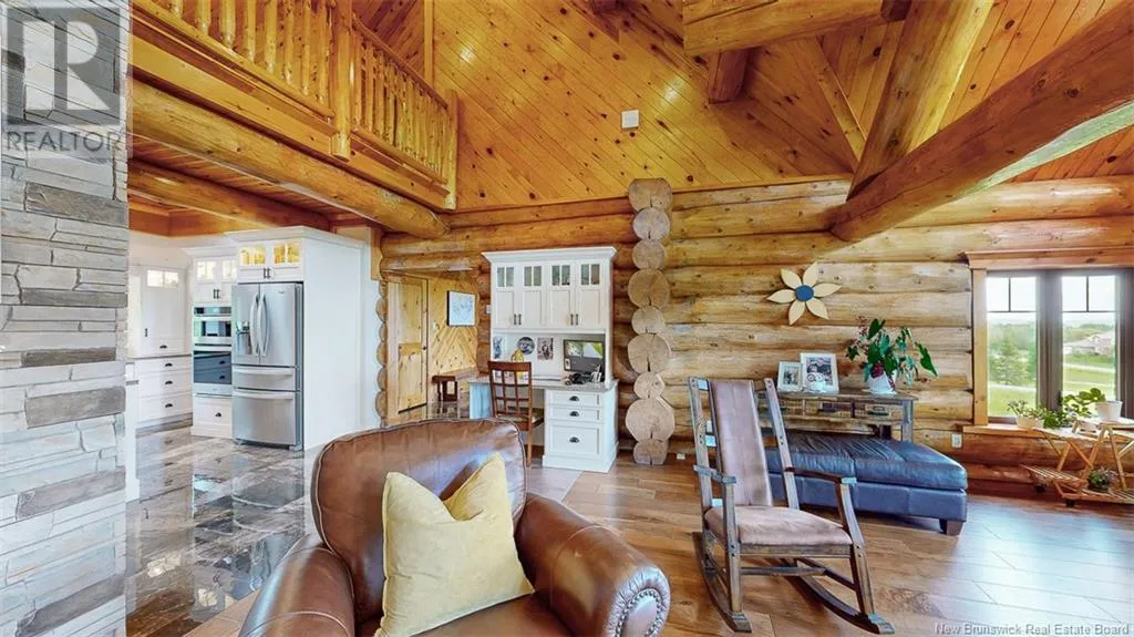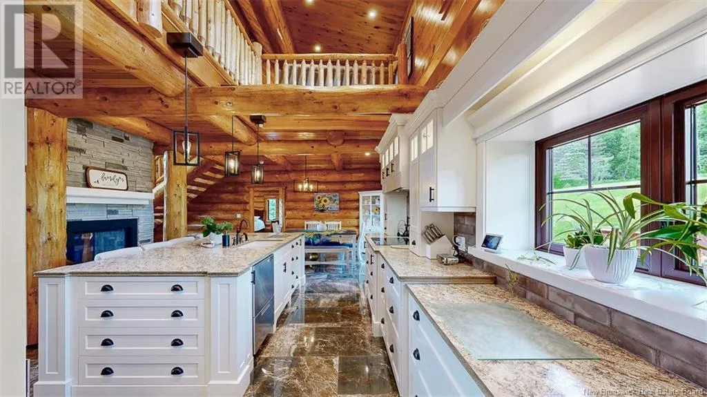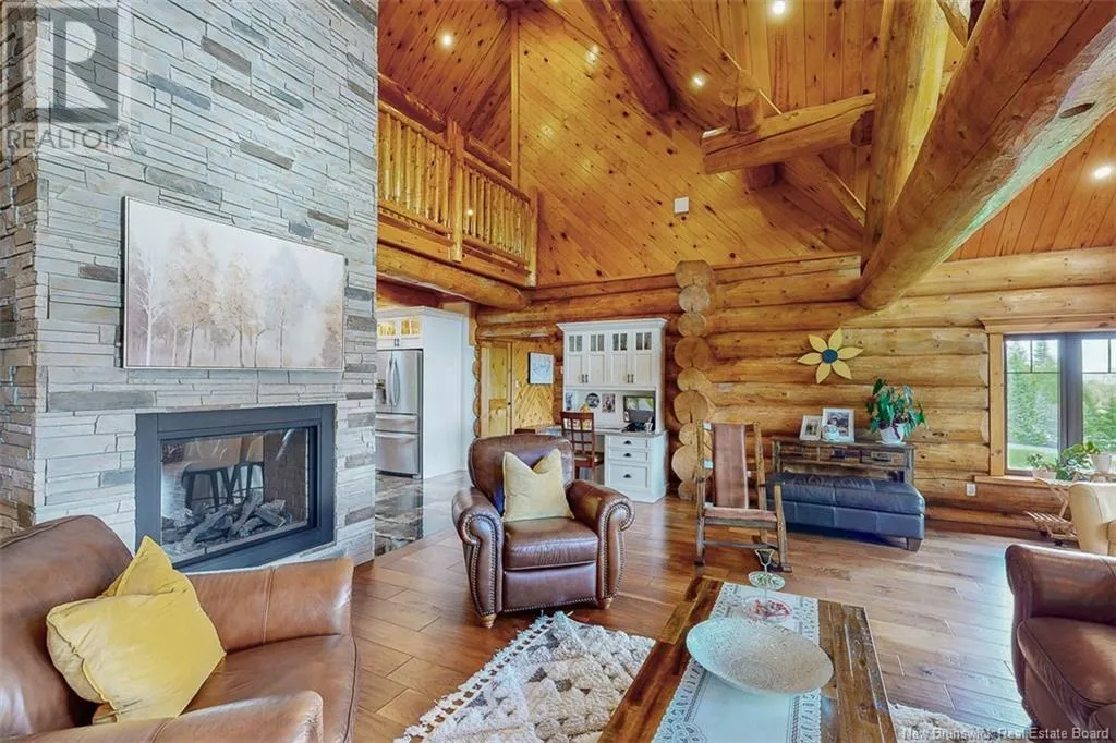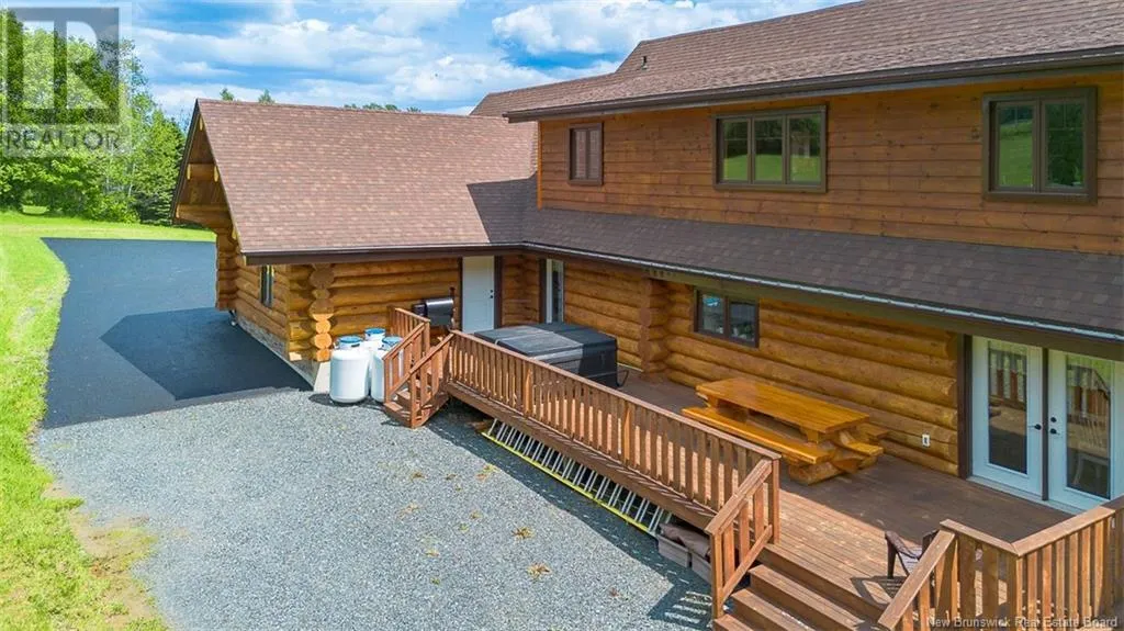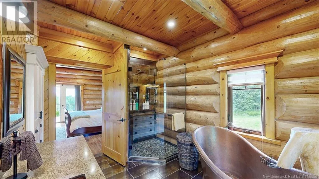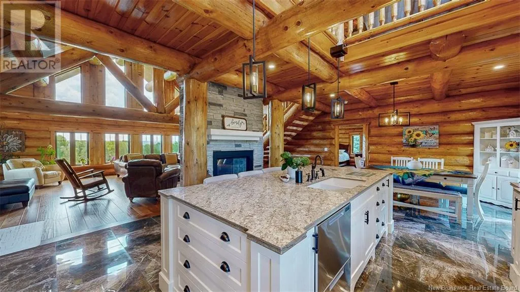 Just 2 minutes from Woodstock and the TCH, this stunning 3.3-acre property offers the perfect blend of rustic charm and luxury living. The custom log home features a massive great room with soaring 22' ceilings and 2 sided propane fireplace, open to a custom chefs kitchen and dining area. A hidden door leads to a butlers pantry, while the main level also includes a spacious mudroom, laundry, and a showstopping primary suite with a handmade copper tub and unique tile shower. Step outside to enjoy two covered porches and a large back deck with a hot tub. Upstairs boasts 3 large bedrooms, full bath, office, den, and a striking catwalk overlooking the main living space. A 3-car fully finished garage with epoxy floor, full basement with overhead door, ducted heat pump, and standby generator complete this one-of-a-kind dream home. (id:27476)