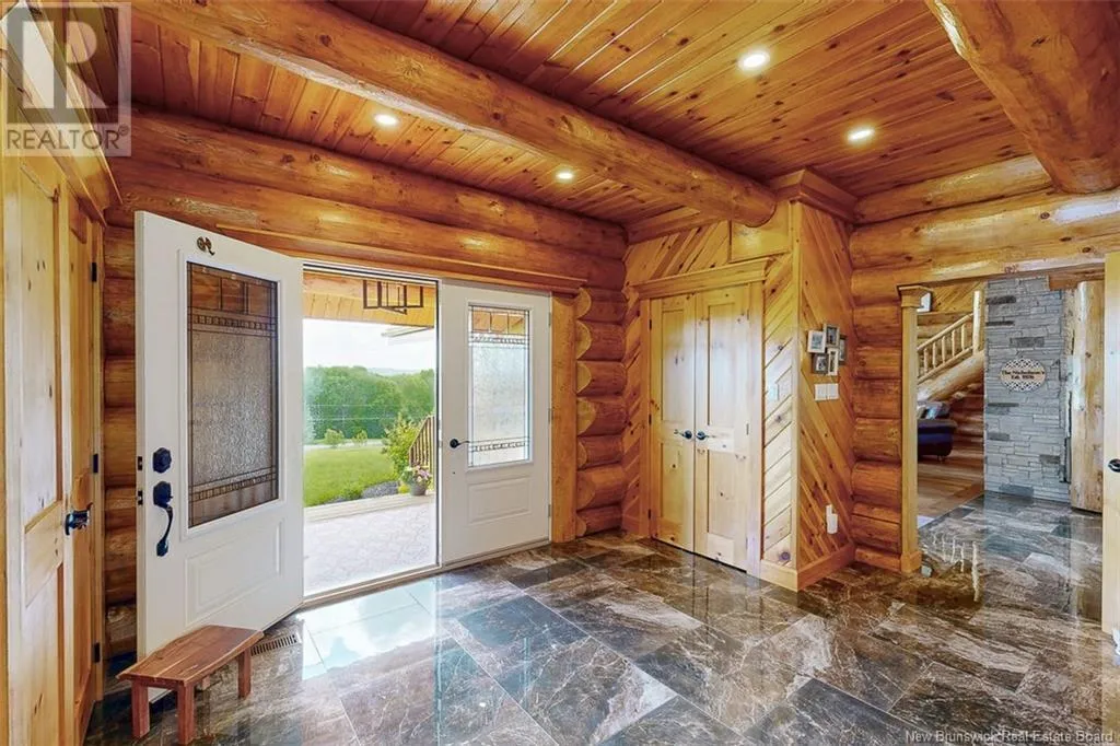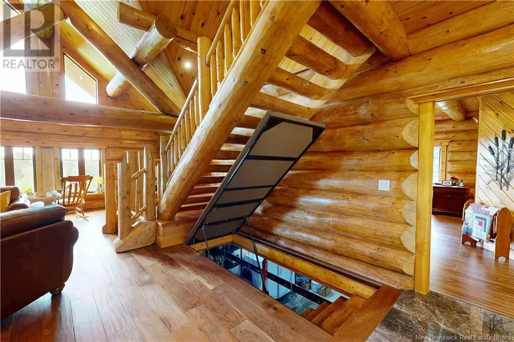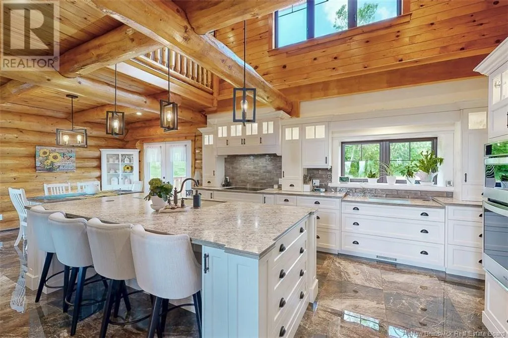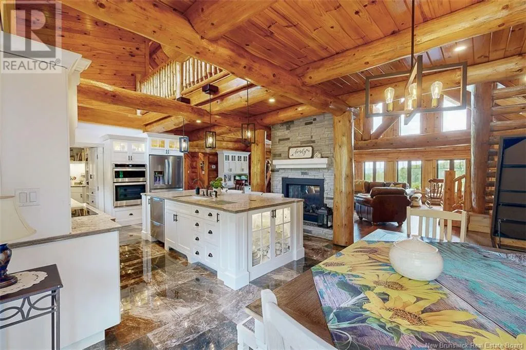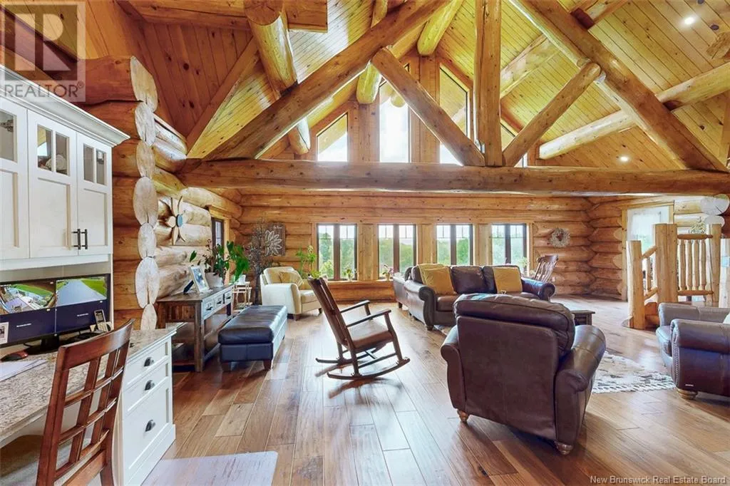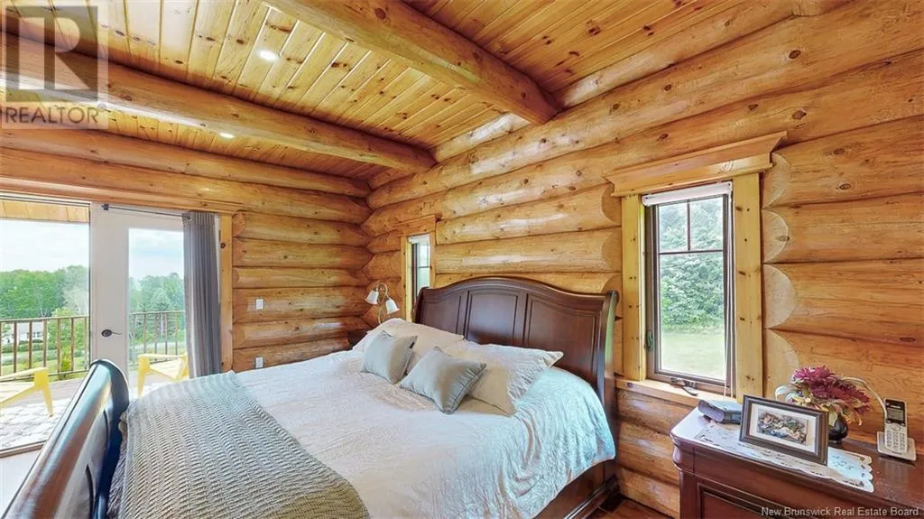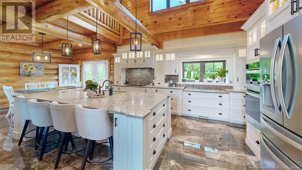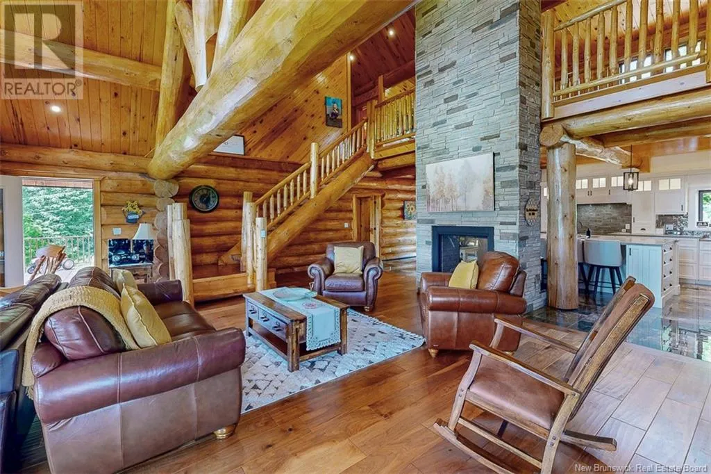 Just 2 minutes from Woodstock and the TCH, this stunning 3.3-acre property offers the perfect blend of rustic charm and luxury living. The custom log home features a massive great room with soaring 22' ceilings and 2 sided propane fireplace, open to a custom chefs kitchen and dining area. A hidden door leads to a butlers pantry, while the main level also includes a spacious mudroom, laundry, and a showstopping primary suite with a handmade copper tub and unique tile shower. Step outside to enjoy two covered porches and a large back deck with a hot tub. Upstairs boasts 3 large bedrooms, full bath, office, den, and a striking catwalk overlooking the main living space. A 3-car fully finished garage with epoxy floor, full basement with overhead door, ducted heat pump, and standby generator complete this one-of-a-kind dream home. (id:27476)