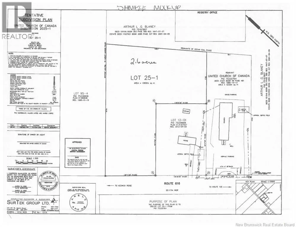 Through Douglas, right to Route 616 beside the United Church of Canada, next to civic #503 This beautiful 2.6 acre piece of land offers approximately 54 meters of frontage and is located right beside the United Church of Canada. The property features an old fence across the back, providing a charming, rustic feel. Much of the land is wooded, offering privacy and a natural setting perfect for those looking to build a serene getaway or a new home. There is a culvert in place at the north end of the lot. Two ribbons are in place at the front of the property marking the lines. PID to be separated from the Parent PID at the Sellers expense and assigned prior to closing. Civic #505 to be assigned at that time. View anytime! (id:27476)