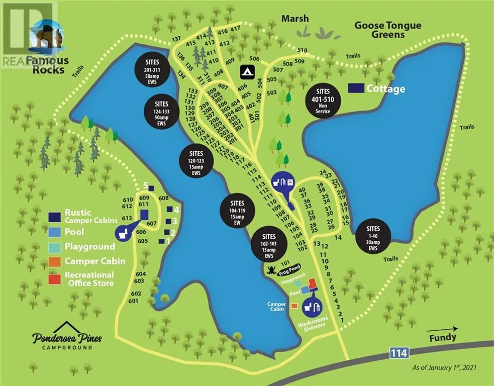 If heading from Moncton, property is just after Hopewell Rocks on the water side Lakefront campground has been in business for over 60 years. Located on major tourist route, a one minute drive to World Famous Hopewell Rocks, and within 30 minutes to Fundy National Park, Cape Enrage, Marys Point, beaches, and shops. Property features 140 camping sites including 30 and 50 amp serviced RV sites, a private cottage, 6 cabins, an inground pool, store, coin operated laundry facilities, 2-3 bedroom apartment, office, washrooms, playground, storage buildings, canoes, kayaks, paddle boats, golf carts and more. There is a direct walking trail from campground to Hopewell Rocks and access to shoreline trail system. Guests have use of private lake area and a stunning view of the Bay of Fundy. Business has numerous repeat clients and repeat tour groups. Bookings already in place for the 2026 season! Property sits on over 50 acres with water frontage and mature trees. (id:27476)
