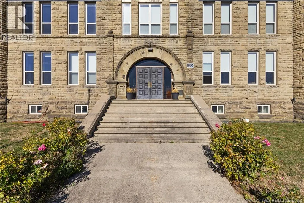 Miramichi City to 599 King George Hwy Welcome to the Old Court House, a landmark property in the heart of Miramichi City. Designed by Wolfville, Nova Scotia architect Leslie R. Fairn and constructed in 1912-1913 of locally quarried sandstone, this Romanesque Revival masterpiece has been lovingly restored while preserving its historic integrity and unmistakable charm. The property now features 8 residential apartments (2 two-bedroom apartments and 6 one-bedroom apartments, each with ductless splits for efficient heating and cooling; unheated/unlighted as well as a private storage room in the basement) along with 4 commercial units and 2 public washrooms (heat and lights included). An elevator provides modern convenience, and a comprehensive list of construction upgrades from 2018-2021 is available for review. There are 2 storage areas in the basement that could also be rented. The building showcases remarkable character-defining elements: its elevated placement with commanding views of the river and business district, circular towers with conical roofs and pinnacles, a steeply pitched roof, a dramatic terraced entrance, original prison and vault doors, restored mouldings, hardwood floors, and soaring ceilings that enhance the grandeur of the space. Steeped in history yet fully functional for today's needs, this is more than real estate, it is a rare opportunity to own a cornerstone of Miramichi's heritage, an iconic stone building where architecture, commerce, and community legacy meet. (id:27476)
