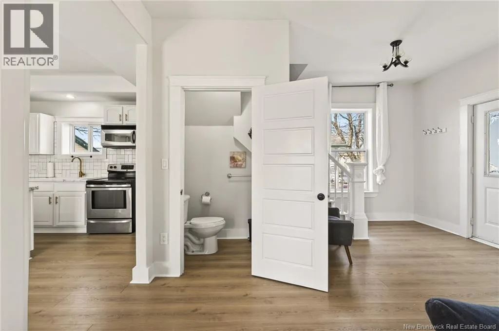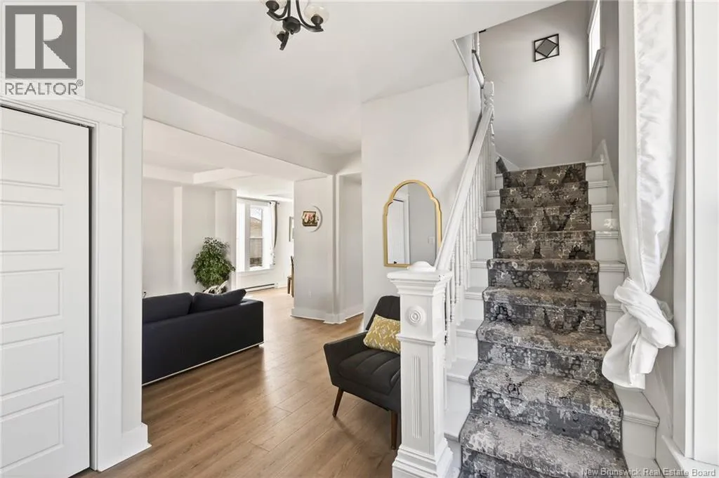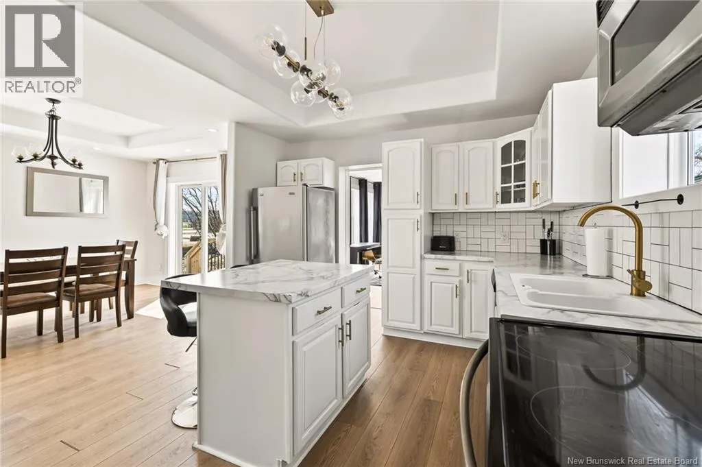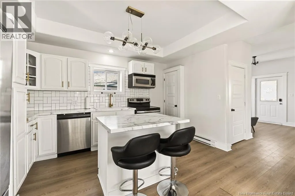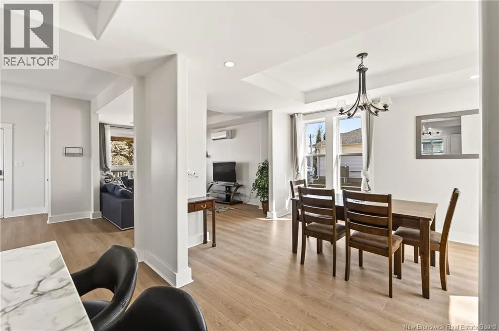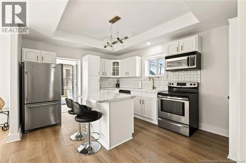From Moncton Hospital onto Connaught Ave, turn on your left on Lefurgey Ave. Also accessible from Mountain Rd. Heritage charm meets modern living in the heart of Moncton! This beautifully renovated 2-storey home sits steps from the Moncton Hospital and checks every box without compromise. From the moment you walk through the door, you're greeted by an open-concept main floor with soaring ceilings, fresh laminate flooring, and a layout that just flows. The kitchen is a showstopper. White cabinetry with gold hardware, marble-look countertops, subway tile backsplash, a centre island, and a statement bubble chandelier. The dining room opens directly onto a gorgeous deck, perfect for summer entertaining. Upstairs, the primary bathroom features freestanding soaker tub, glass shower, and a bold tropical feature wall that has to be seen to be believed. Large bedrooms throughout, hardwood floors on the upper level, and two mini-splits keep everyone comfortable year-round. Outside: paved driveway, a beautiful deck, and a large yard ready for whatever you've got planned. Oh and all furniture is negotiable. Move in and just live. (id:27476)