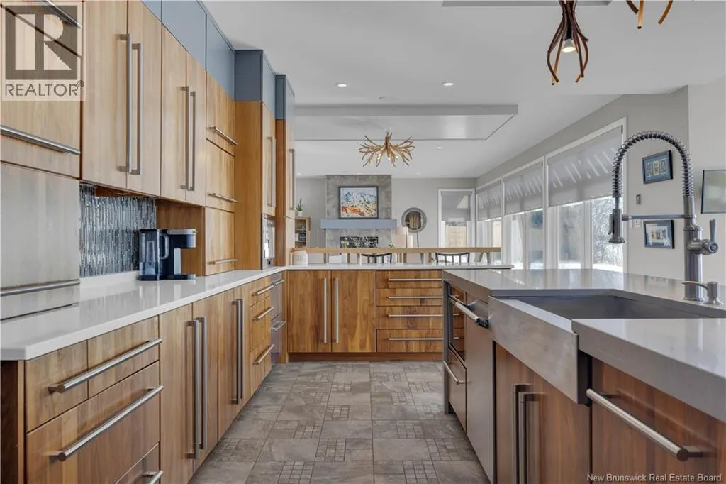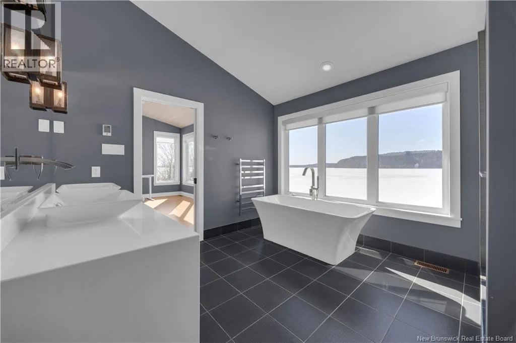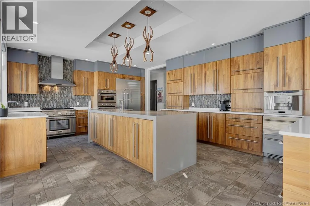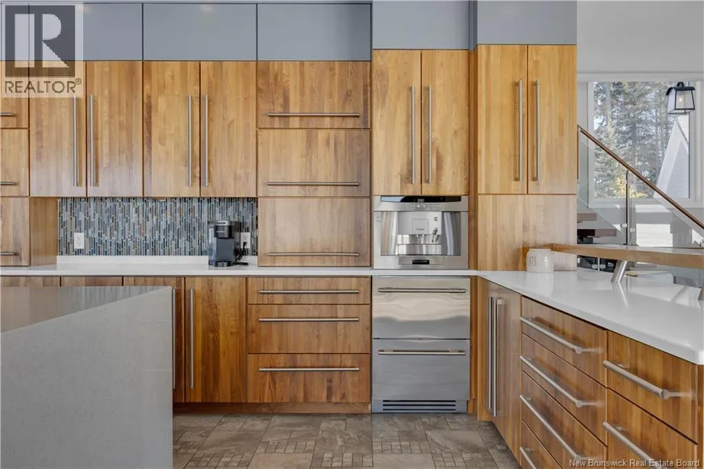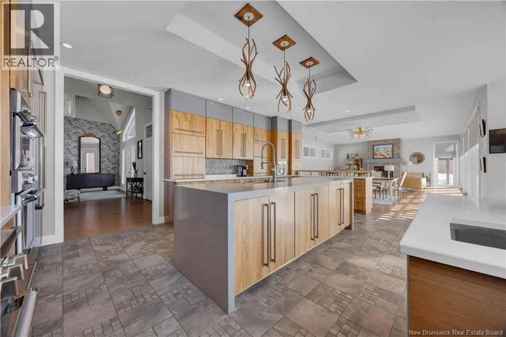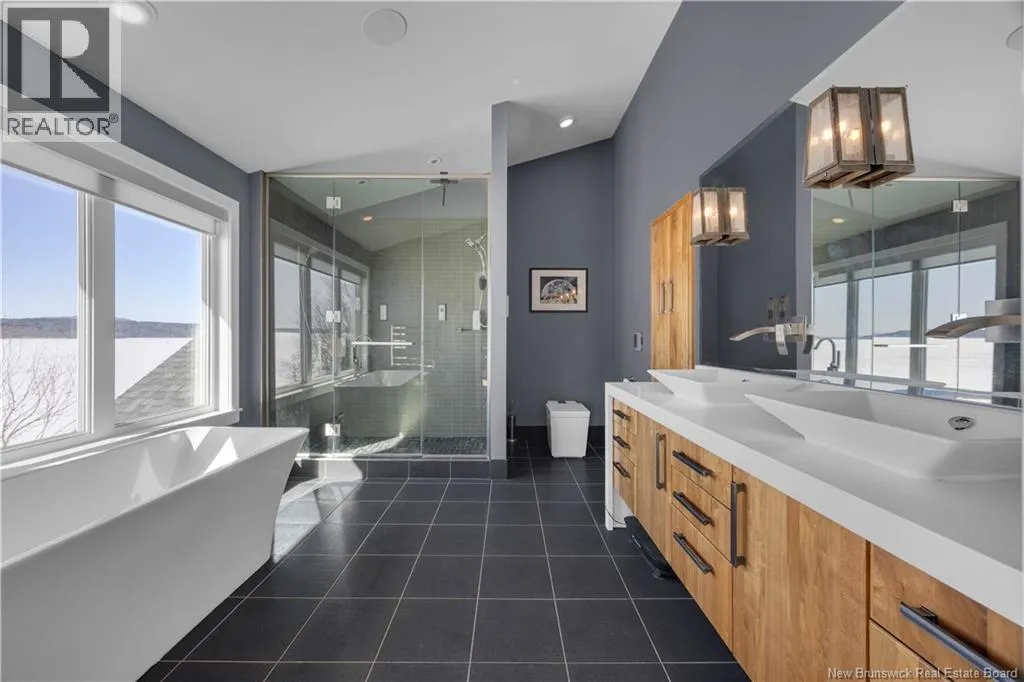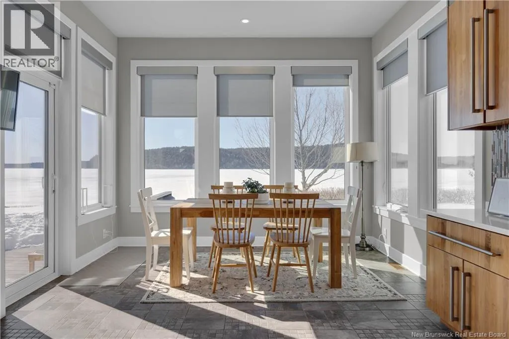 Gondola Point Road to River Road to Maliseet in Sagamore Point Prime Rothesay waterfront! Perched on 0.94 acres with approx 160 feet of frontage on the beautiful Kennebecasis River, this contemporary luxury home blends indoor elegance with stunning outdoor living. Expansive 10 ceilings, floor-to-ceiling windows, and glass walk-outs highlight the great room with wood burning fireplace, perfect for entertaining. Chef-inspired kitchen features walnut cabinetry, quartz waterfall island, Thermador appliances, espresso bar, and heated tile floors. Main floor office can double as 4th bedroom with full bath access. Upstairs, three oversized bedrooms all have ensuites, including a spa-like principal suite with propane fireplace, panoramic river views, and custom walk-in closet. Lofted family room with fireplace adds extra living space. Finished basement includes gym, rec room, and plenty of storage. Two geothermal heat pumps provide efficient heating and cooling. Outside, enjoy saltwater pool, composite decking, slate patios, sauna, outdoor pizza oven, and professionally landscaped private grounds. Oversized 3-car heated garage, paved driveway, and extra-wide walkway complete this exceptional riverfront retreat designed for casual elegance and entertaining. Make your waterfront dreams a reality in this unmatched beauty! (id:27476)
