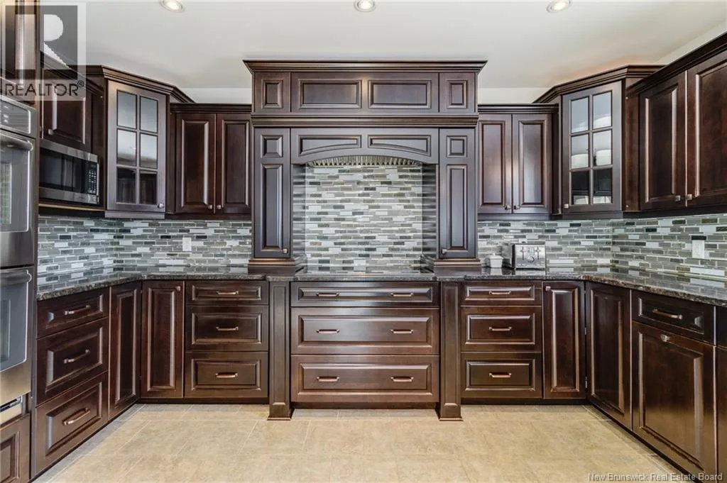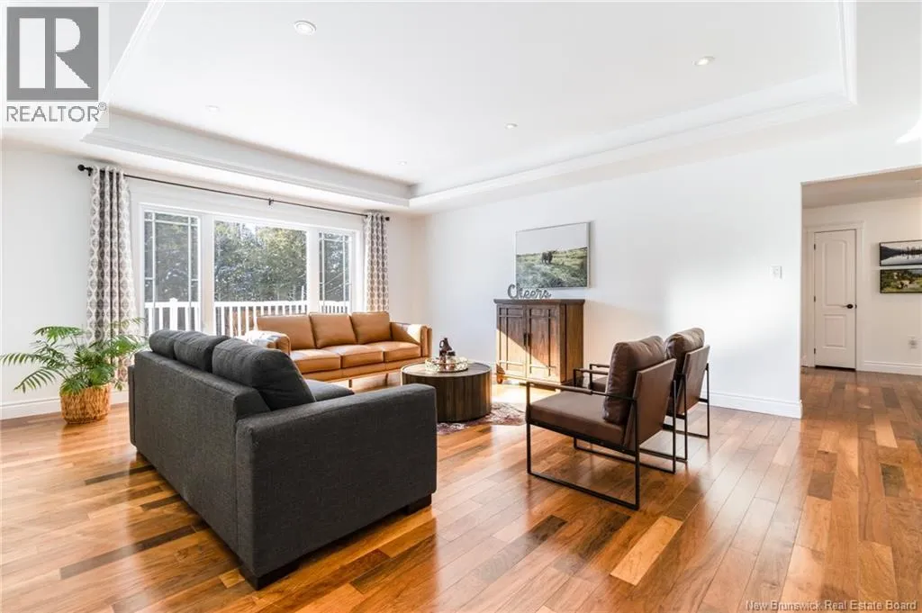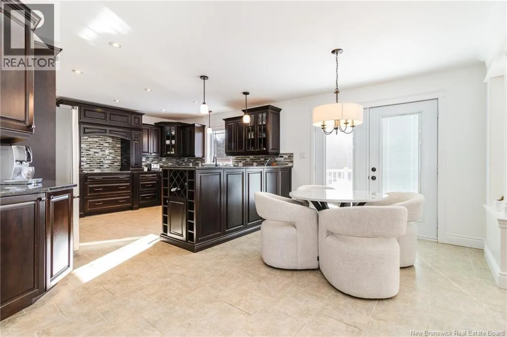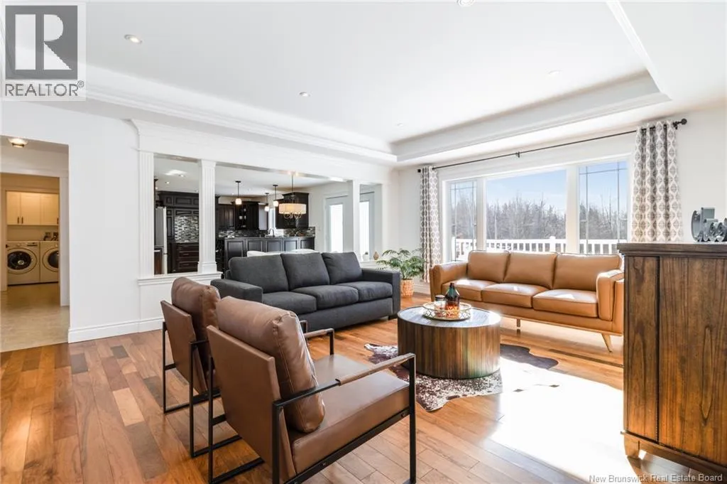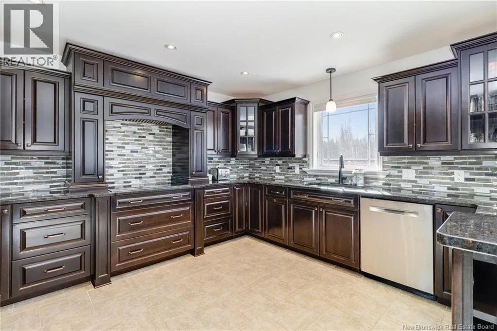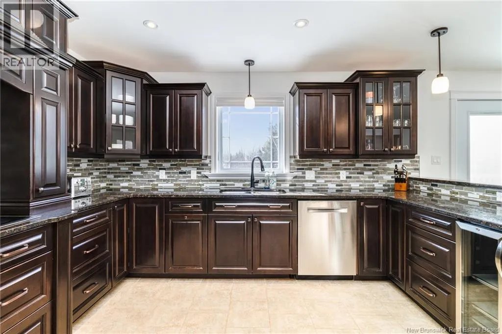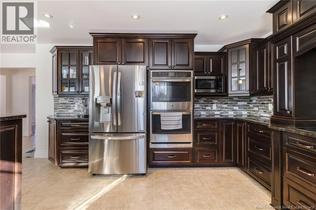 Route 655 to Olive Branch Rd, right onto Canaan Dr., left on Mt. Halak Ave, left onto Bethany Dr. Stunning 5-bedroom, 3-bath bungalow with an oversized double garage, ideally situated in Rusagonis just minutes from both Oromocto and Fredericton. Step inside to a large front foyer with marble floors. The bright living room features gleaming hardwood floors accented by elegant white columns. The chef-inspired kitchen offers granite countertops, rich dark cabinetry, double wall ovens, stainless steel appliances, and direct access to the back deckperfect for entertaining. Adjacent is a formal dining room designed for memorable family gatherings. A generous mudroom with laundry area and interior access to the garage is just off the kitchen. The main level is completed by a spacious primary bedroom with walk-in closet and ensuite featuring a tiled walk-in shower, two additional bedrooms, and a full bathroom. Downstairs, youll find an expansive rec room with walkout access, a theatre room with projector, two more bedrooms, a full bath, and a dedicated office space. Additional highlights include ample storage throughout, an efficient heat pump, and a rear garage door ideal for storing recreational equipment. Above ground pool with large deck and privacy fence. (id:27476)