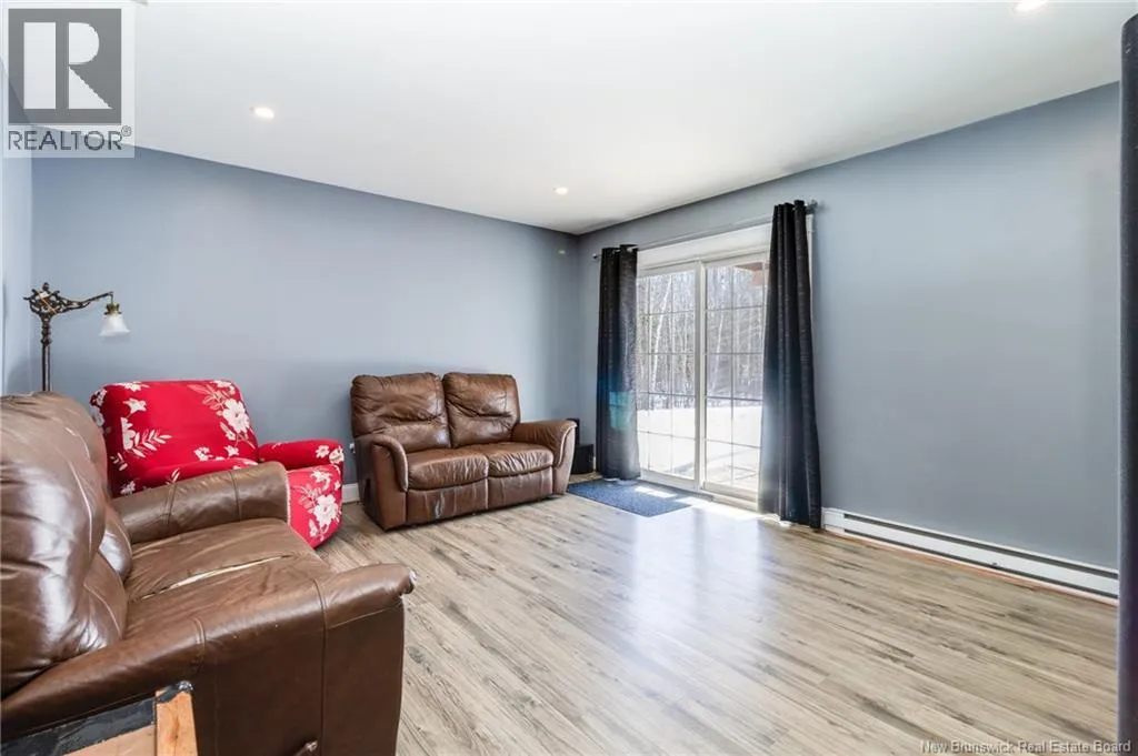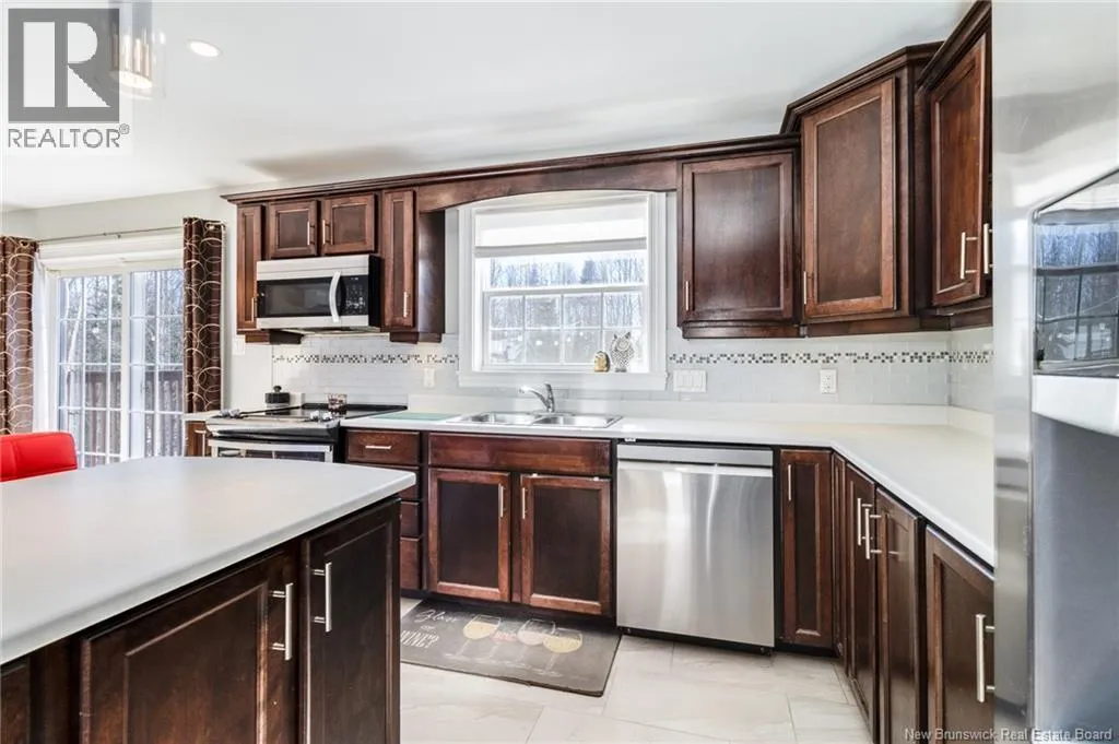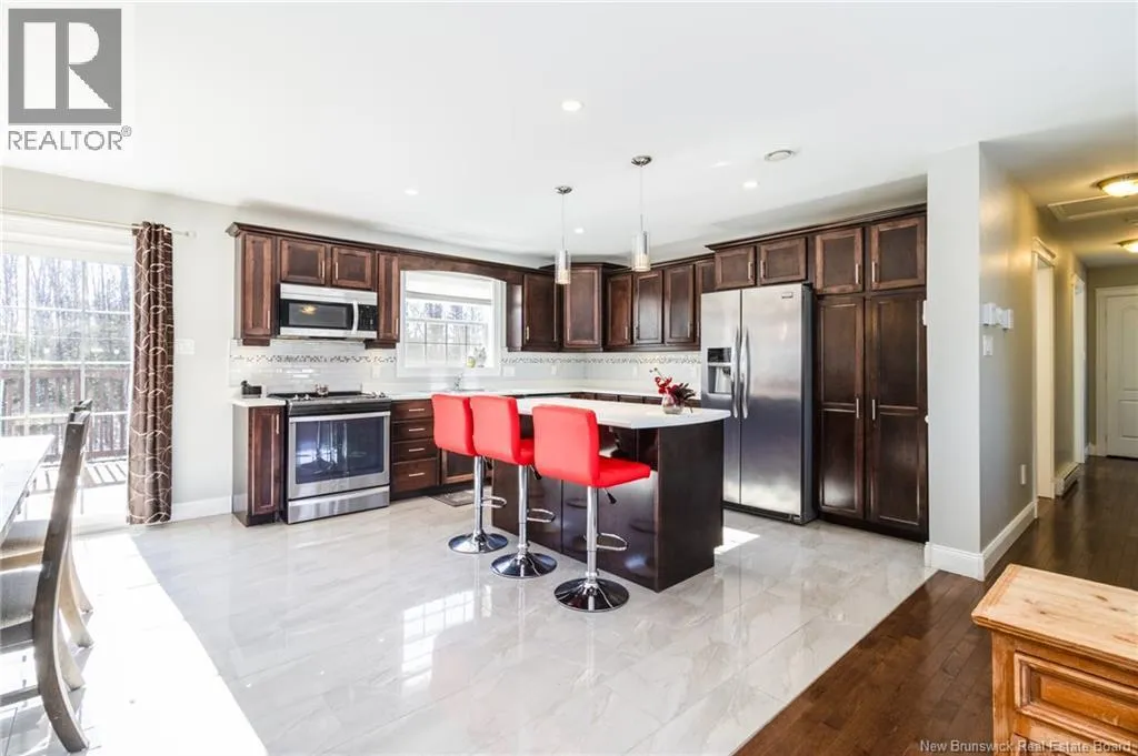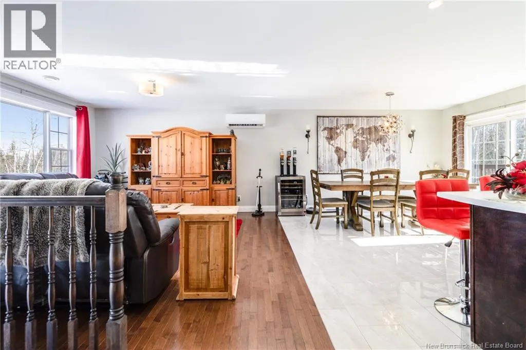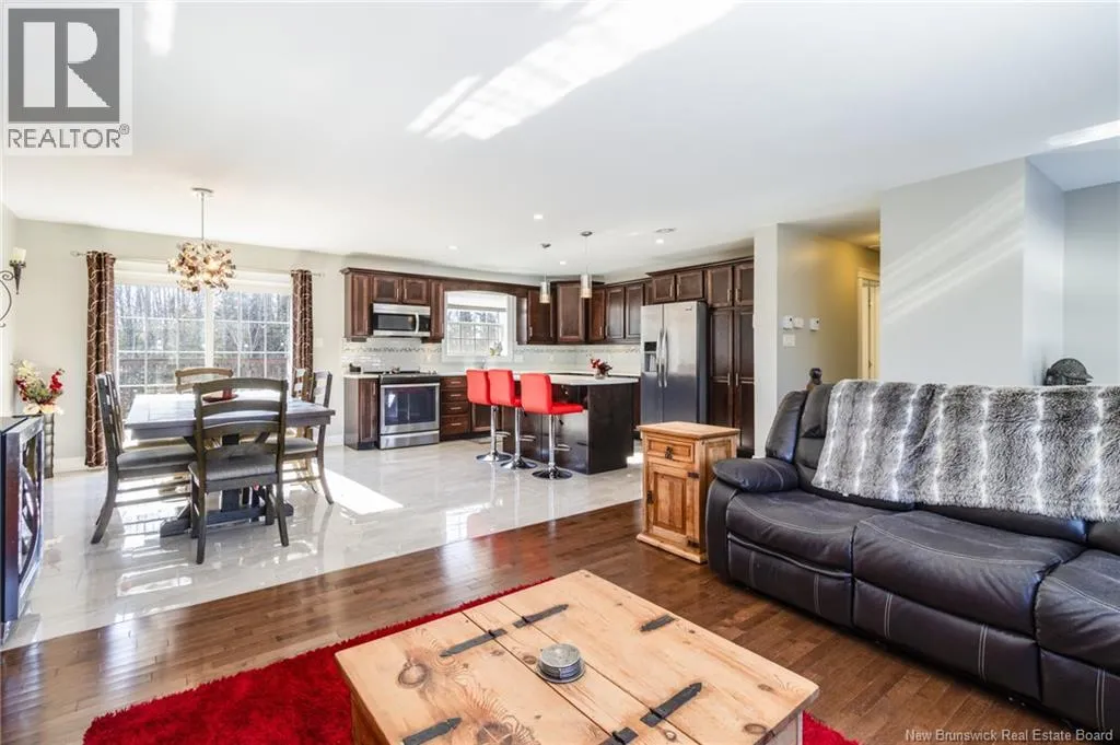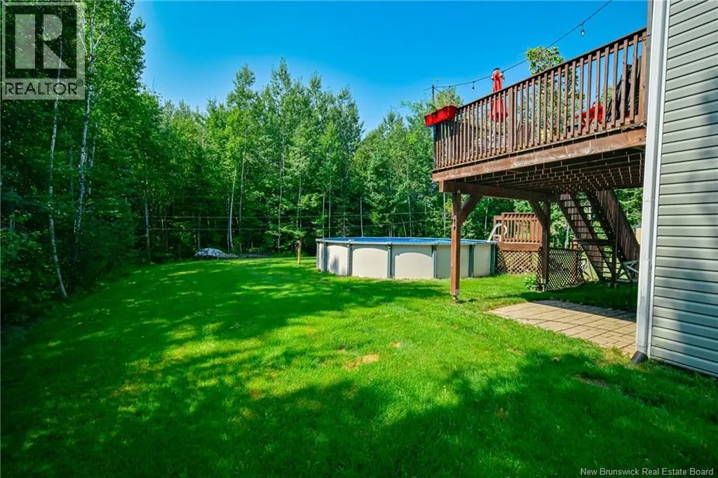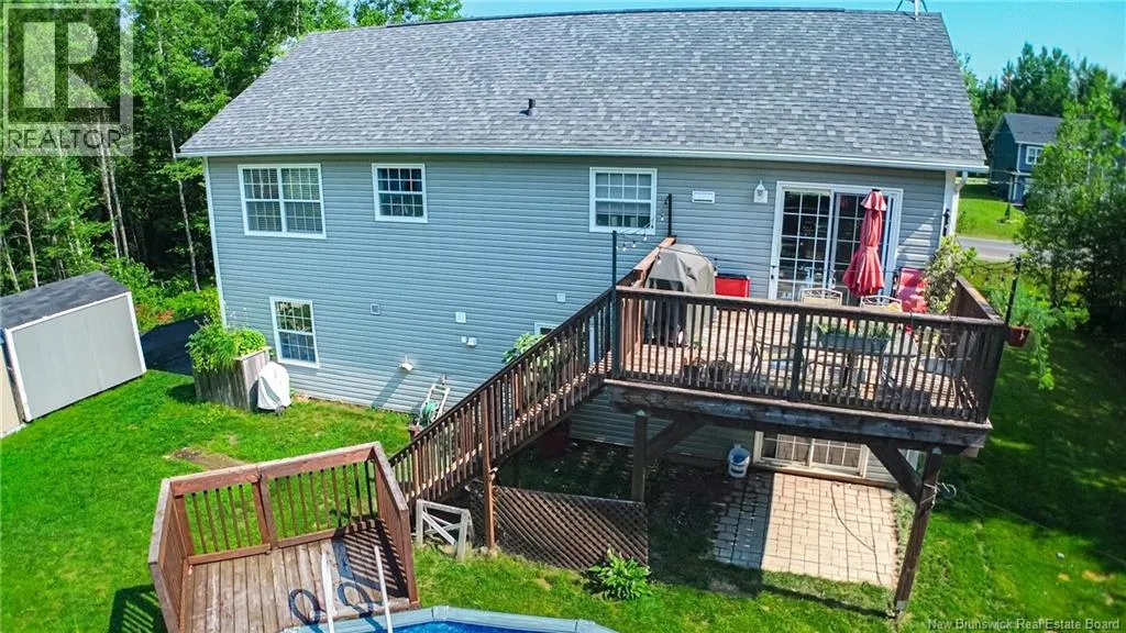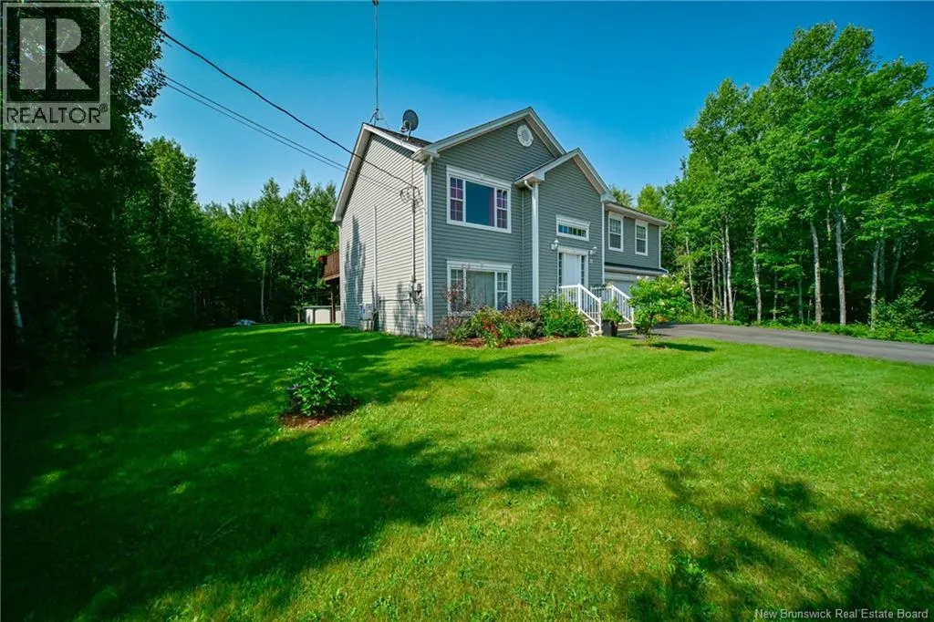 Wilsey Road to Berry Drive Welcome to 23 Berry Drive in Rusagonis. Located just 10 minutes to Fredericton and approximately 15 minutes to Oromocto, this beautiful split entry home offers the perfect balance of privacy and convenience. Custom built with thoughtful design, this bright and inviting 4-bedroom, 2-bathroom home features an abundance of windows that fill the space with natural light. The open concept main living area is ideal for both everyday living and entertaining. The spacious kitchen showcases sought-after dark wood cabinetry, plenty of counter and cupboard space, a large island with seating, pantry storage, and stunning porcelain flooring. Hardwood floors flow through the main living areas, creating a warm and cohesive feel throughout. The dining area provides direct access to the large back deck, perfect for summer BBQs and relaxing while overlooking the private backyard and above-ground pool. The main level also offers three well-sized bedrooms and a full bathroom. Downstairs youll find a spacious family room with walkout access to the backyard, an additional large bedroom, another full bathroom, and a separate utility room. The attached garage provides great storage and convenience year-round. Additional features include a heat pump for efficient heating and cooling, a paved double driveway, 2 storage shed, and over 1 acre of land offering space and privacy. (id:27476)
