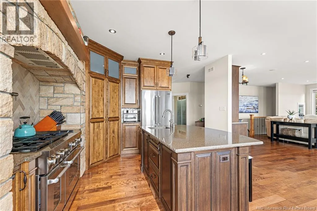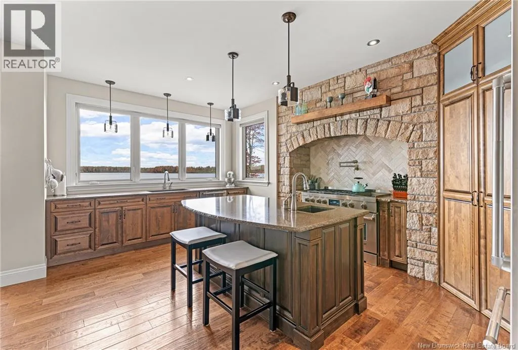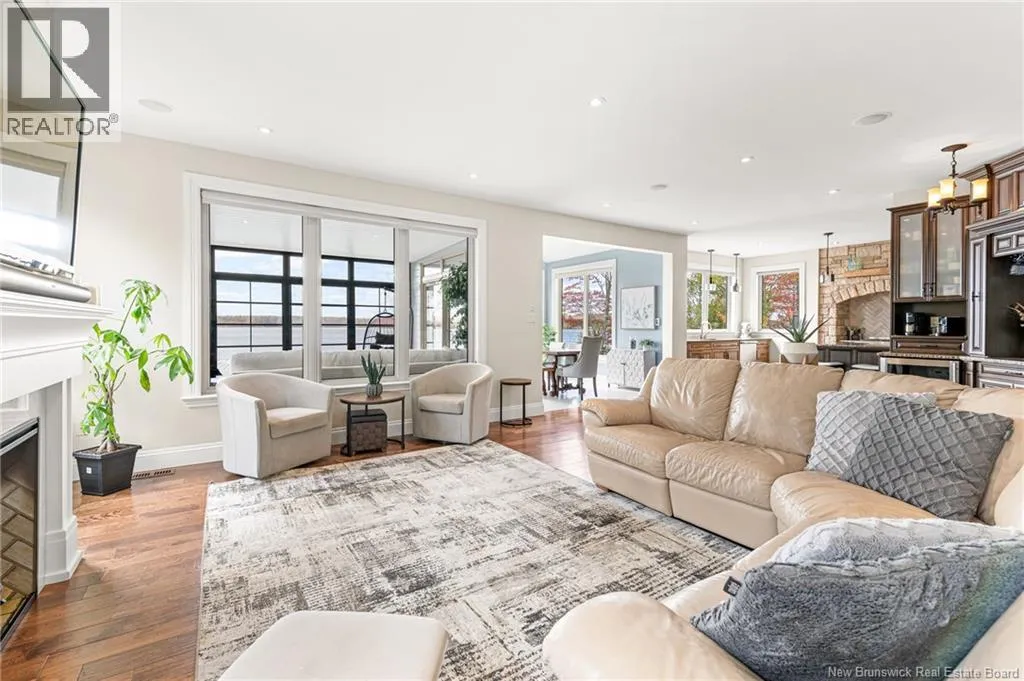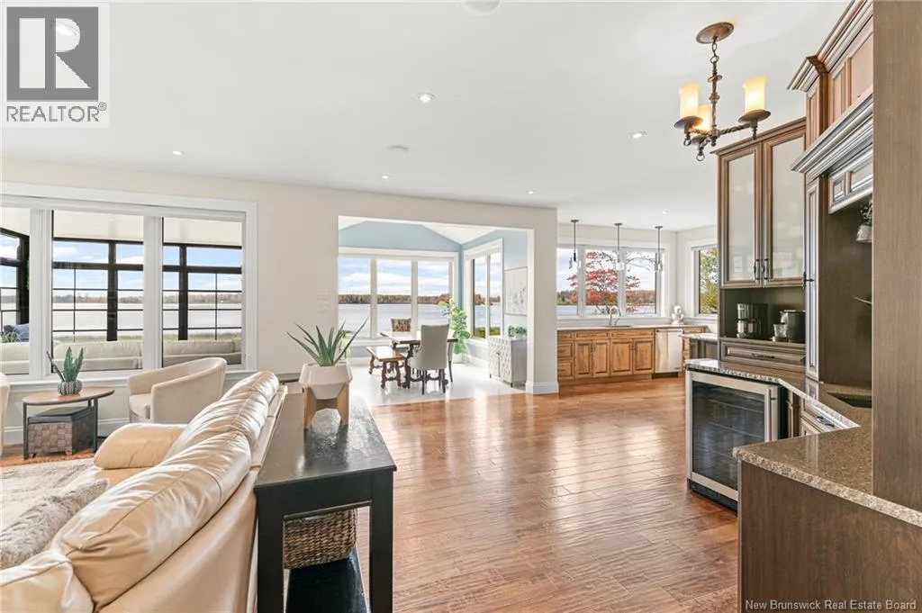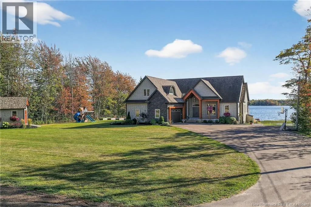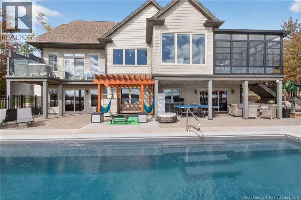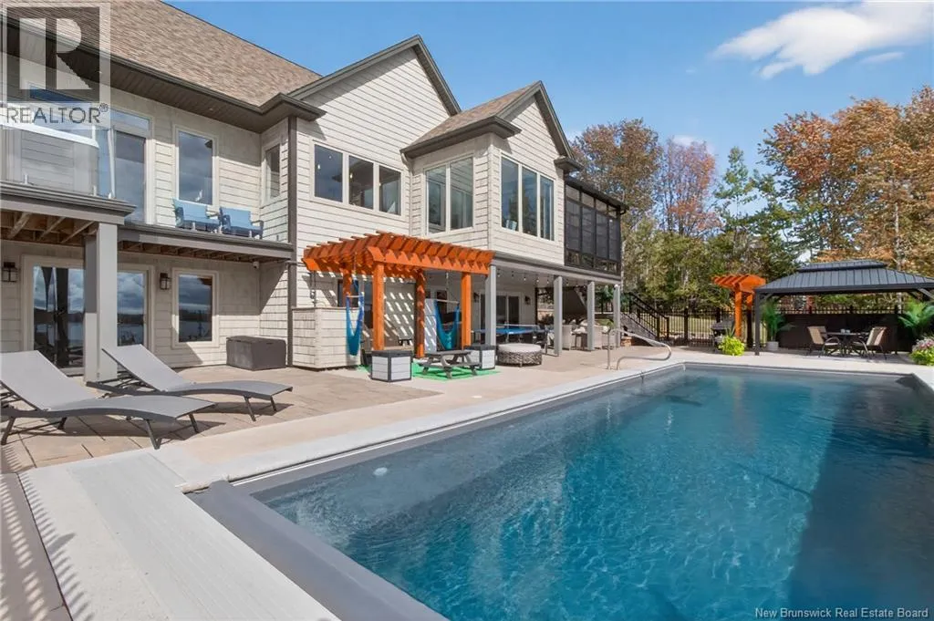 From Moncton, take Route 15 east toward Shediac / Cap-Pelé. Take the Cormier Road exit (on your right). Turn left onto Leblanc Road. Continue straight (Leblanc Road becomes Babineau Road). When you reach a gravel road directly ahead, that is Square Lake Road. Continue until you see 430. GEOTHERMAL HEATING! Welcome to 430 Square Lake in Saint-Andre, NB, where it feels like vacation every day. This exquisitely lakefront bungalow, with a walkout basement, offers 4,280 sq. ft. of refined living, where timeless craftsmanship meets modern comfort. Soaring ceilings, rich finishes, and panoramic lake views define every space. The main level features an inviting foyer, a private office, and an open-concept kitchen with granite and quartz surfaces, a large island, professional-grade appliances, and a walk-in pantry. A sun-filled dining area flows seamlessly into a 3-season gazebo with a Sunspace window system. The living room is anchored by a fireplace and complemented by a wet bar, creating the perfect space for entertaining. The primary suite offers a walk-in closet, a spa-inspired ensuite with a tiled shower, and a private balcony with a hot tub overlooking the water. A versatile bonus room sits above the heated double garage. The walkout level features a family room with a fireplace, two bedrooms, a full bath, a show-stopping wine cellar, a second living space currently used as a gym area, and a second kitchen. Outdoor living shines with a 16Ã40 heated saltwater pool with a retractable cover, a cedar pergola, a fire pit, a dock system, and an outdoor kitchen. Geothermal heating (3 zones), heated floors, generator panel, camera system, and soft landscape lighting complete this exceptional lakeside retreatOnly 30 minutes from the Greater Moncton airport. (id:27476)