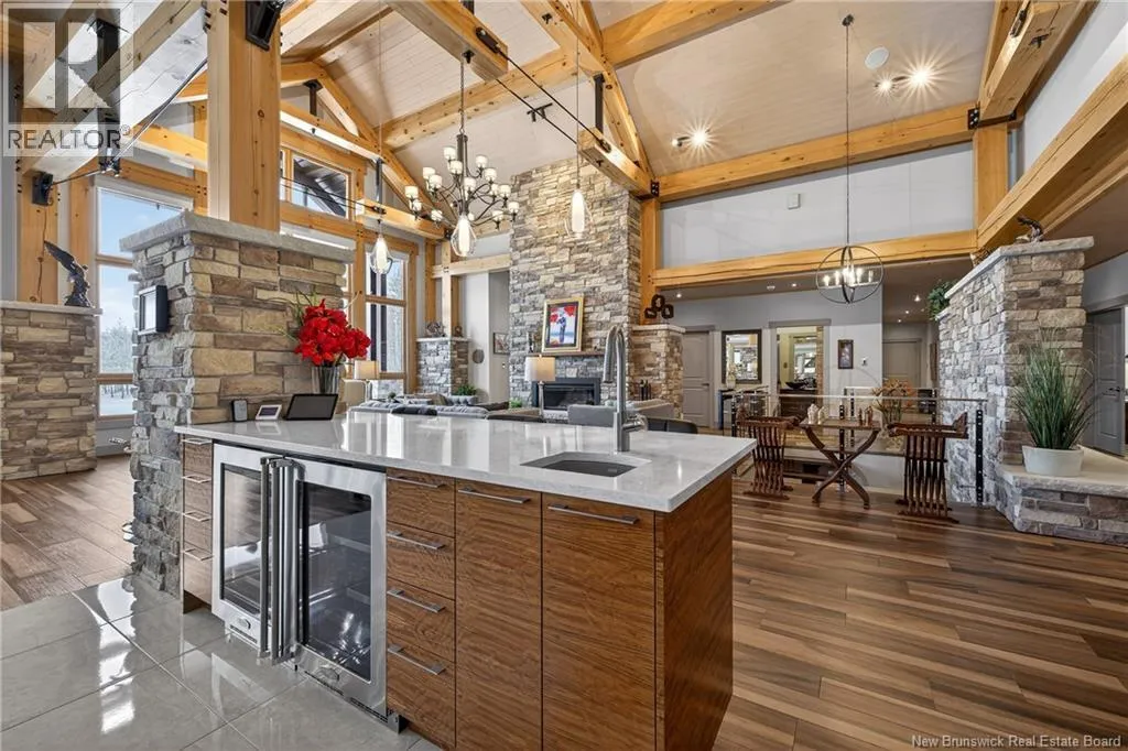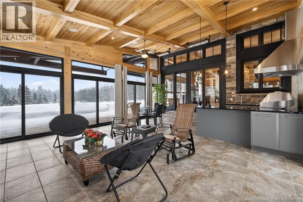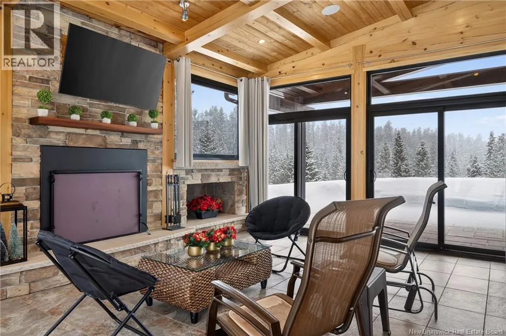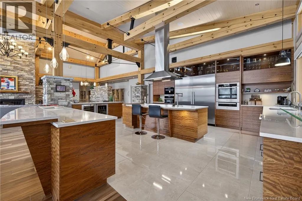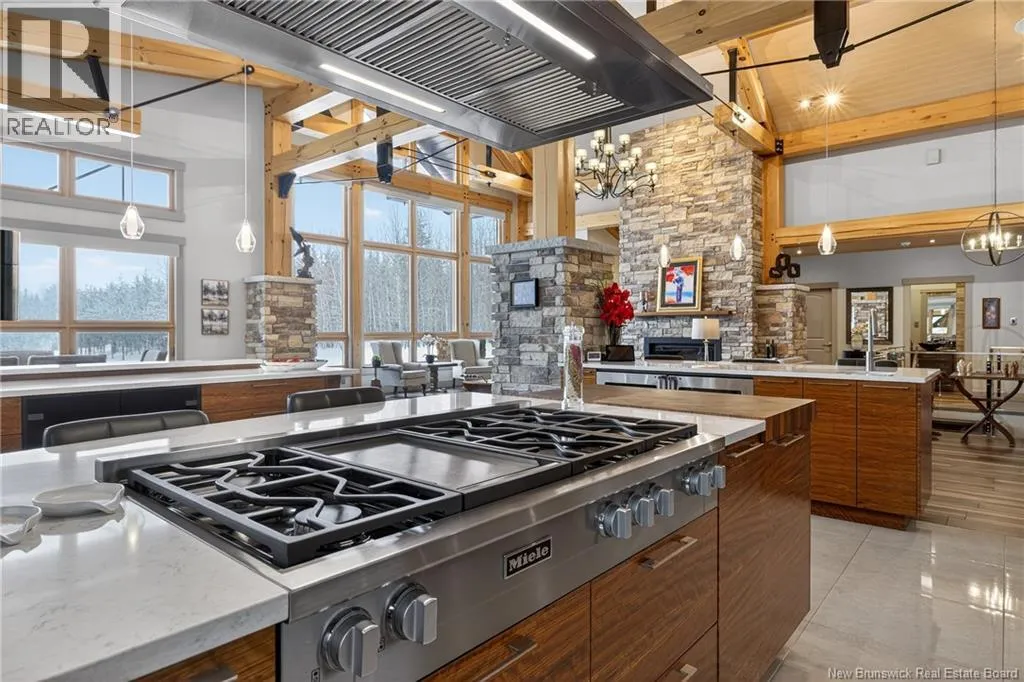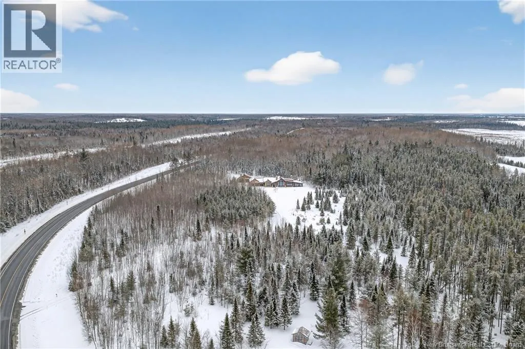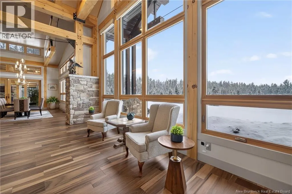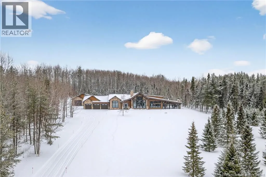 From Tracadie or Bathurst, turn onto Route 160, drive for about twenty minutes, from Bathurst the house will be on your right and from Tracadie the house will be on your left. Set on 20 private wooded acres, this exceptional residence offers remarkable privacy and rare tranquility. Timber frame construction with a soaring 23-foot cathedral ceiling and massive exposed beams creates a warm and inviting atmosphere, ideal for entertaining. The open-concept layout seamlessly connects the kitchen, dining, and living areas around a striking stone accent wall and central fireplace, while three fireplaces in total provide added comfort and a cozy ambiance throughout the winter months. The gourmet kitchen features custom solid Mozambique wood cabinetry, three generous islands, quartz countertops, an integrated butcher block, and premium Miele and Marvel appliances. Two full bedroom suites each include a private bathroom with a freestanding soaking tub and glass-enclosed shower. A spacious office supports working from home, and a dedicated home theatre room offers the perfect retreat for relaxation. The four-season veranda extends the living space year-round, ideal for gathering around the built-in barbecue and enjoying memorable moments. Radiant heated floors throughout the residence, Control4 smart home system, motorized blinds, security cameras, fibre optic internet, 22 kW automatic propane generator, and 400 AMP electrical service complete this rare estate where comfort, technology, and quality of life come together. (id:27476)