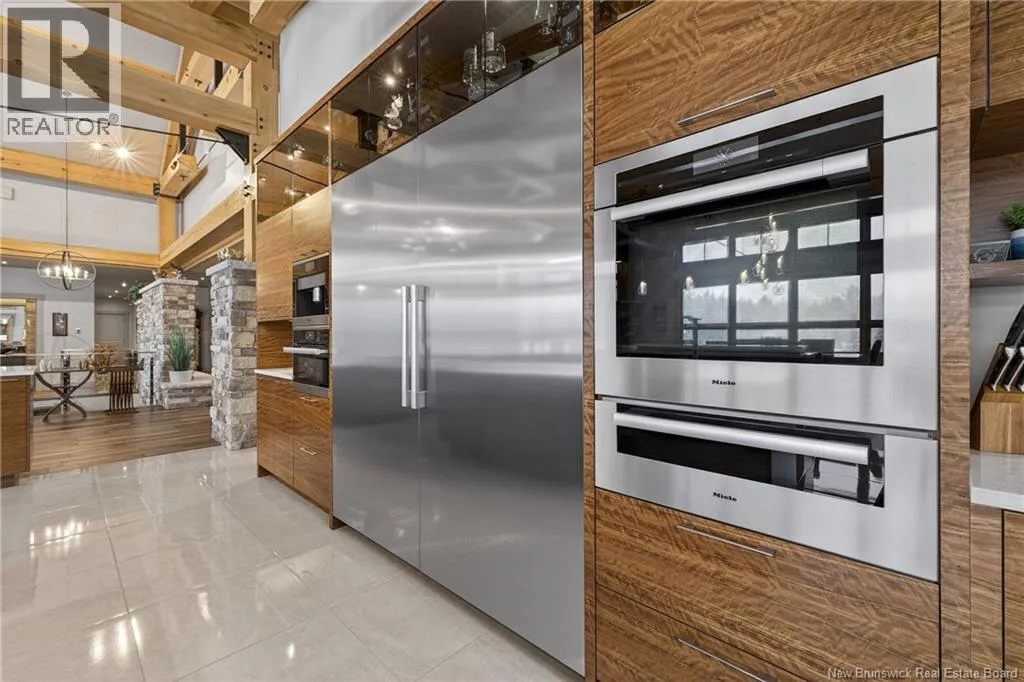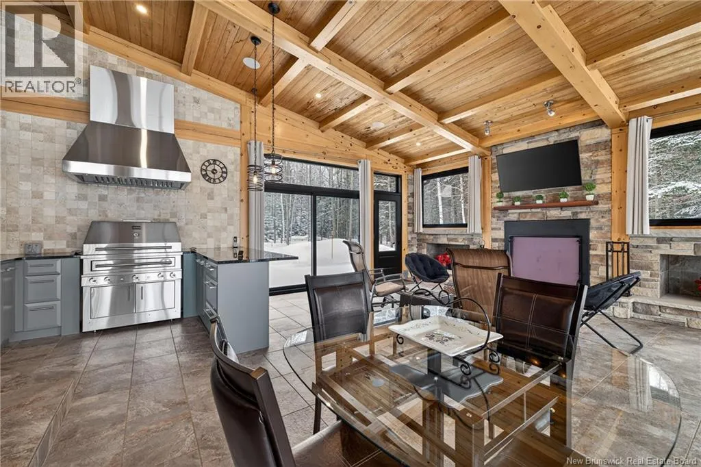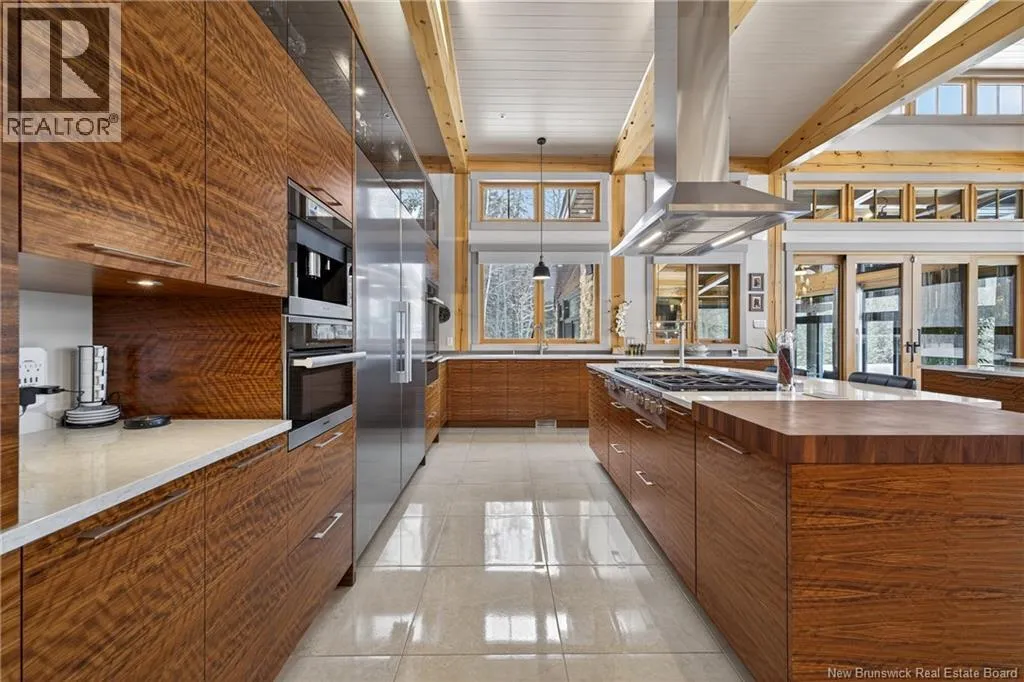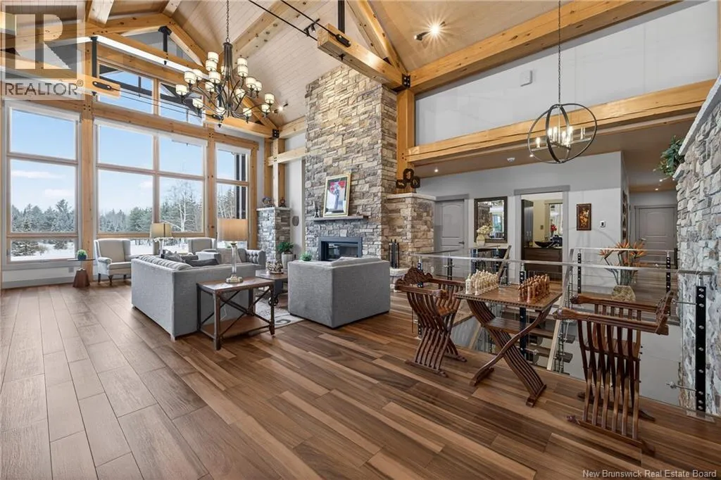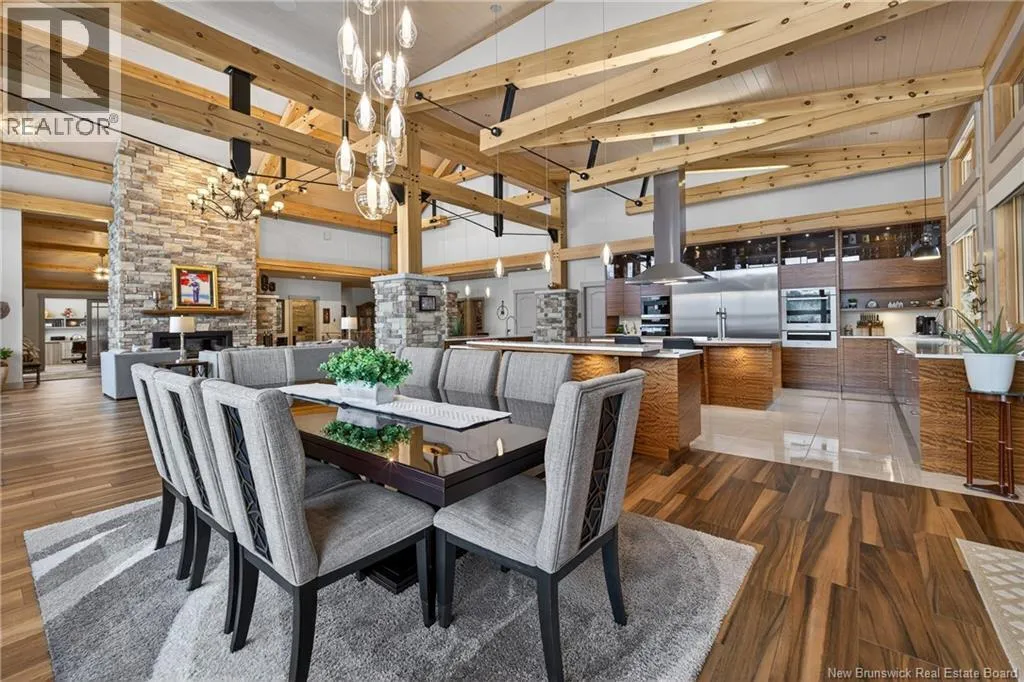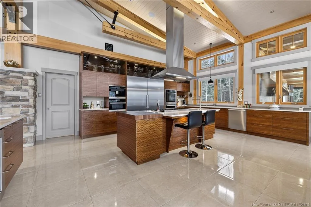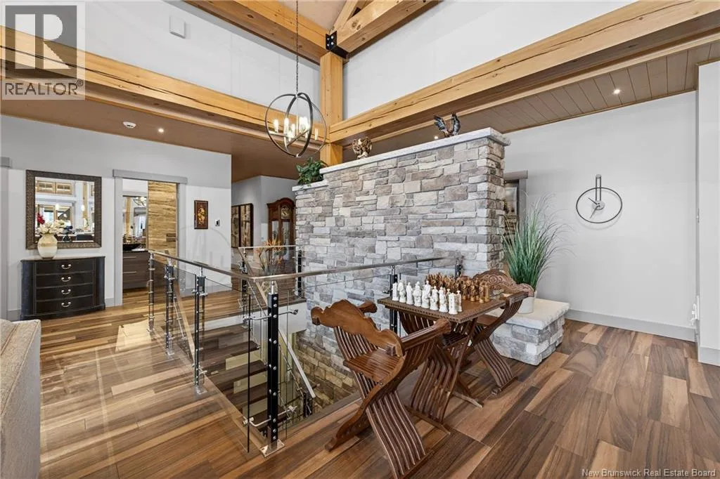 From Tracadie or Bathurst, turn onto Route 160, drive for about twenty minutes, from Bathurst the house will be on your right and from Tracadie the house will be on your left. Set on 20 private wooded acres, this exceptional residence offers remarkable privacy and rare tranquility. Timber frame construction with a soaring 23-foot cathedral ceiling and massive exposed beams creates a warm and inviting atmosphere, ideal for entertaining. The open-concept layout seamlessly connects the kitchen, dining, and living areas around a striking stone accent wall and central fireplace, while three fireplaces in total provide added comfort and a cozy ambiance throughout the winter months. The gourmet kitchen features custom solid Mozambique wood cabinetry, three generous islands, quartz countertops, an integrated butcher block, and premium Miele and Marvel appliances. Two full bedroom suites each include a private bathroom with a freestanding soaking tub and glass-enclosed shower. A spacious office supports working from home, and a dedicated home theatre room offers the perfect retreat for relaxation. The four-season veranda extends the living space year-round, ideal for gathering around the built-in barbecue and enjoying memorable moments. Radiant heated floors throughout the residence, Control4 smart home system, motorized blinds, security cameras, fibre optic internet, 22 kW automatic propane generator, and 400 AMP electrical service complete this rare estate where comfort, technology, and quality of life come together. (id:27476)