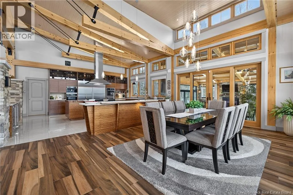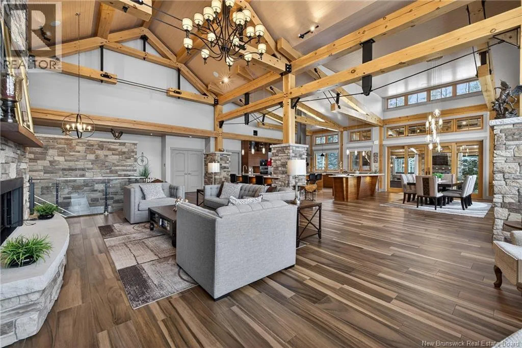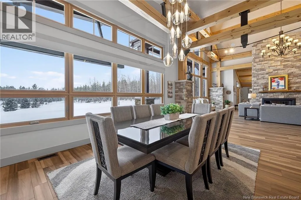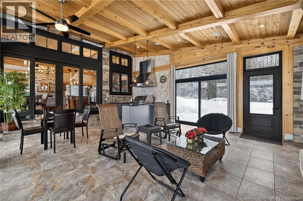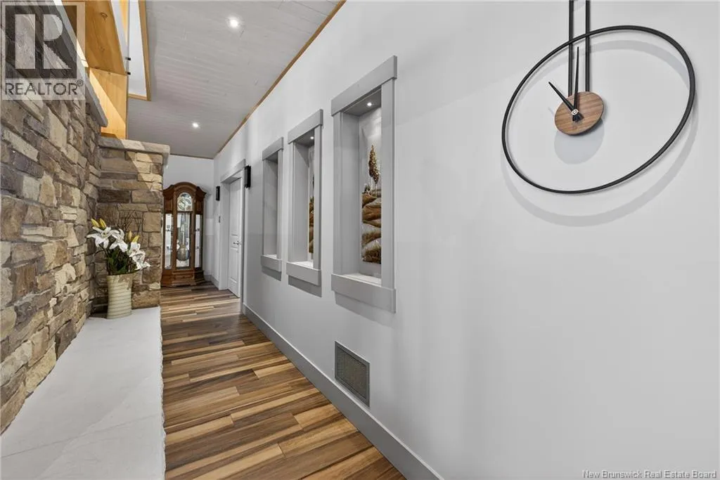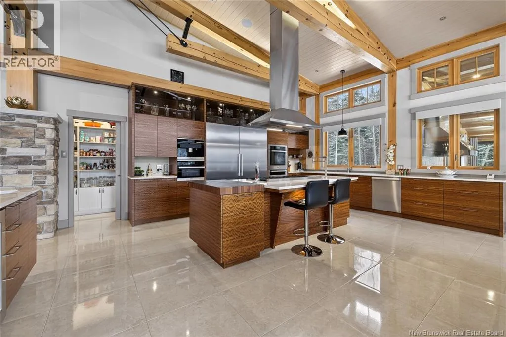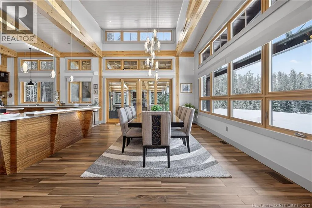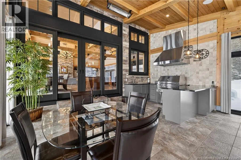 From Tracadie or Bathurst, turn onto Route 160, drive for about twenty minutes, from Bathurst the house will be on your right and from Tracadie the house will be on your left. Set on 20 private wooded acres, this exceptional residence offers remarkable privacy and rare tranquility. Timber frame construction with a soaring 23-foot cathedral ceiling and massive exposed beams creates a warm and inviting atmosphere, ideal for entertaining. The open-concept layout seamlessly connects the kitchen, dining, and living areas around a striking stone accent wall and central fireplace, while three fireplaces in total provide added comfort and a cozy ambiance throughout the winter months. The gourmet kitchen features custom solid Mozambique wood cabinetry, three generous islands, quartz countertops, an integrated butcher block, and premium Miele and Marvel appliances. Two full bedroom suites each include a private bathroom with a freestanding soaking tub and glass-enclosed shower. A spacious office supports working from home, and a dedicated home theatre room offers the perfect retreat for relaxation. The four-season veranda extends the living space year-round, ideal for gathering around the built-in barbecue and enjoying memorable moments. Radiant heated floors throughout the residence, Control4 smart home system, motorized blinds, security cameras, fibre optic internet, 22 kW automatic propane generator, and 400 AMP electrical service complete this rare estate where comfort, technology, and quality of life come together. (id:27476)