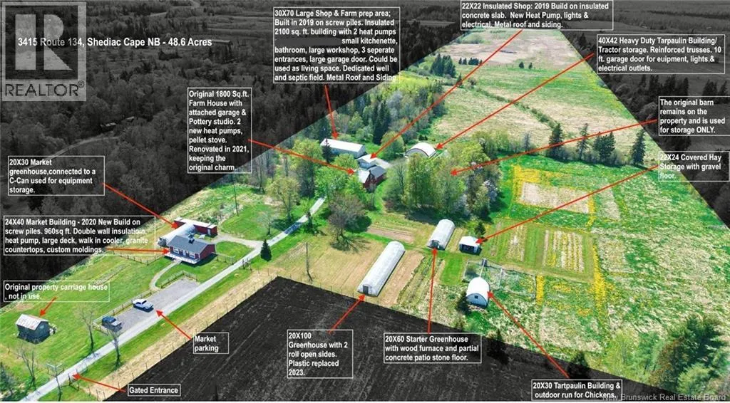 From Shediac drive north on route #134, property is on the left side - Look for Affinity Farm Signage. (Property was formerly known as Affinity Farm). Welcome to this incredible 48+ acre property in Shediac Cape, a rare opportunity to own a piece of local history dating back to the 1830s. Just minutes from Shediacs amenities, beaches, and major highways, this property offers lots of potential. Formerly used as a hobby farm and operated as Affinity Farm, the land features a marketplace-style storefront, large greenhouses, open fields, and an oversized garage with additional outbuildings, ideal for many different uses., At the heart of the property is an updated 3-bedroom, 2-bath farmhouse with a modern kitchen, dining and living areas, mudroom, pottery studio, and attached garage. Comfort is ensured with two mini-split heat pumps and a pellet stove. A separate private space offers flexibility for extended family, guests, or potential onsite workers. Call for further details or to arrange a viewing. (id:27476)