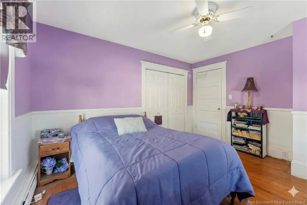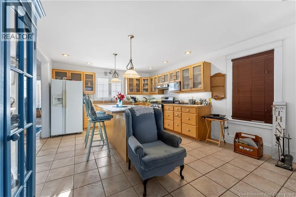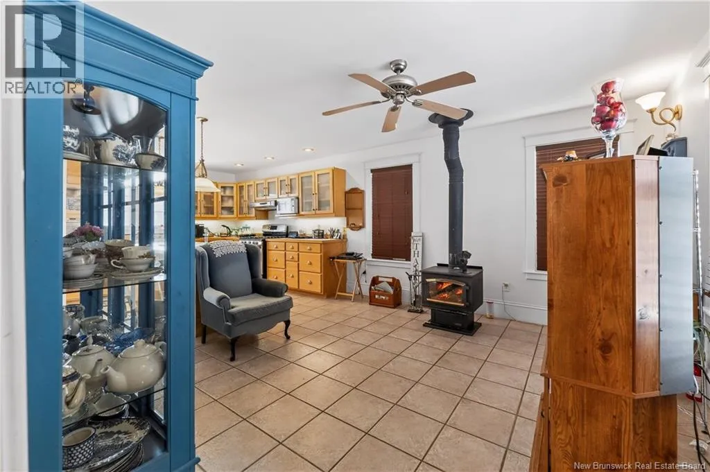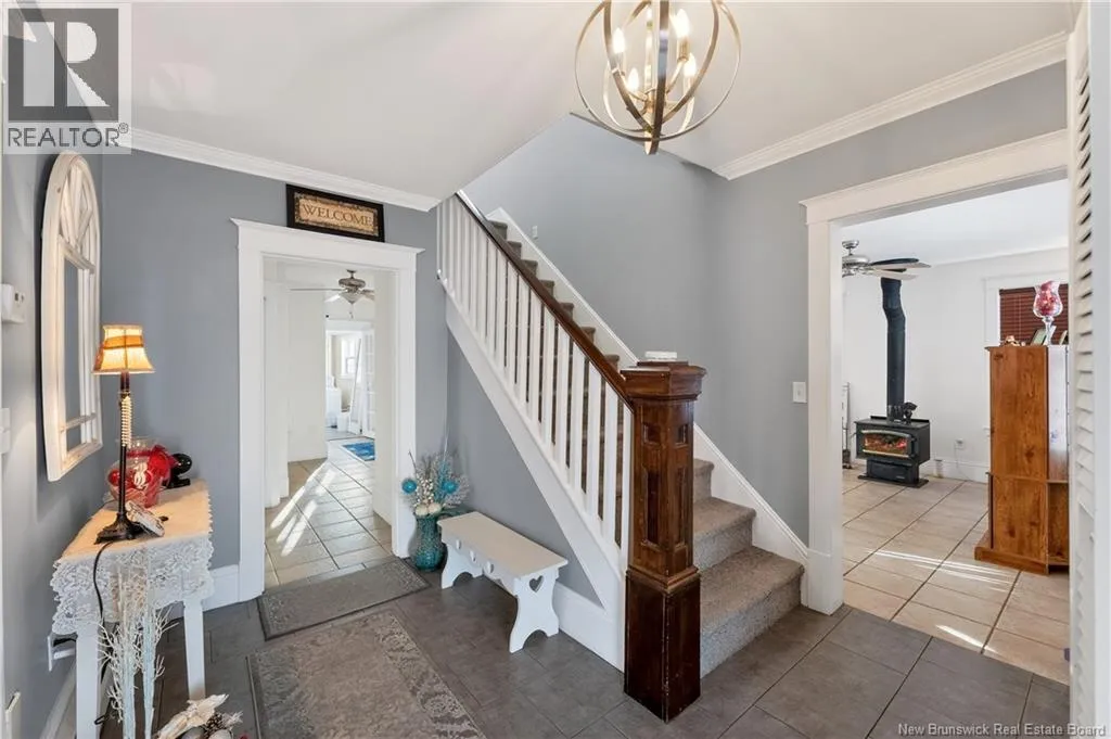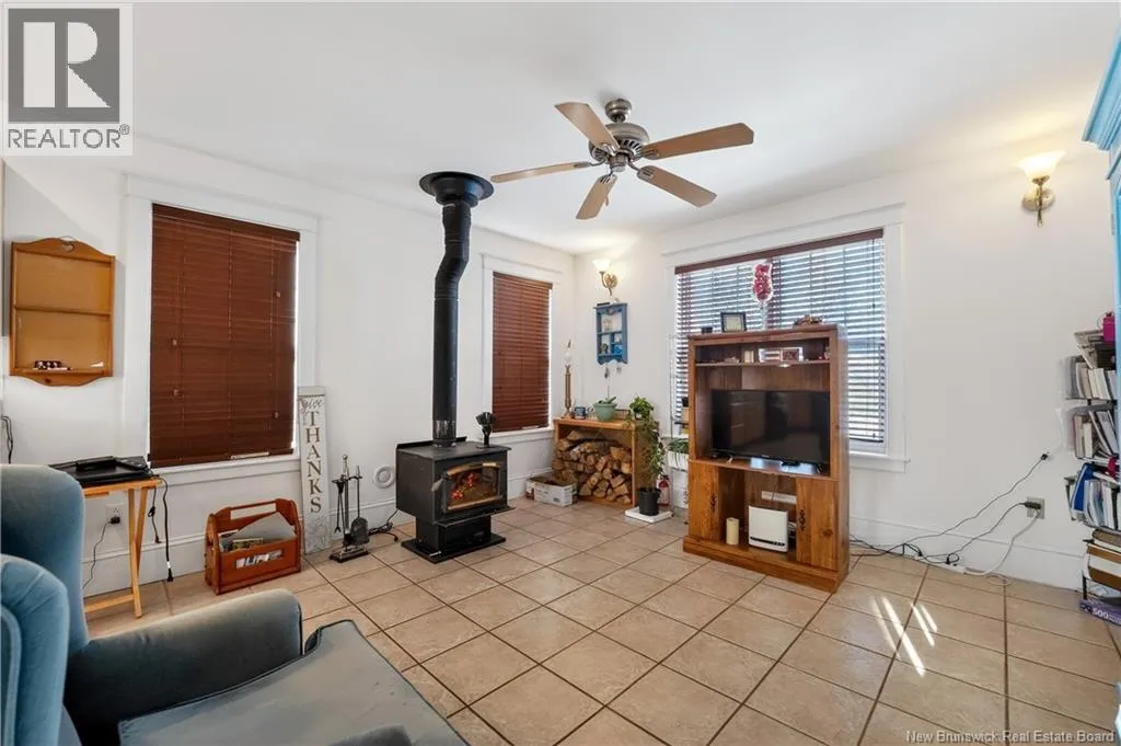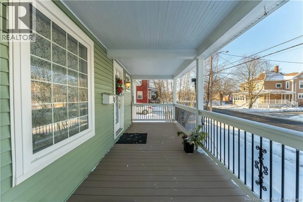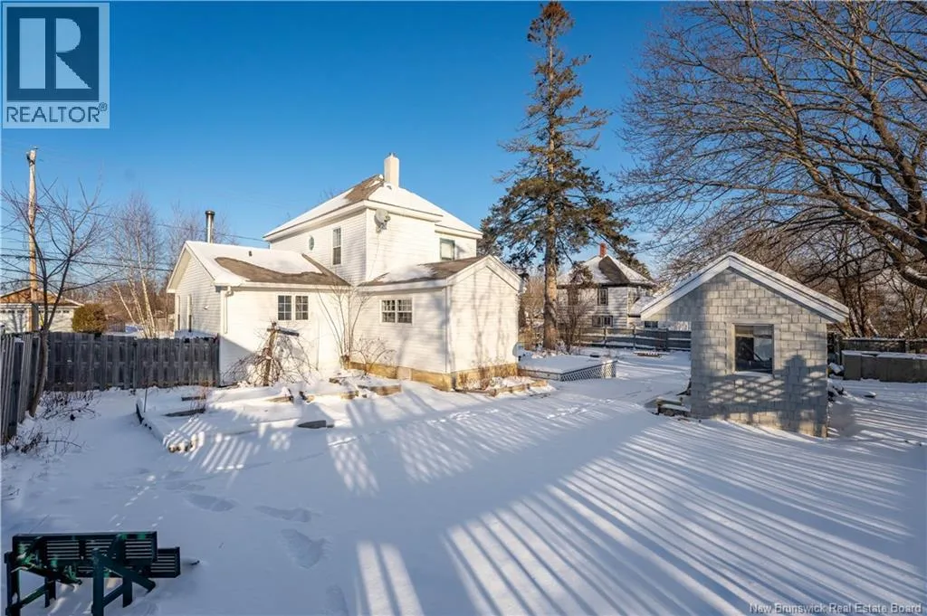 drive down king st, towards st croix river. Turn left at Tim Hortons onto Queen St E. #15 on right-side. Welcome to this well maintained 3 bedroom, 1.5 bathroom home located in the centre of town. Set on a large double lot totaling approximately 0.25 acres, the property features a spacious fully fenced yard perfect for children, pets, or outdoor entertaining. A covered front porch welcomes you in and offers the perfect place to relax and enjoy a front-porch evening with a good book. Inside, the layout is both functional and inviting. To the right of the entry is one of two comfortable family rooms, open to the kitchen and warmed by a cozy wood stove. The spacious kitchen offers an oversized counter, ideal for cooking, gathering, and everyday living. A hallway leads to convenient main floor laundry tucked behind closet doors, a powder room, and a back entrance that functions as a practical mudroom. On the left side of the home, a bright open-concept living and dining area is filled with natural light from large windows. The dining space includes built-in shelving and patio doors that open onto the back deck overlooking the large fenced yard. Upstairs youll find a spacious bathroom with a large L shaped vanity, two good sized bedrooms, and a third bedroom at the front of the home that would make a perfect nursery, home office, or additional storage space. Additional features include natural gas forced-air heating and a convenient location just minutes from the CanadaU.S. border, Garcelon Civic Centre, hospital, shopping, schools, and other local amenities. (id:27476)