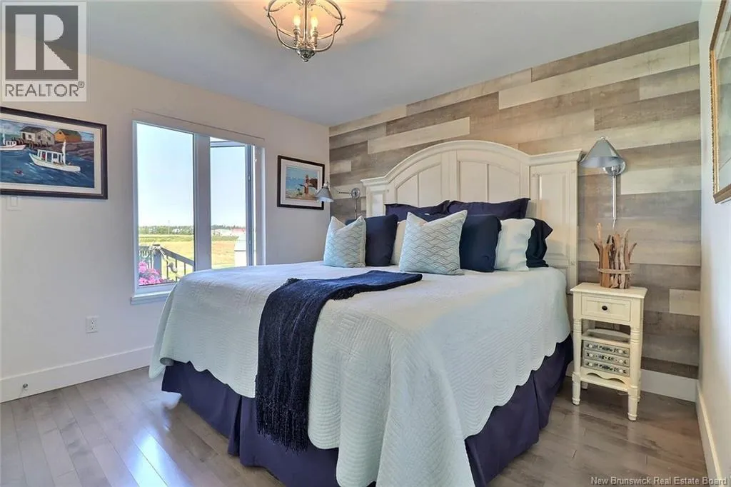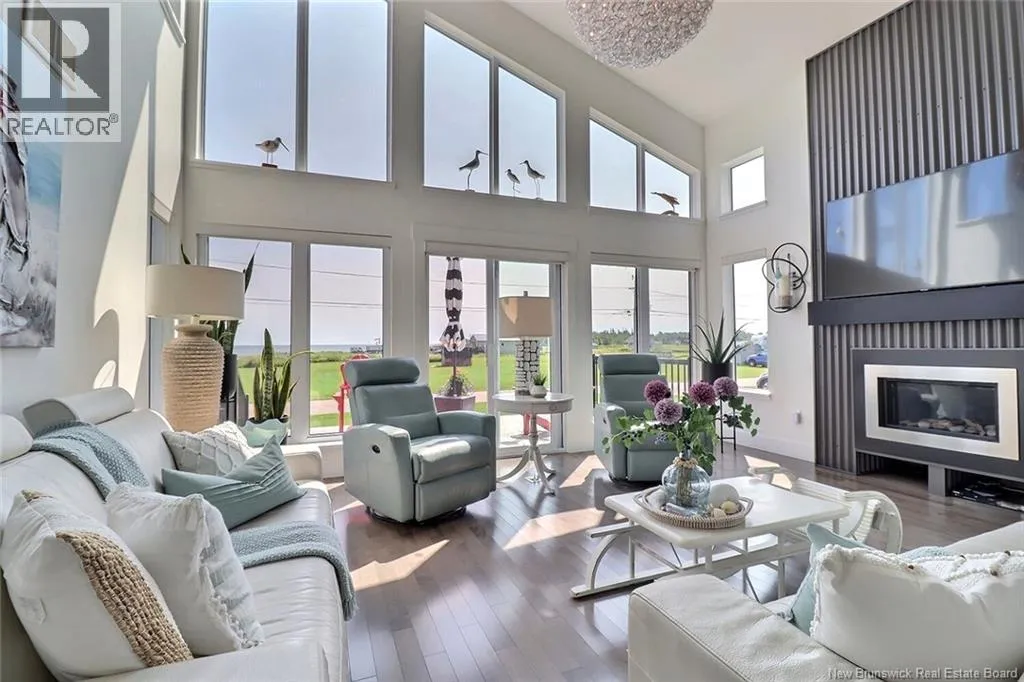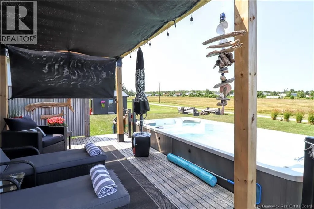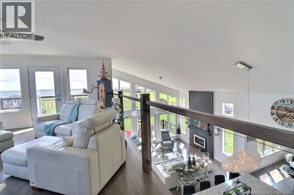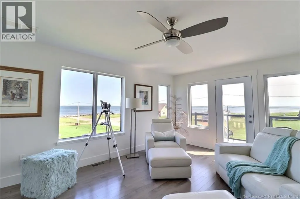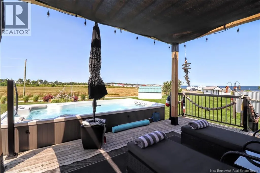 Chemin Bas-Cap-Pelé (Route 950) to Connie Road. Welcome to 52 Connie, an extraordinary custom-built home offering panoramic water views, deeded beach access, and thoughtful design throughout. Built in 2016 with quality and energy efficiency in mind, this stunning property boasts low-maintenance materials including a durable corrugated steel exterior and metal roof. Step inside and be greeted by soaring ceilings, expansive windows, and a bright, open-concept layout that floods the space with natural light. The chefs kitchen features quartz countertops, custom cabinetry, and premium stainless steel appliances, seamlessly flowing into the living and dining areas; perfect for entertaining. The primary suite offers water views, three double closets, and a spa-like 5-piece ensuite. Two additional bedrooms include generous closet space and a cedar-lined closet upstairs for your seasonal storage needs. Enjoy year-round comfort with the central air heat pump and interior hardwood and ceramic tile throughout. Outside, two oversized decks showcase spectacular sunsets and sunrises. The meticulously landscaped 0.47-acre lot includes a swim spa, a custom fire pit, RV hookup, shed, and a large attached garage with room for two vehicles, toys & workshop. (id:27476)