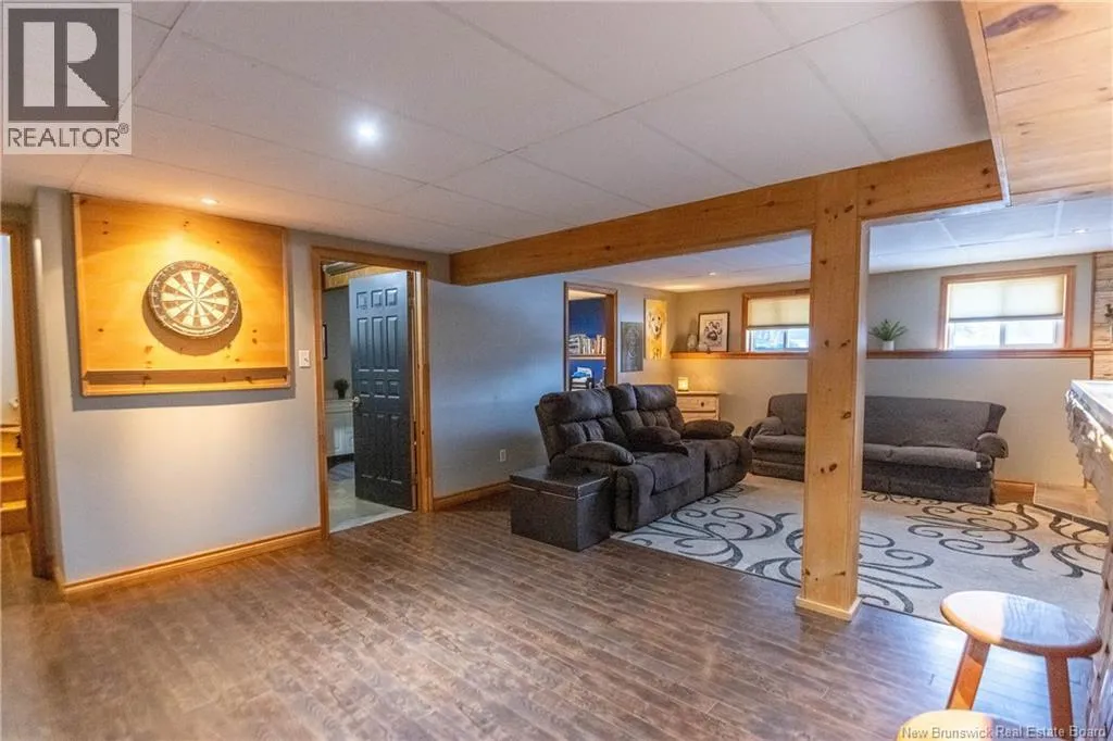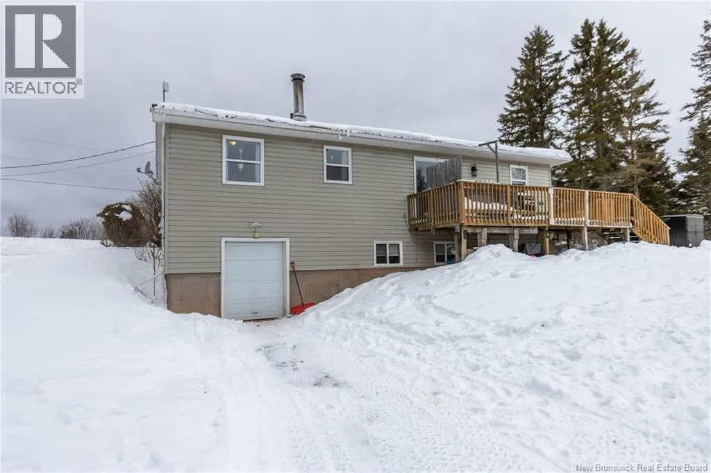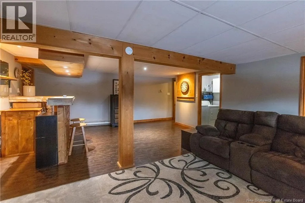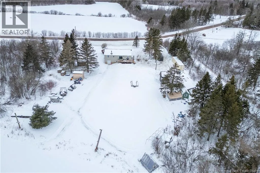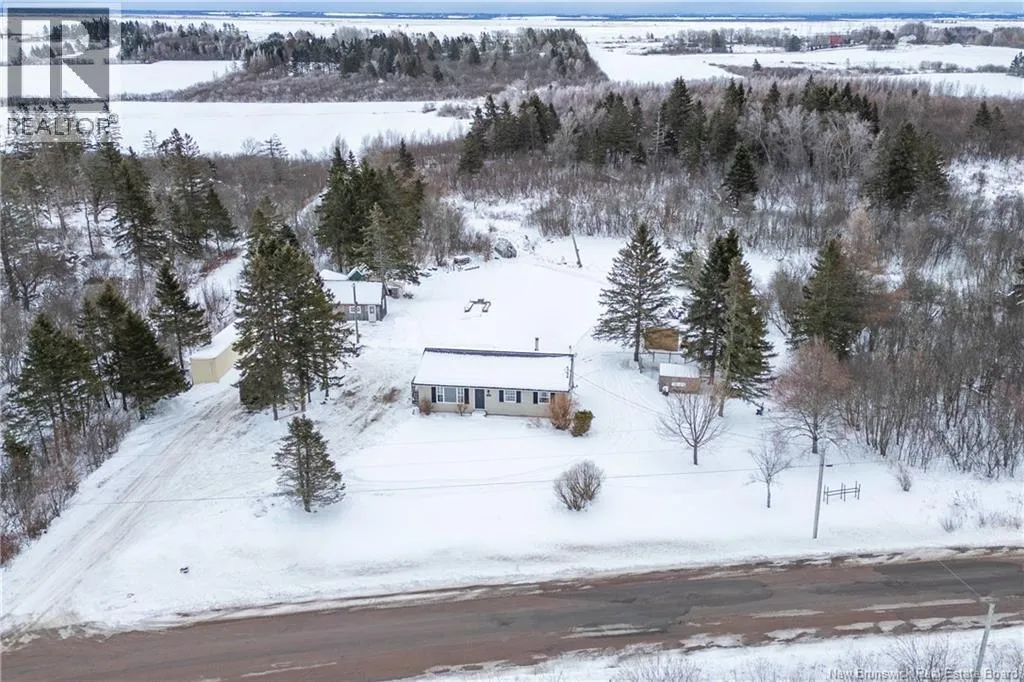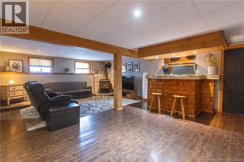 From downtown Sackville head North on Main, continue straight onto Pond Shore, left onto Upper Aboujagane. BUNGALOW TUCKED INTO A PRIVATE 1-ACRE LOT JUST OUTSIDE OF TOWN LIMITS! This home features an open-concept main floor with a spacious living room with hardwood flooring, a bright kitchen with room for a peninsula/island, and a dining area with pantry closet and patio doors to the back deck. The primary bedroom is spacious, and could easily be converted back to two bedrooms, with two closets. There is a great-sized guest bedroom, and a full 4pc bathroom with linen closet. The basement is finished with a rec room - complete with wood stove and even a bar! This level also has an office, half bathroom with laundry, and access to the 12'5x24 garage that opens into the backyard. There is a detached wired shed perfect for workshop, as well as chicken coop. The backyard overlooks a neighbouring pond, and is surrounded by trees. Updates to the home include: metal roof (back in 2024, front in 2025), pressure tank and well pump (2021), shed (2017). Home also has a hot tub which can be included in the sale as well. Just minutes to downtown Sackville, 20 minutes to Amherst, and 35 minutes to Moncton. Outside of town limits so the taxes are significantly lower. (id:27476)