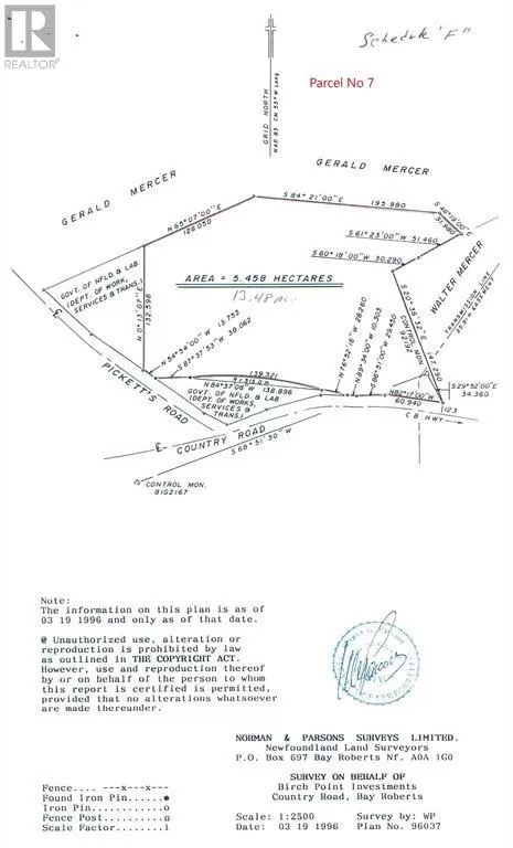 Prime Development Opportunity: 193 Acres of Commercial Land in Bay Roberts, Newfoundland An exceptional investment opportunity awaits with 193 acres of undeveloped commercial land, offered as a single package comprising 14 separate parcels. This diverse property includes: 13.5 Acres in a prime commercial area along LT Stick Drive, providing excellent accessibility. 78 Acres along Picketts Road, strategically located for future development. While some parcels are easily accessible, others will require development to reach their full potential. This property is ideally situated for future growth and commercial ventures. Key Details: Land Sale: Subject to HST. Measurements: All measurements and locations are approximate, provided by the listing agent for informational purposes. Survey: Exact locations and dimensions to be confirmed by a survey. Note: Lot #12 & 15 have been removed from the full package sale. This is a rare chance to acquire a substantial tract of land in a prime location. Don't miss the opportunity to invest in the future of Bay Roberts. (id:27476)