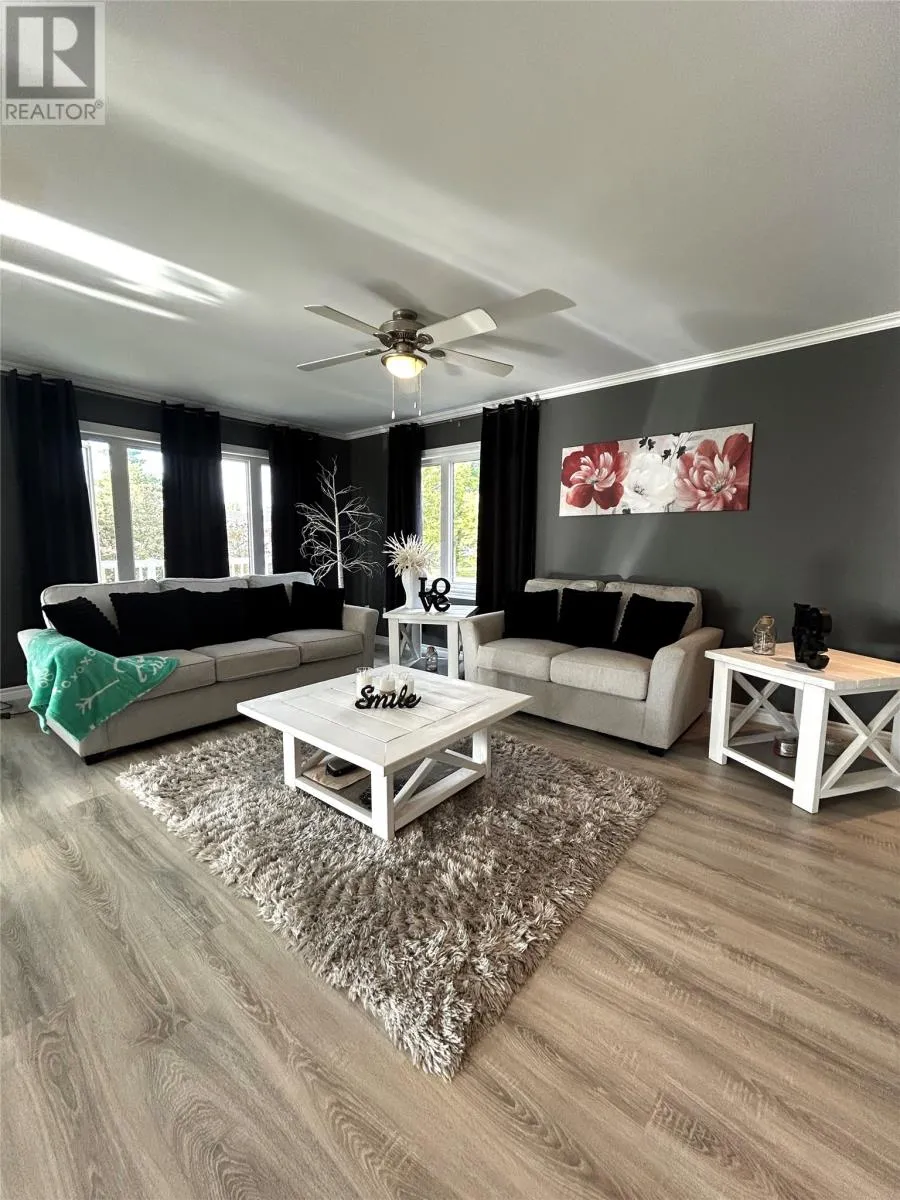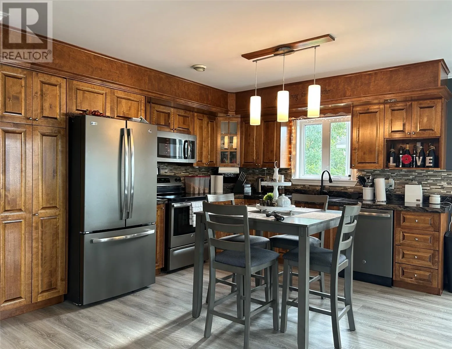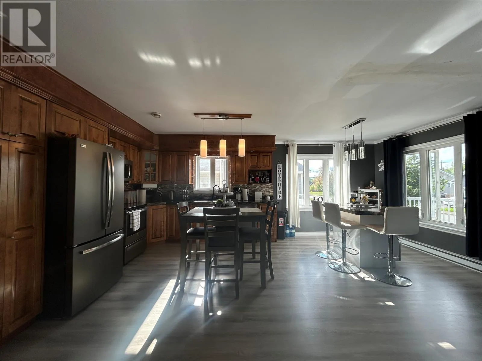 Located in a desired area of town, is this beautiful 3 bedroom side split home located in the town of Bishop's Falls. Main area features a foyer, open concept kitchen/dining and living area with birch cabinets, island to match, all new flooring, sink, countertop and backsplash, all appliances just 6 years old, main bathroom with large sliding door linen closet. The Primary bedroom features a patio door to a private 12x6 balcony, and tons of closet space. Bright a spacious 2nd bedroom completes the main floor. Basement features another full bathroom, laundry room, large family/games room with bar , third bedroom , also a bonus room which could use for a home based business or office. Home has an air/heat recovery system, new pressure treated deck on front with aluminum railing crown moldings throughout detached 20x16 wired garage, fully fenced at rear, landscaped, and double paved driveway. Don't miss out on this beautiful family home. This listing is subject to a Sellers Direction Re: Offers, with no offers being conveyed until prior to Saturday September 13, 2025 at 4pm. Please leave all offers open for acceptance until 9pm on Saturday September 13, 2025. (id:27476)