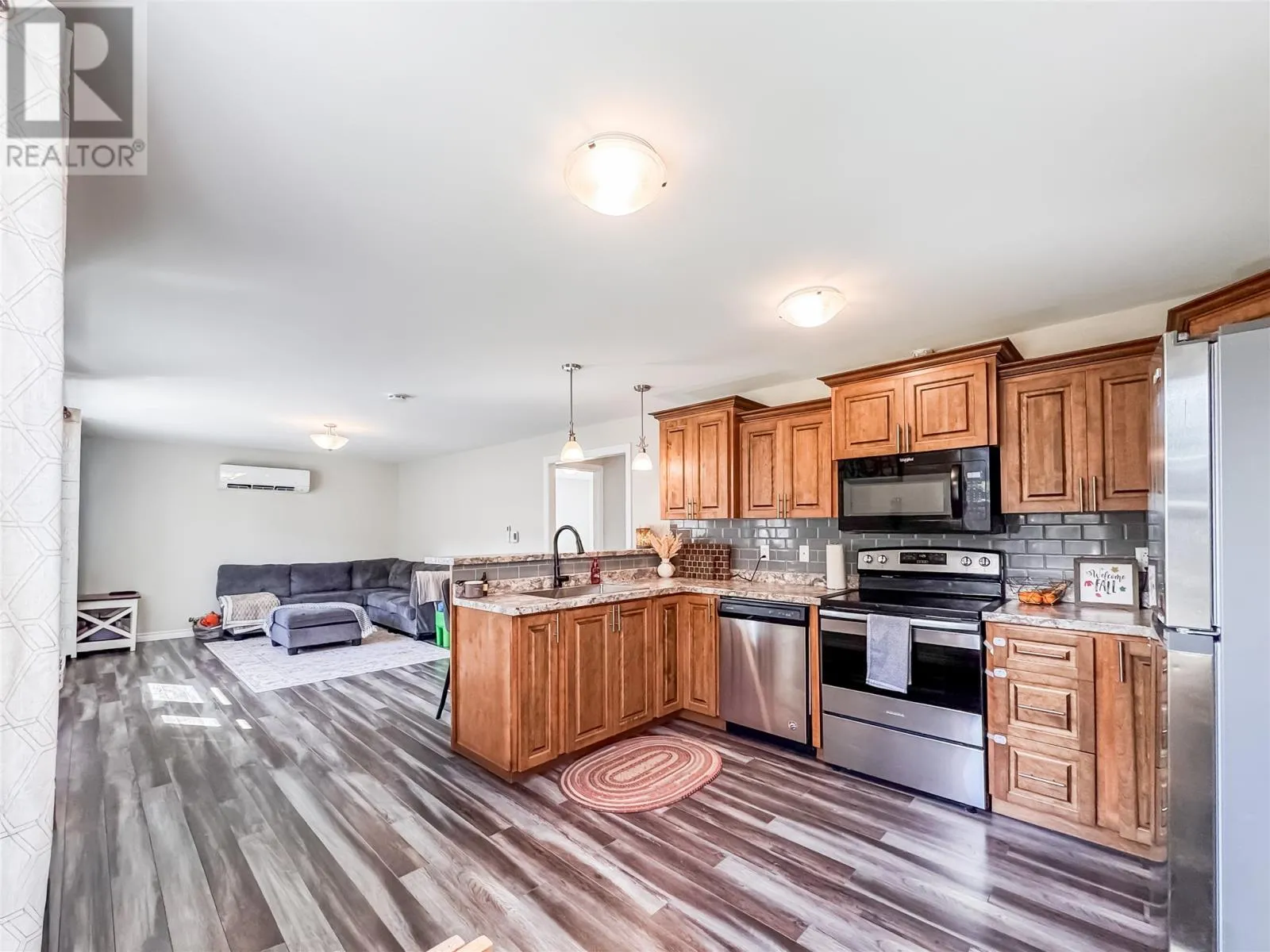 This beautifully updated bungalow in scenic Burin Bay Arm is truly move-in ready and perfect for anyone looking for a low-maintenance lifestyle. Step inside to a bright, open-concept layout featuring a stunning kitchen with stainless steel appliances, a subway tile backsplash, and a convenient breakfast barâideal for both everyday living and entertaining. The spacious living room is filled with natural light and showcases beautiful laminate flooring that flows seamlessly throughout. All three bedrooms are located at the rear of the home, offering peaceful views of Burin Bay. The full bathroom includes a tub/shower combo, and laundry is conveniently tucked away in the porch area behind bi-fold doors. Outside, enjoy a large deck and fenced in area with stairs leading up to the parking area. Recent upgrades in 2024 include a new mini split for energy-efficient heating and cooling, a new 125-amp breaker panel, and added insulation in the walk-in storage area underneath the house. Other features include PEX plumbing throughout and new shingles in 2020. Whether youâre a first-time buyer, downsizing, or looking for a turnkey investment, this home is ready for youâjust move in and enjoy! (id:27476)