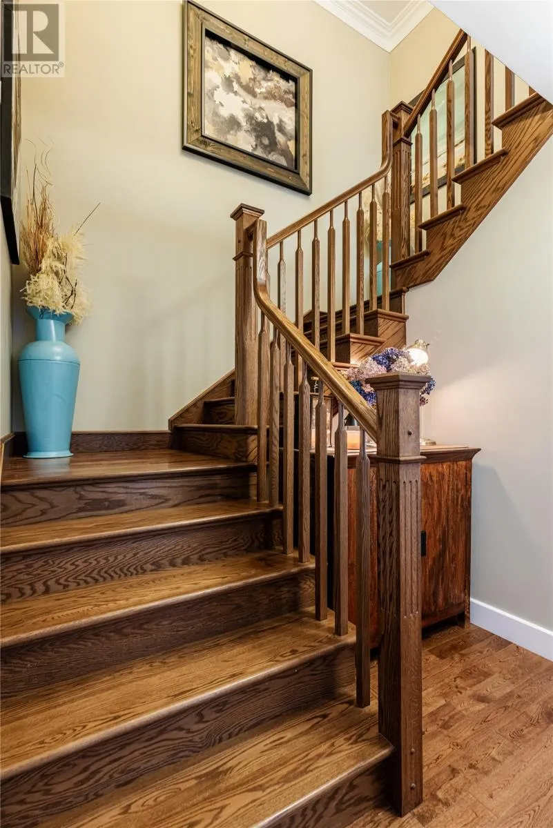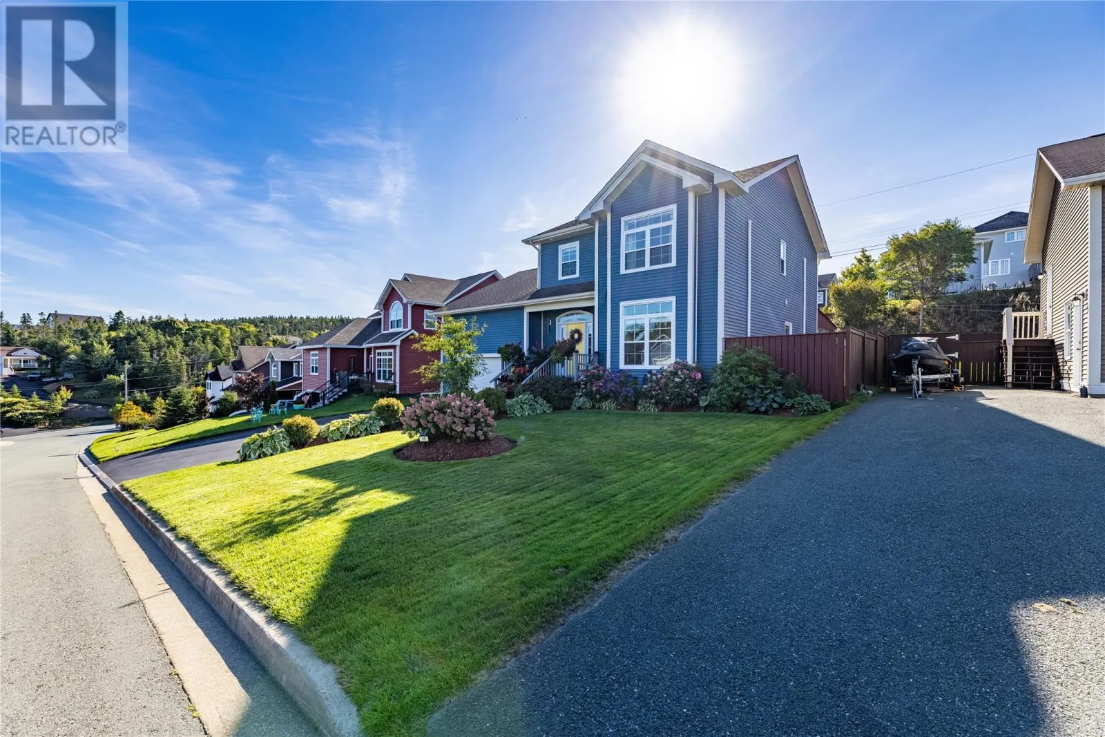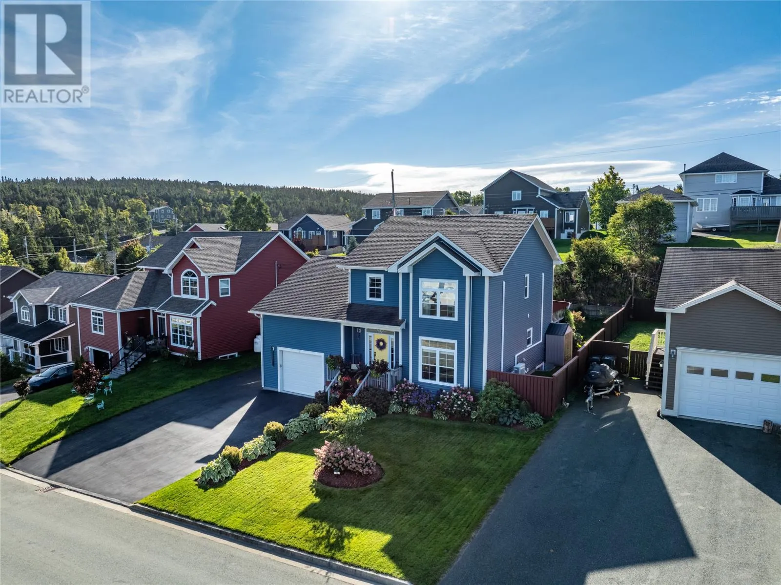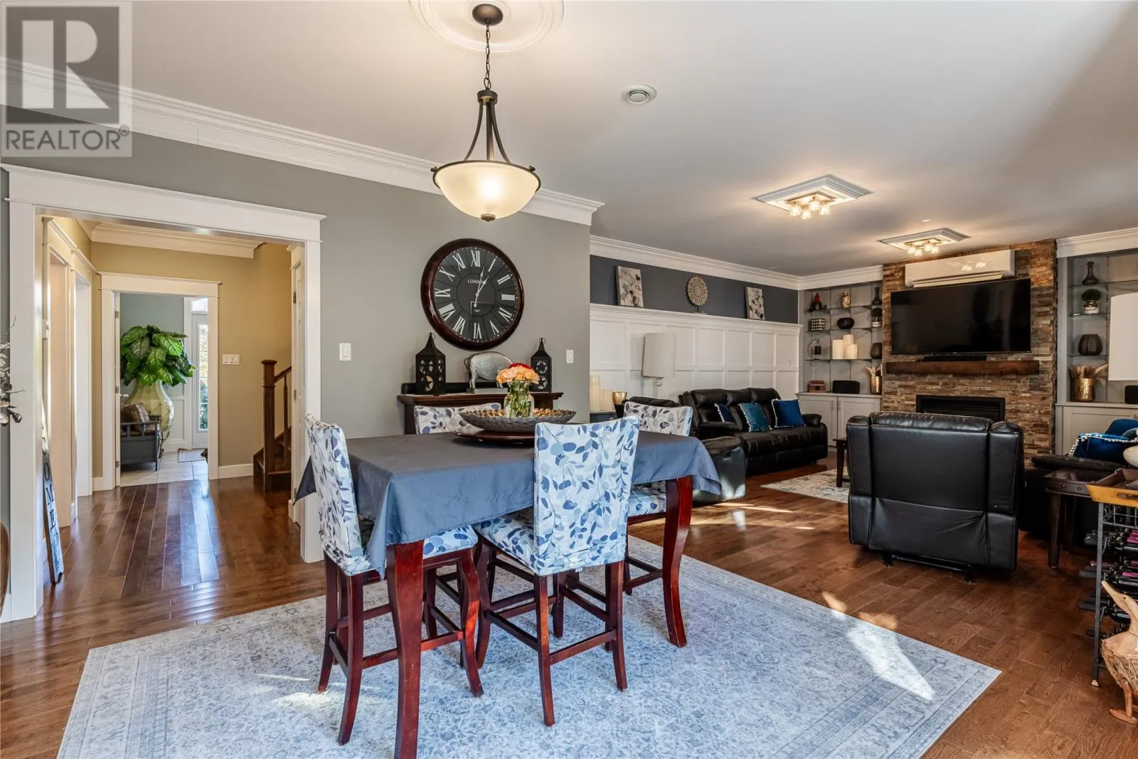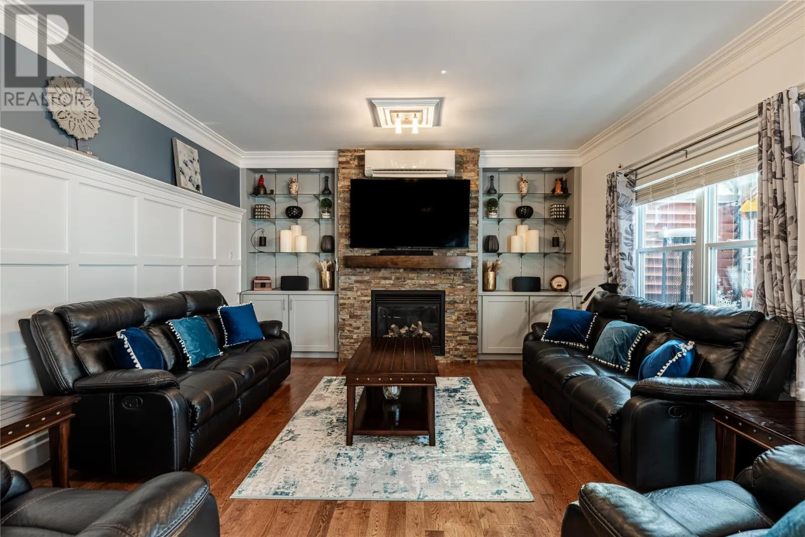 Pride of Ownership in Topsail â This beautifully maintained 5-bedroom, 3.5-bath home sits on a landscaped lot with plenty of curb appeal. The main floor features 9 ft ceilings, a welcoming porch, spacious dining room, half bath, and an open-concept kitchen with pantry (plus bar fridge), eating area, and living room with propane fireplace and custom shelving. Upstairs youâll find two large bedrooms, a main bath, and a bright primary suite with walk-in closet and ensuite.18 x 20 attached garage with fully developed basement with family room with electric fireplace, laundry, full bath, and two additional bedrooms. Extras include hardwood stairs, custom cove mouldings, wine cellar, and 3 mini-splits. The fenced backyard is a showstopper with two enclosed patio areas (one with hot tub), storage shed, and a large paved driveway for extra parking. Don't miss out on this one! (id:27476)