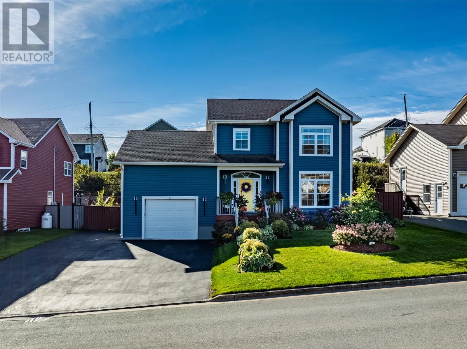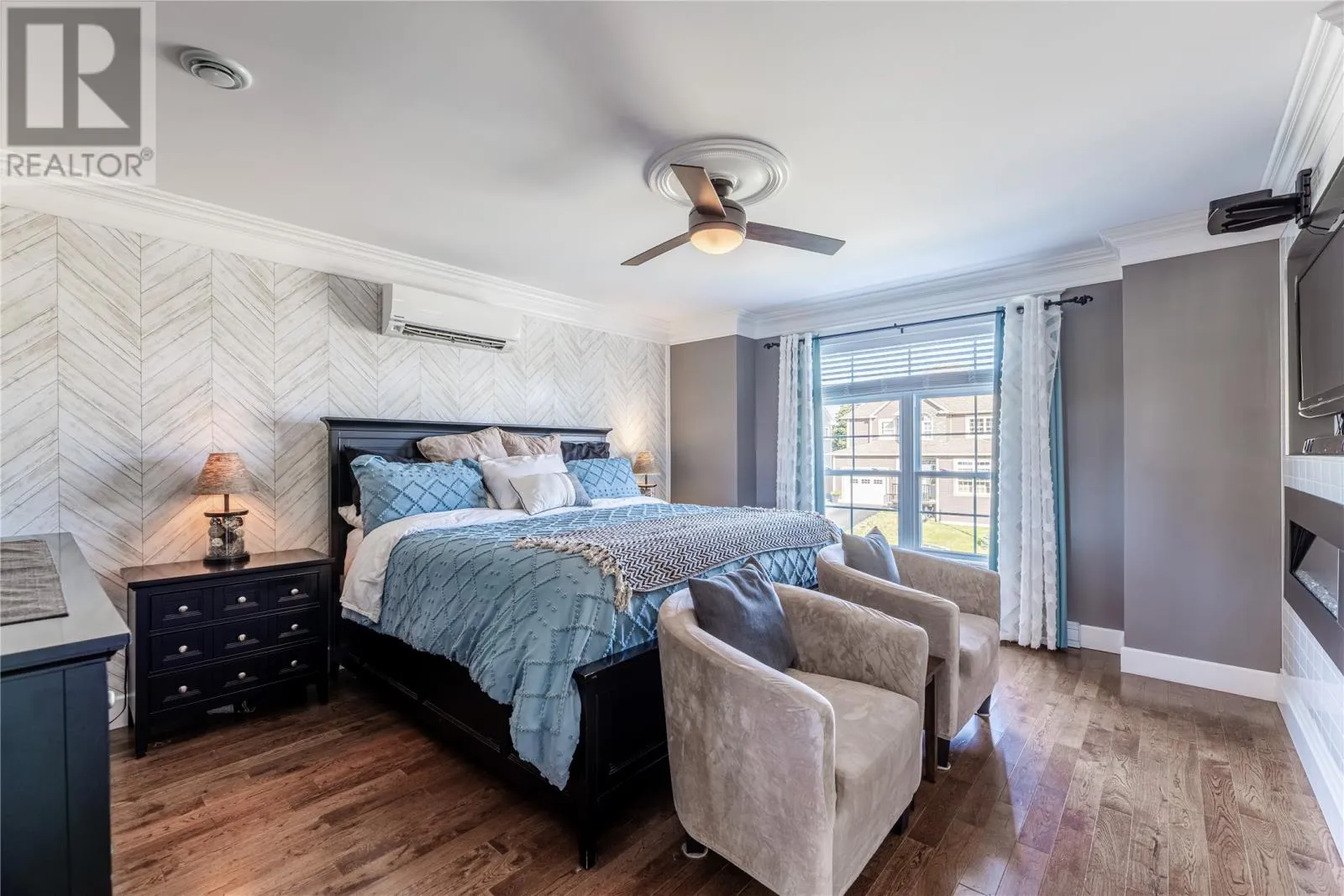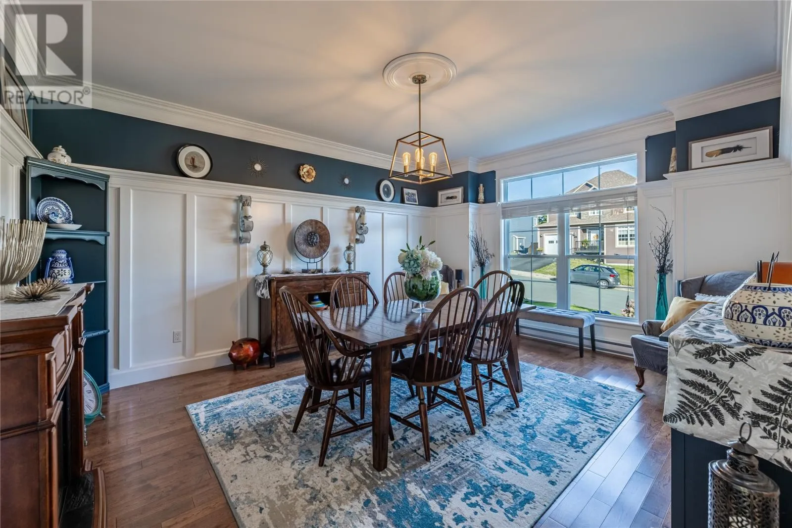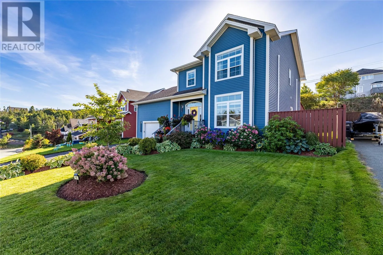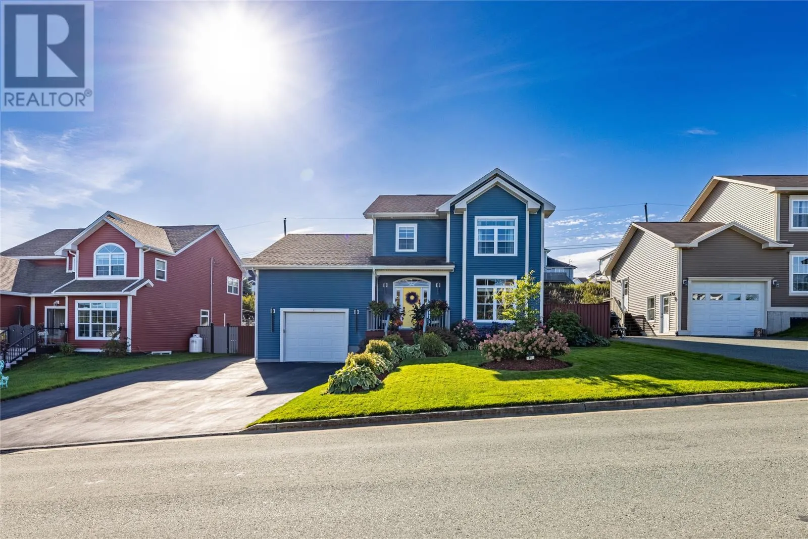 Pride of Ownership in Topsail â This beautifully maintained 5-bedroom, 3.5-bath home sits on a landscaped lot with plenty of curb appeal. The main floor features 9 ft ceilings, a welcoming porch, spacious dining room, half bath, and an open-concept kitchen with pantry (plus bar fridge), eating area, and living room with propane fireplace and custom shelving. Upstairs youâll find two large bedrooms, a main bath, and a bright primary suite with walk-in closet and ensuite.18 x 20 attached garage with fully developed basement with family room with electric fireplace, laundry, full bath, and two additional bedrooms. Extras include hardwood stairs, custom cove mouldings, wine cellar, and 3 mini-splits. The fenced backyard is a showstopper with two enclosed patio areas (one with hot tub), storage shed, and a large paved driveway for extra parking. Don't miss out on this one! (id:27476)