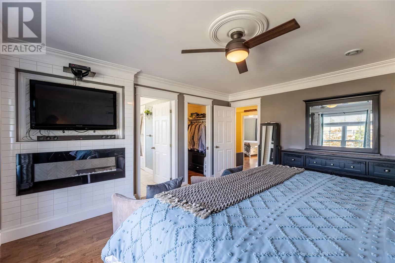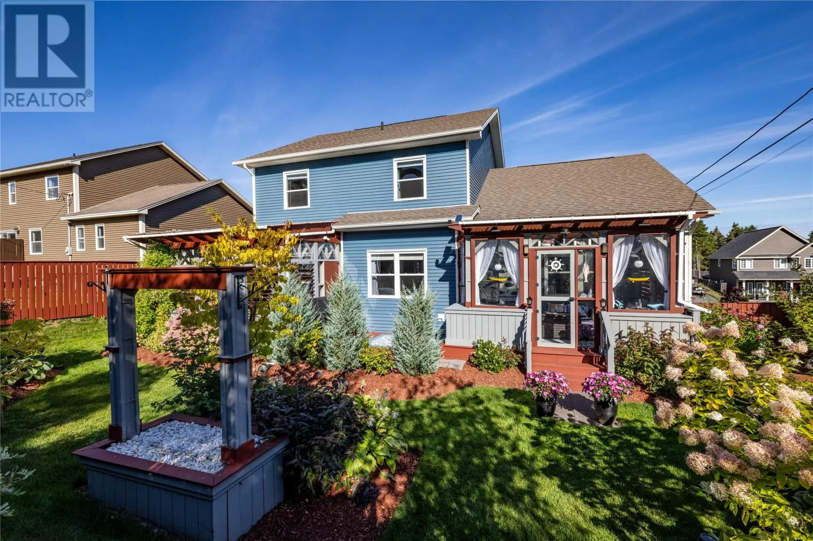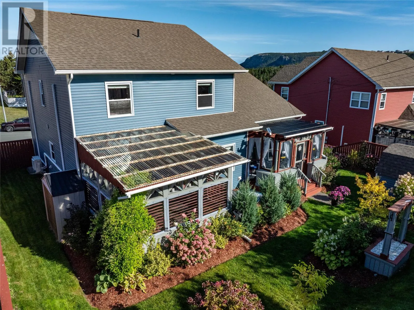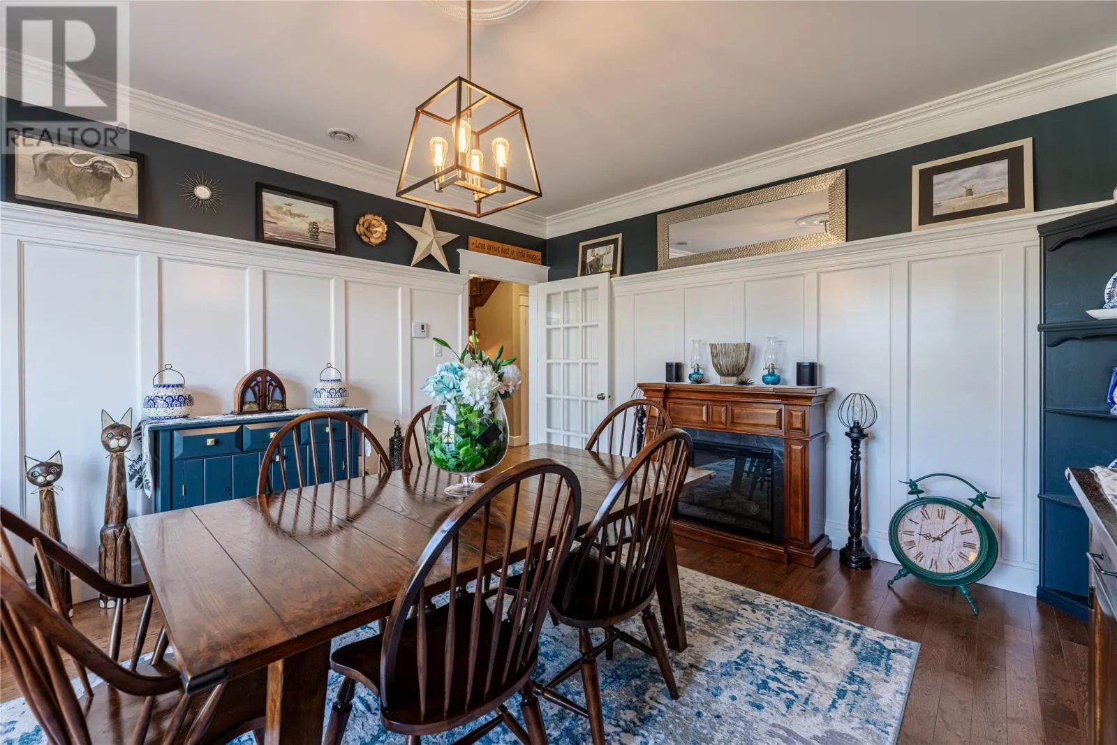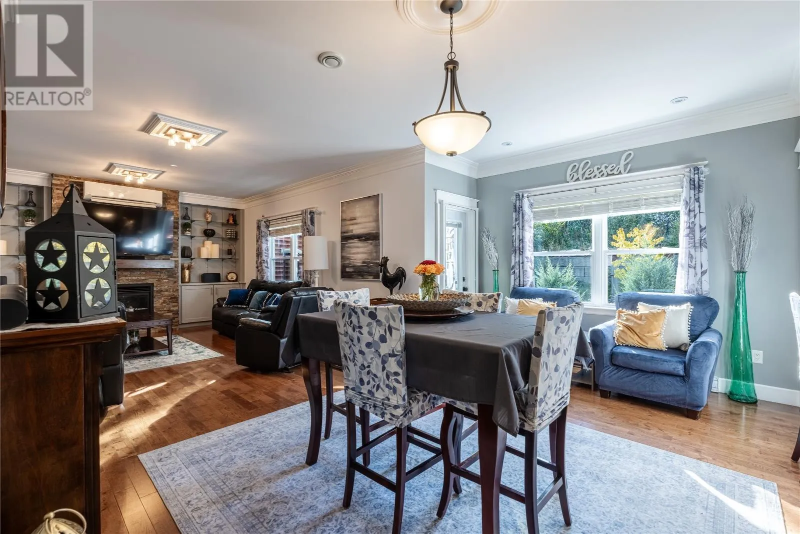 Pride of Ownership in Topsail â This beautifully maintained 5-bedroom, 3.5-bath home sits on a landscaped lot with plenty of curb appeal. The main floor features 9 ft ceilings, a welcoming porch, spacious dining room, half bath, and an open-concept kitchen with pantry (plus bar fridge), eating area, and living room with propane fireplace and custom shelving. Upstairs youâll find two large bedrooms, a main bath, and a bright primary suite with walk-in closet and ensuite.18 x 20 attached garage with fully developed basement with family room with electric fireplace, laundry, full bath, and two additional bedrooms. Extras include hardwood stairs, custom cove mouldings, wine cellar, and 3 mini-splits. The fenced backyard is a showstopper with two enclosed patio areas (one with hot tub), storage shed, and a large paved driveway for extra parking. Don't miss out on this one! (id:27476)