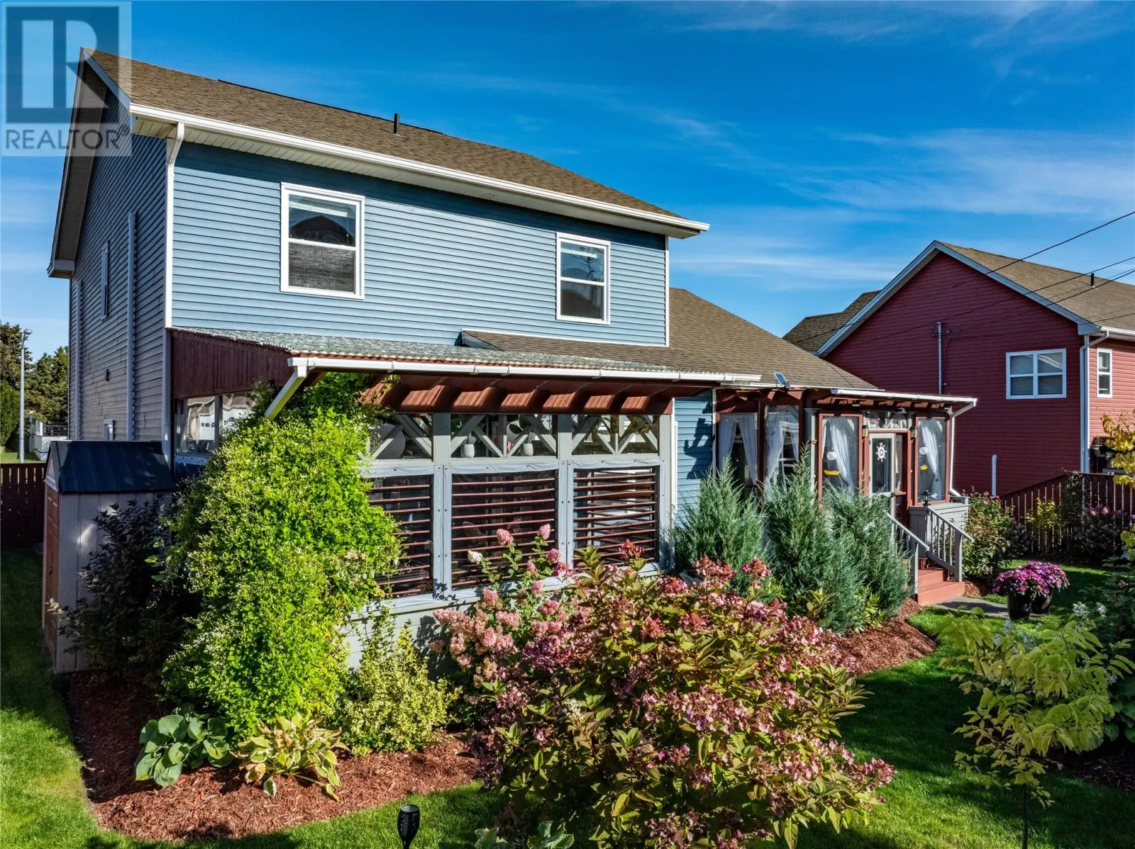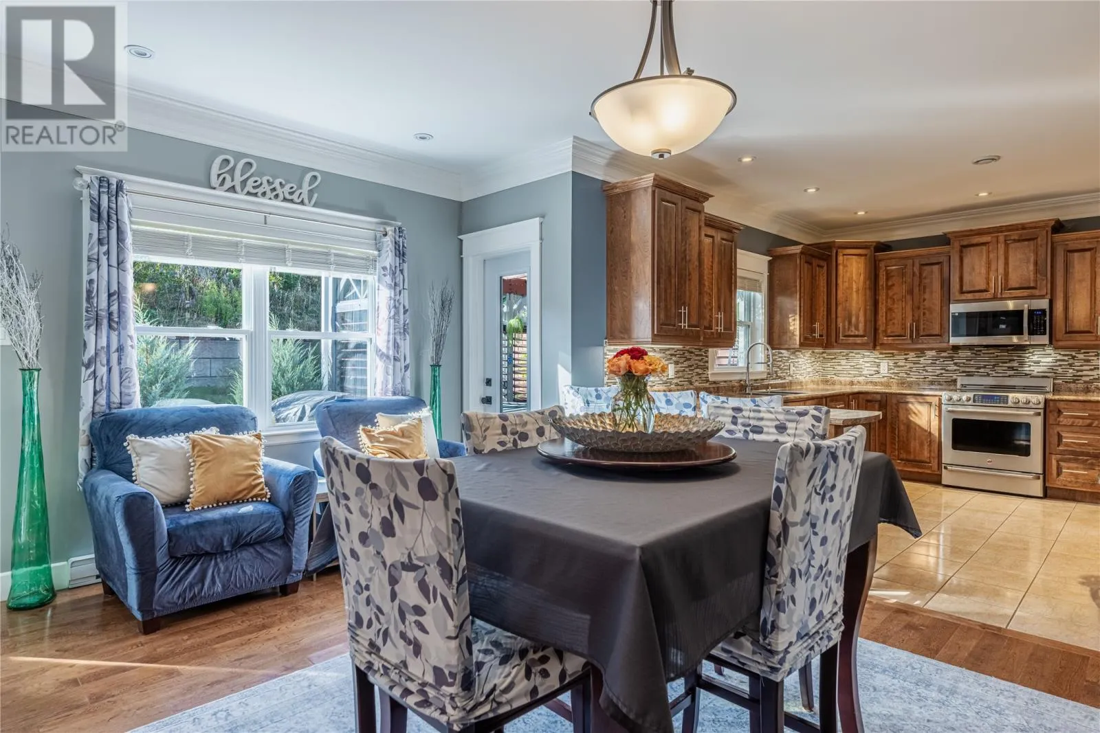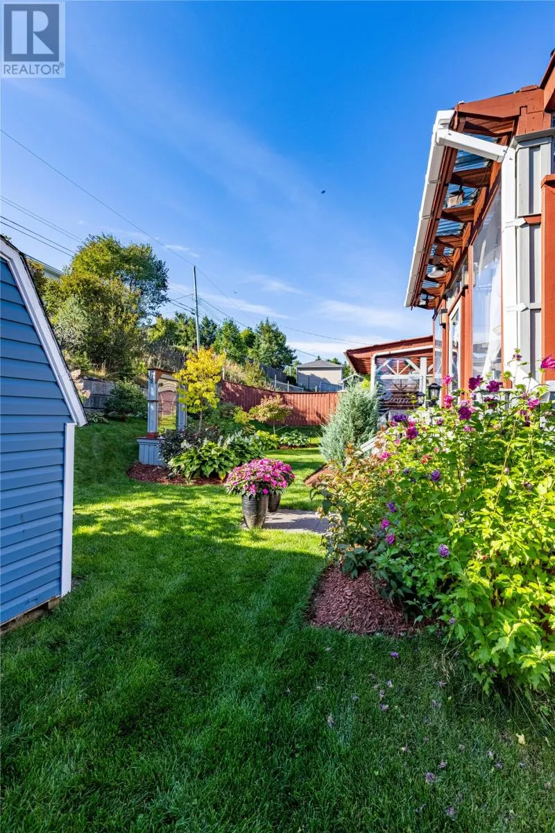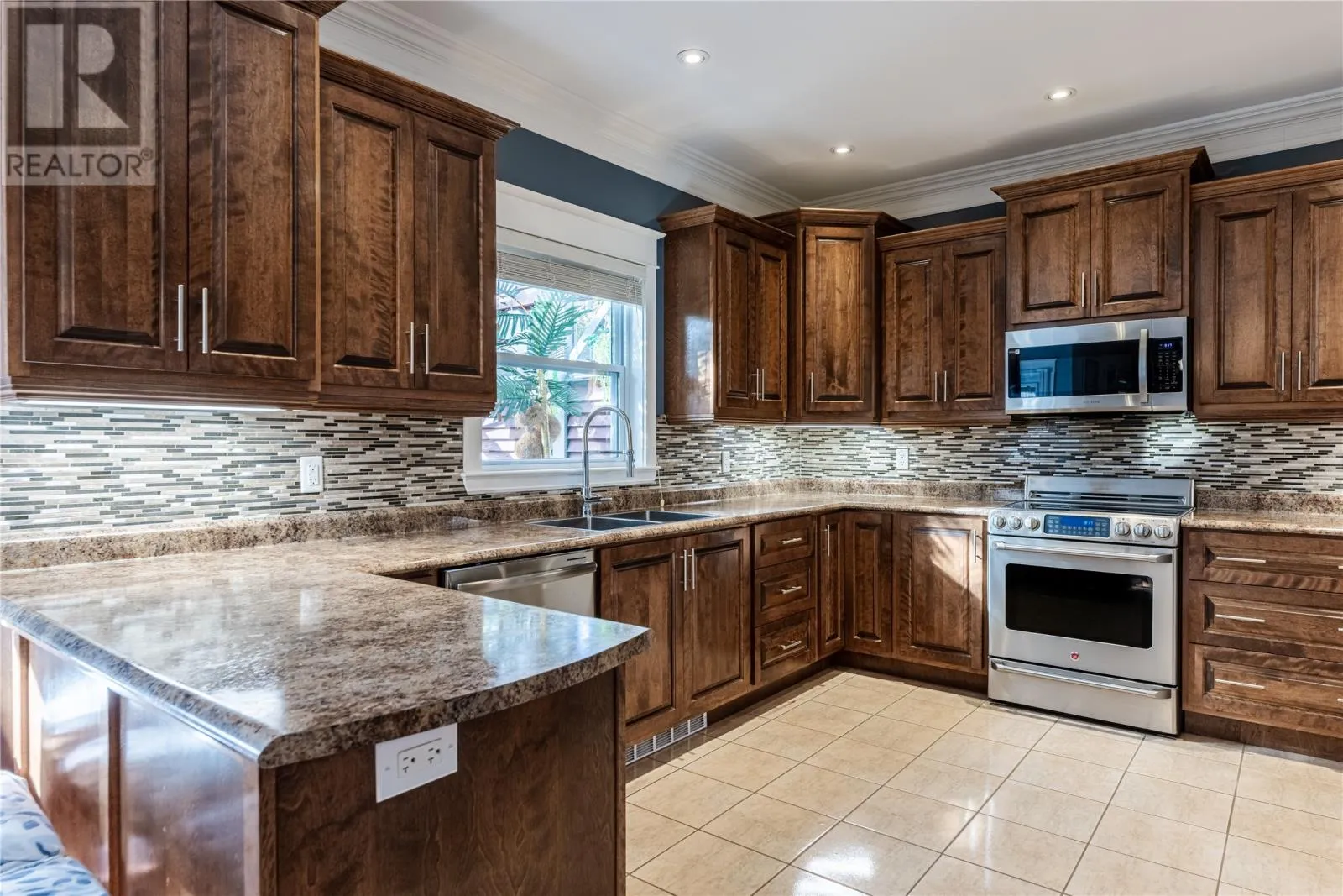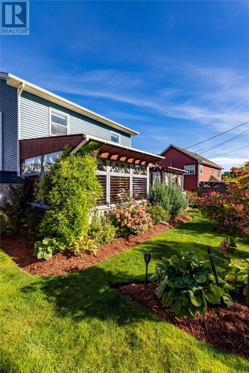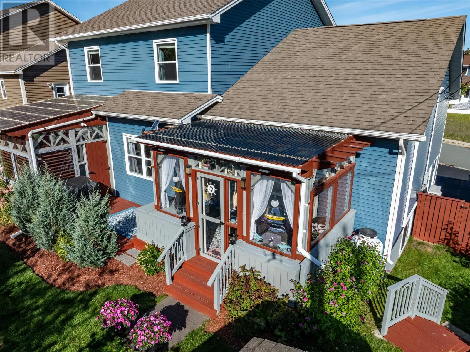 Pride of Ownership in Topsail â This beautifully maintained 5-bedroom, 3.5-bath home sits on a landscaped lot with plenty of curb appeal. The main floor features 9 ft ceilings, a welcoming porch, spacious dining room, half bath, and an open-concept kitchen with pantry (plus bar fridge), eating area, and living room with propane fireplace and custom shelving. Upstairs youâll find two large bedrooms, a main bath, and a bright primary suite with walk-in closet and ensuite.18 x 20 attached garage with fully developed basement with family room with electric fireplace, laundry, full bath, and two additional bedrooms. Extras include hardwood stairs, custom cove mouldings, wine cellar, and 3 mini-splits. The fenced backyard is a showstopper with two enclosed patio areas (one with hot tub), storage shed, and a large paved driveway for extra parking. Don't miss out on this one! (id:27476)