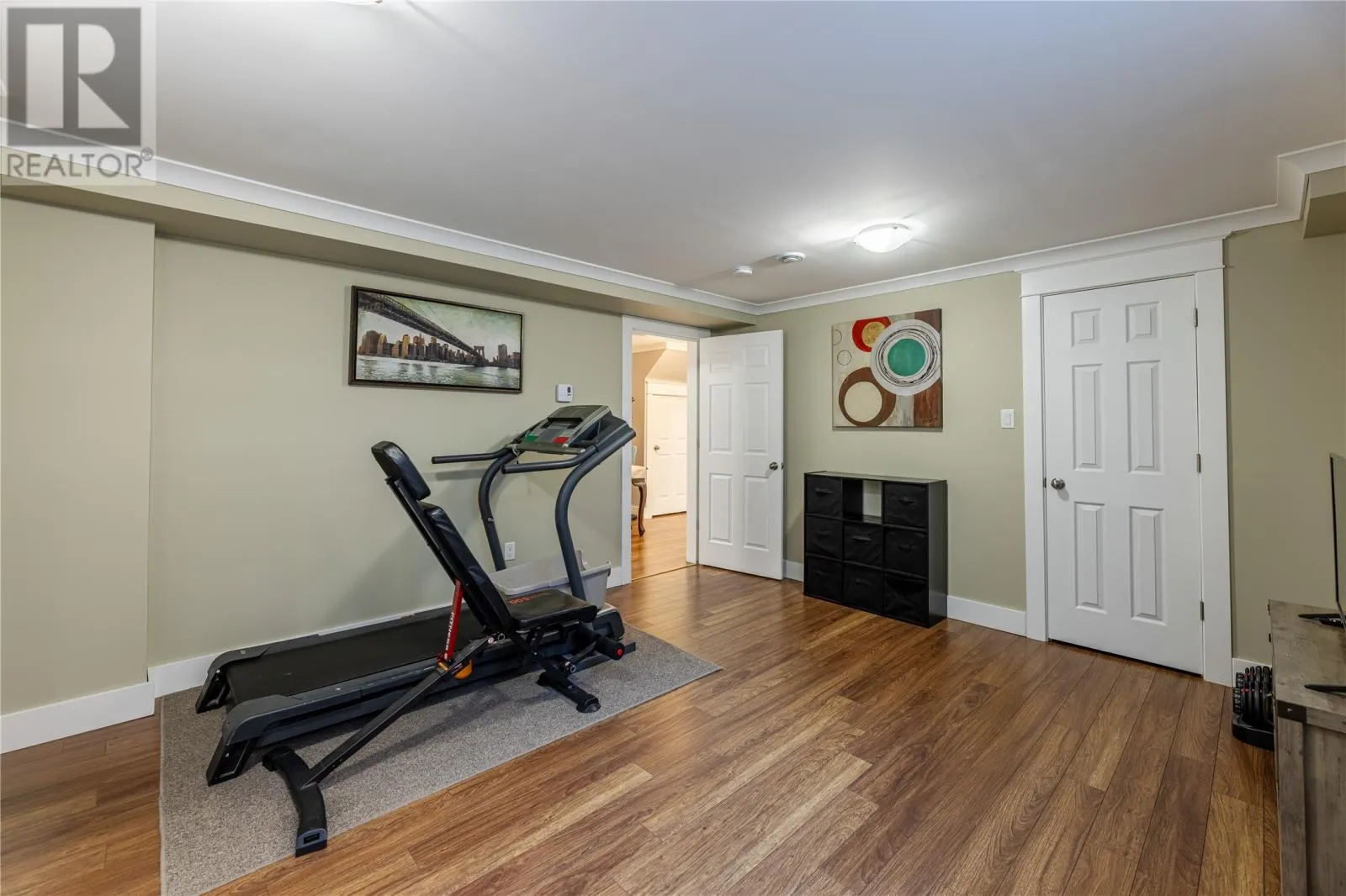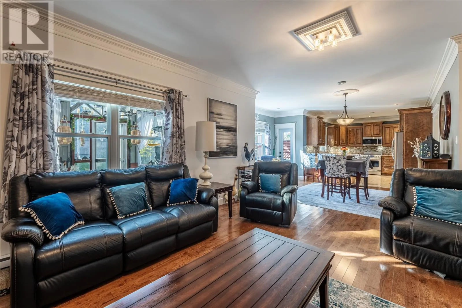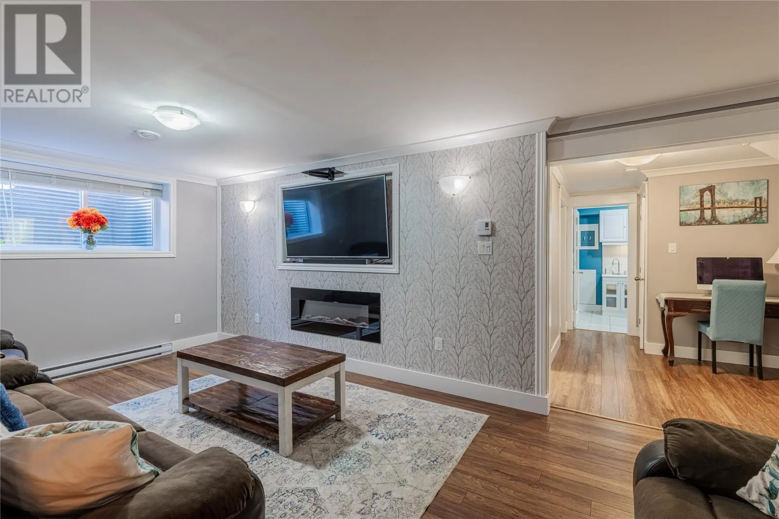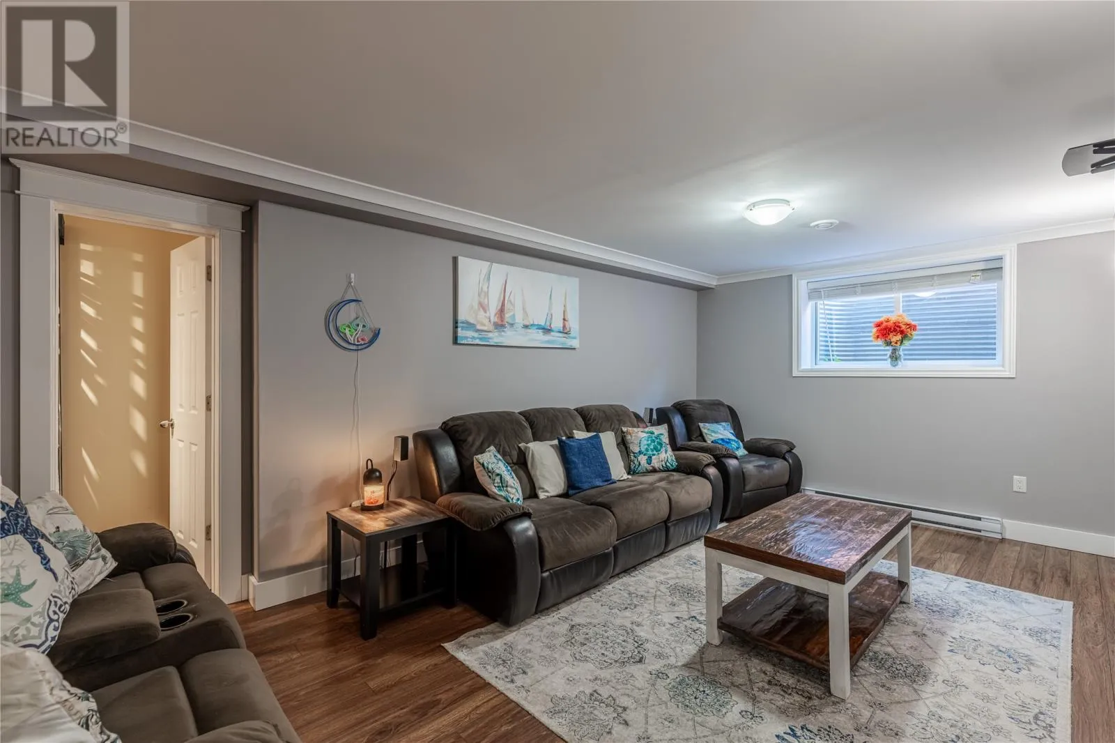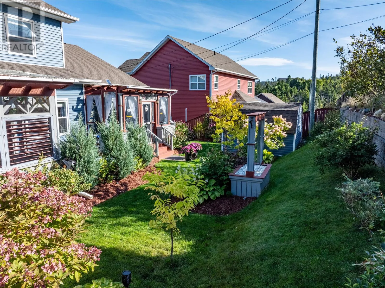 Pride of Ownership in Topsail â This beautifully maintained 5-bedroom, 3.5-bath home sits on a landscaped lot with plenty of curb appeal. The main floor features 9 ft ceilings, a welcoming porch, spacious dining room, half bath, and an open-concept kitchen with pantry (plus bar fridge), eating area, and living room with propane fireplace and custom shelving. Upstairs youâll find two large bedrooms, a main bath, and a bright primary suite with walk-in closet and ensuite.18 x 20 attached garage with fully developed basement with family room with electric fireplace, laundry, full bath, and two additional bedrooms. Extras include hardwood stairs, custom cove mouldings, wine cellar, and 3 mini-splits. The fenced backyard is a showstopper with two enclosed patio areas (one with hot tub), storage shed, and a large paved driveway for extra parking. Don't miss out on this one! (id:27476)