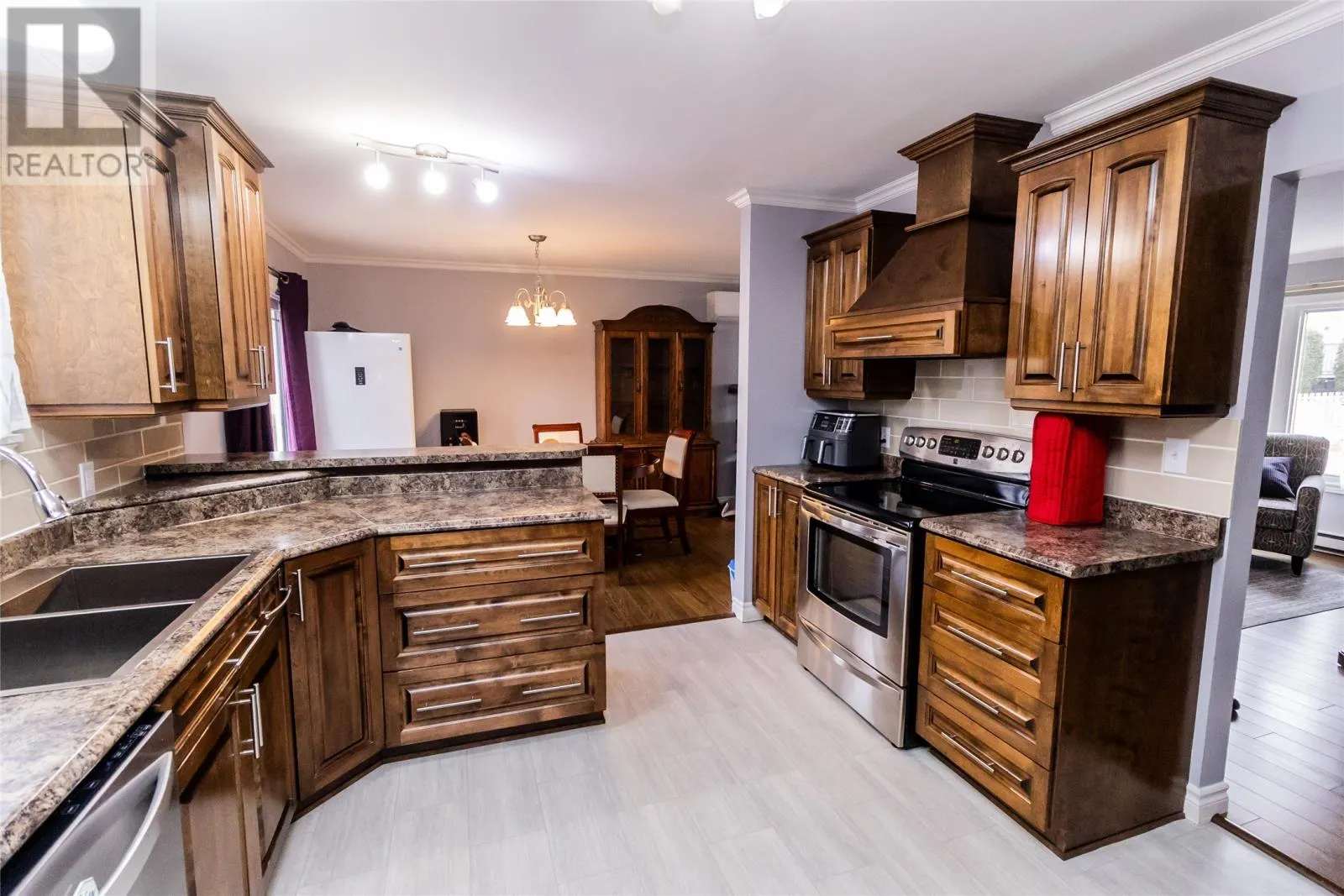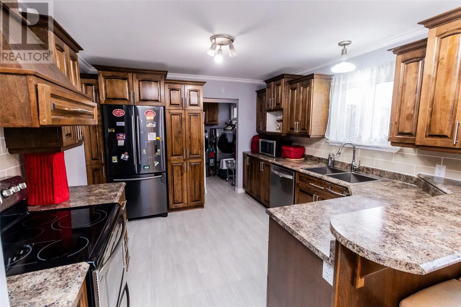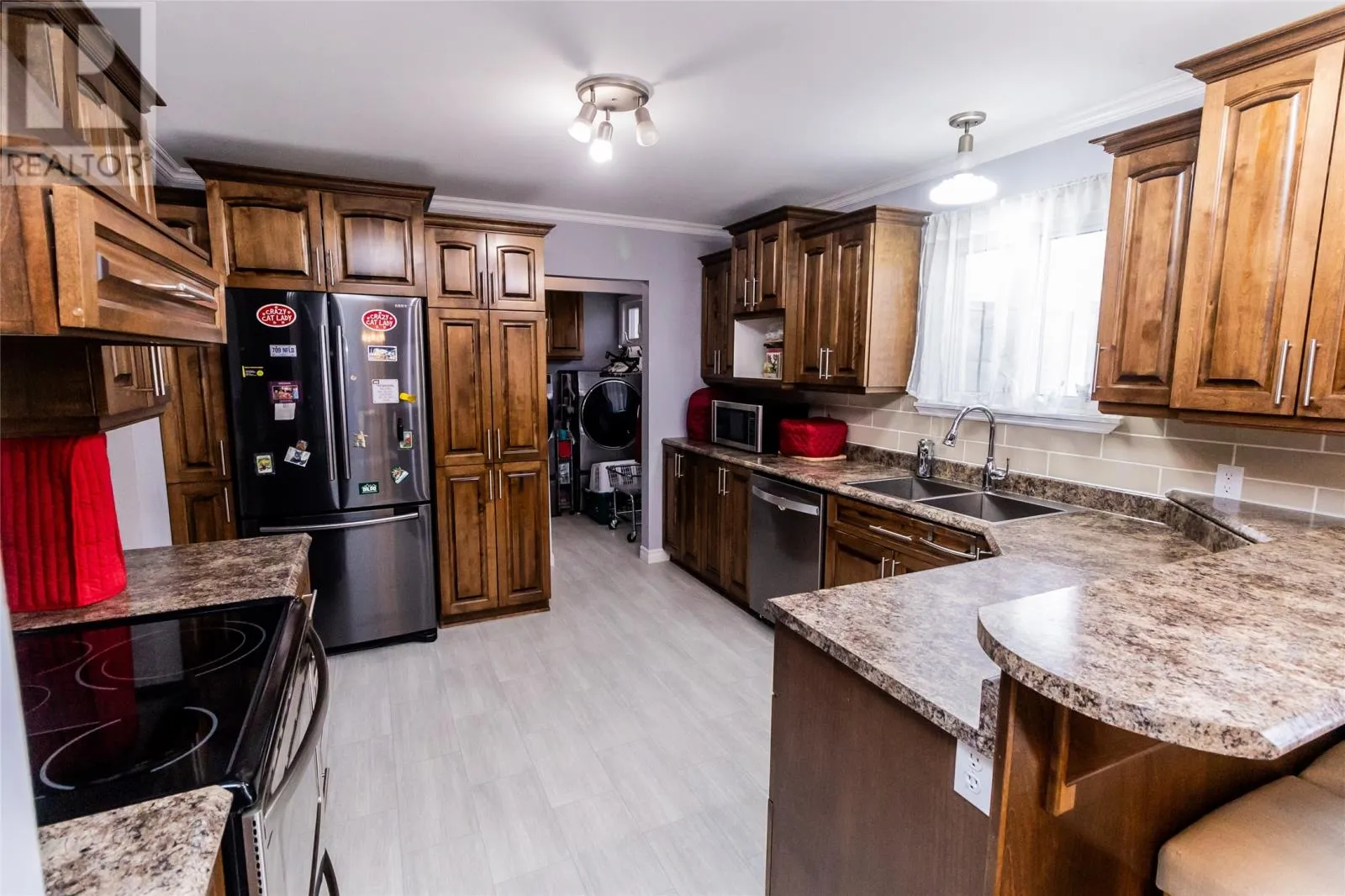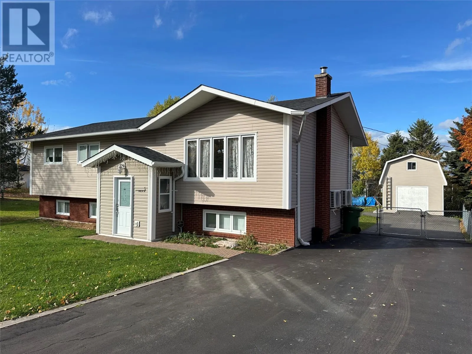 Welcome to this beautifully maintained three bedroom, two bathroom split entry home in the heart of Deer Lake - just minutes from town site amenities. Set on a landscaped 75x144 lot, the property features a large paved driveway extending to the 16x20 shed with loft - perfect for storage. The backyard offers ample space and privacy, along with a newly built back deck. Iinside, the inviting front porch addition leads to a bright main level with a traditional modern kitchen with stainless steel appliances, an open dining area and convenient main floor laundry. From the kitchen area, step into the sun-filled new sunroom, a perfect space to relax! The main floor also includes two comfortable bedrooms, a spacious living room and a large main floor bathroom. The lower basement level offers a cozy family room with a wood stove, a third bedroom, 3PC bath and plenty of storage with access to the backyard. Recent upgrades include: patio/sunroom, shingles 2021, kitchen flooring, two heat pumps 2021, some electric heaters replaced 2021, 80% of the basement subfloor and flooring have been replaced, six new basement windows, shingles 2021, front porch add on, driveway extension. This move in ready home combines comfort, functionality and great curb appeal. Don't delay - call today for your personal showing! (id:27476)