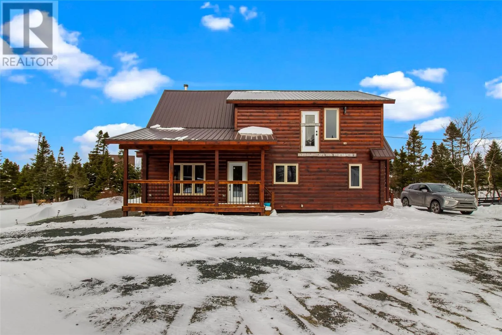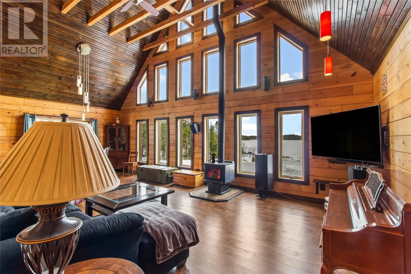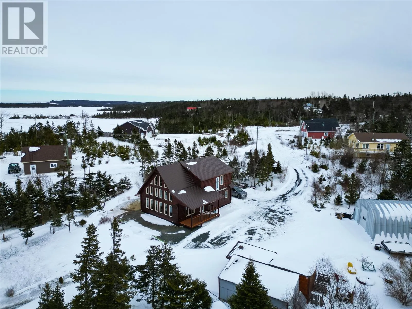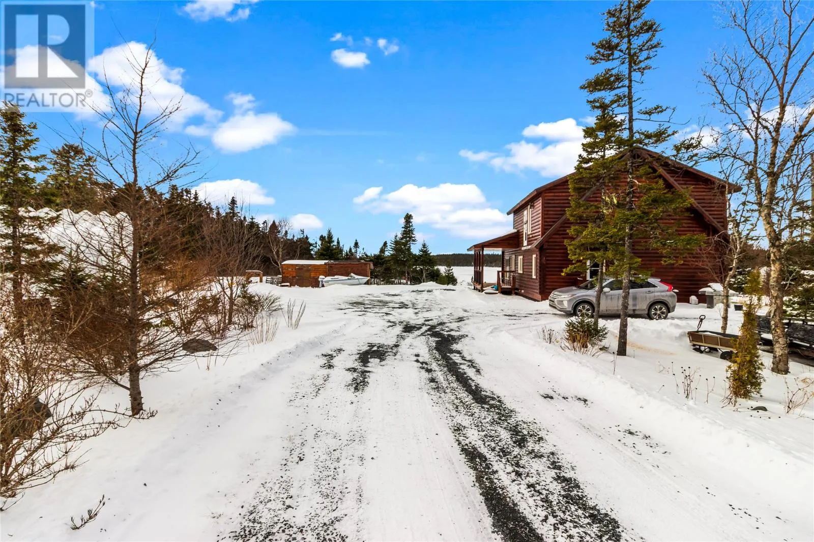Custom-built by Adventure Log Homes, this extraordinary property is positioned on highly sought-after Grand Pond (just 2 km off the highway), offering a rare blend of refined craftsmanship, natural beauty, and timeless luxury. Inside, the home showcases striking two-tone wood finishes throughout, creating warmth, depth, and architectural interest. The porch welcomes you with a coat closet, laundry area, and full bathroom. The main level is designed for both everyday comfort and upscale entertaining, featuring a bright open-concept layout with soaring windows that frame breathtaking pond views. The kitchen is both elegant and functional, highlighted by an island with cooktop and bar fridge, flowing seamlessly into the dining area and the living room. Here, a cozy wood stove anchors the space, creating an inviting atmosphere while the many windows bring the outdoors in. The primary bedroom is conveniently located on the main floor and offers a private retreat complete with full ensuite. The loft level features two spacious bedrooms, a full bathroom, and a generous landing area ideal for a sitting lounge, games space, or home office â all overlooking the tranquil water below, enhancing the homeâs serene and luxurious ambiance. Set on a large, private lot with direct pond frontage and access, this property is designed for elevated outdoor living. Enjoy your own wharf and launching area, along with additional space to relax and take in the scenery. A 25x25 detached garage offers ample room for vehicles, recreational toys, and storage, complemented by a separate shed. Additional premium features include a durable tin roof, artesian well, and countless custom design details throughout. Elegant, peaceful, and impeccably crafted, this exceptional waterfront log home delivers a luxury lifestyle rarely found. (id:27476)