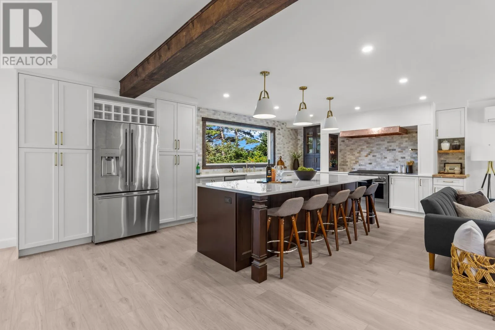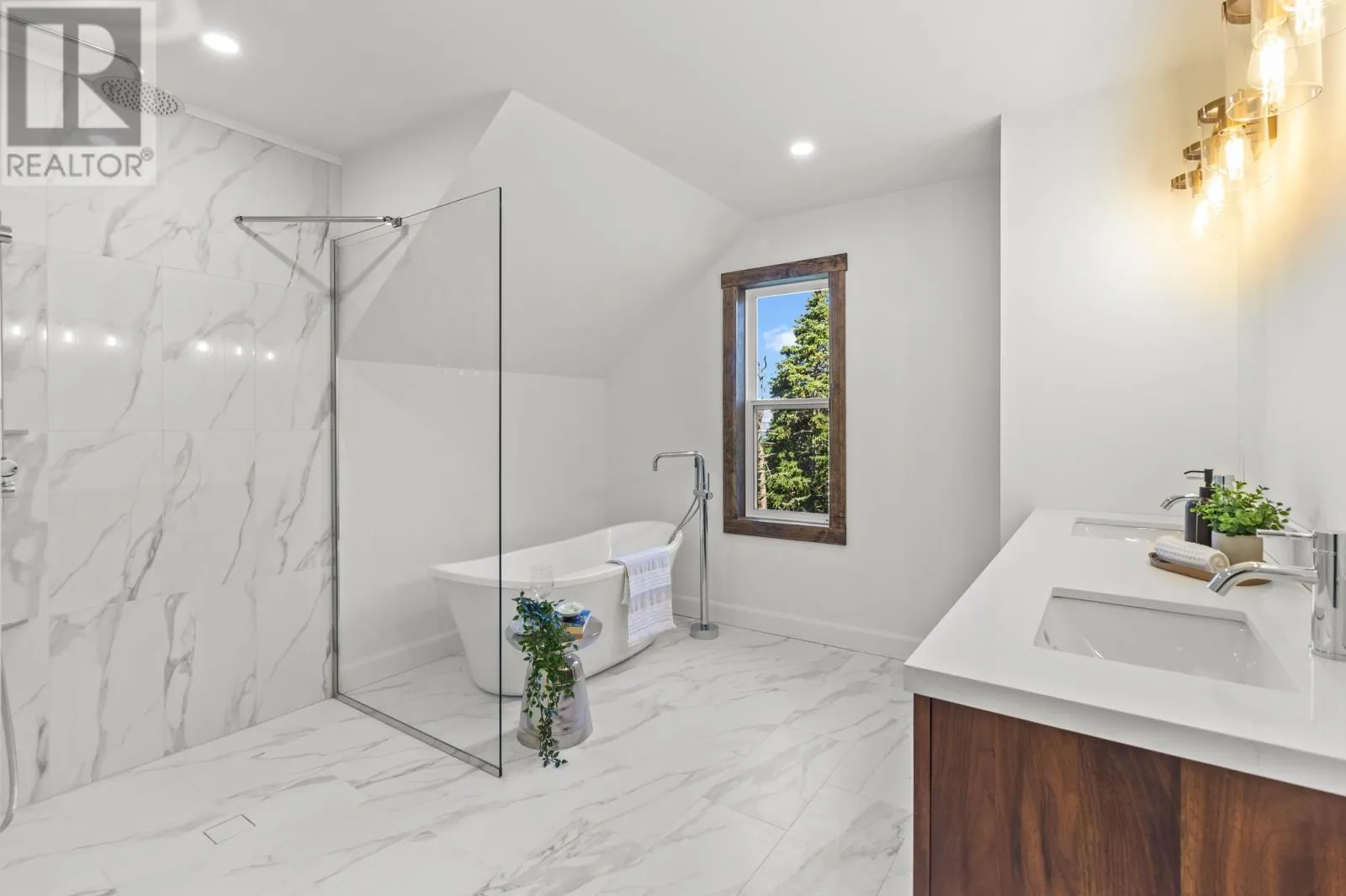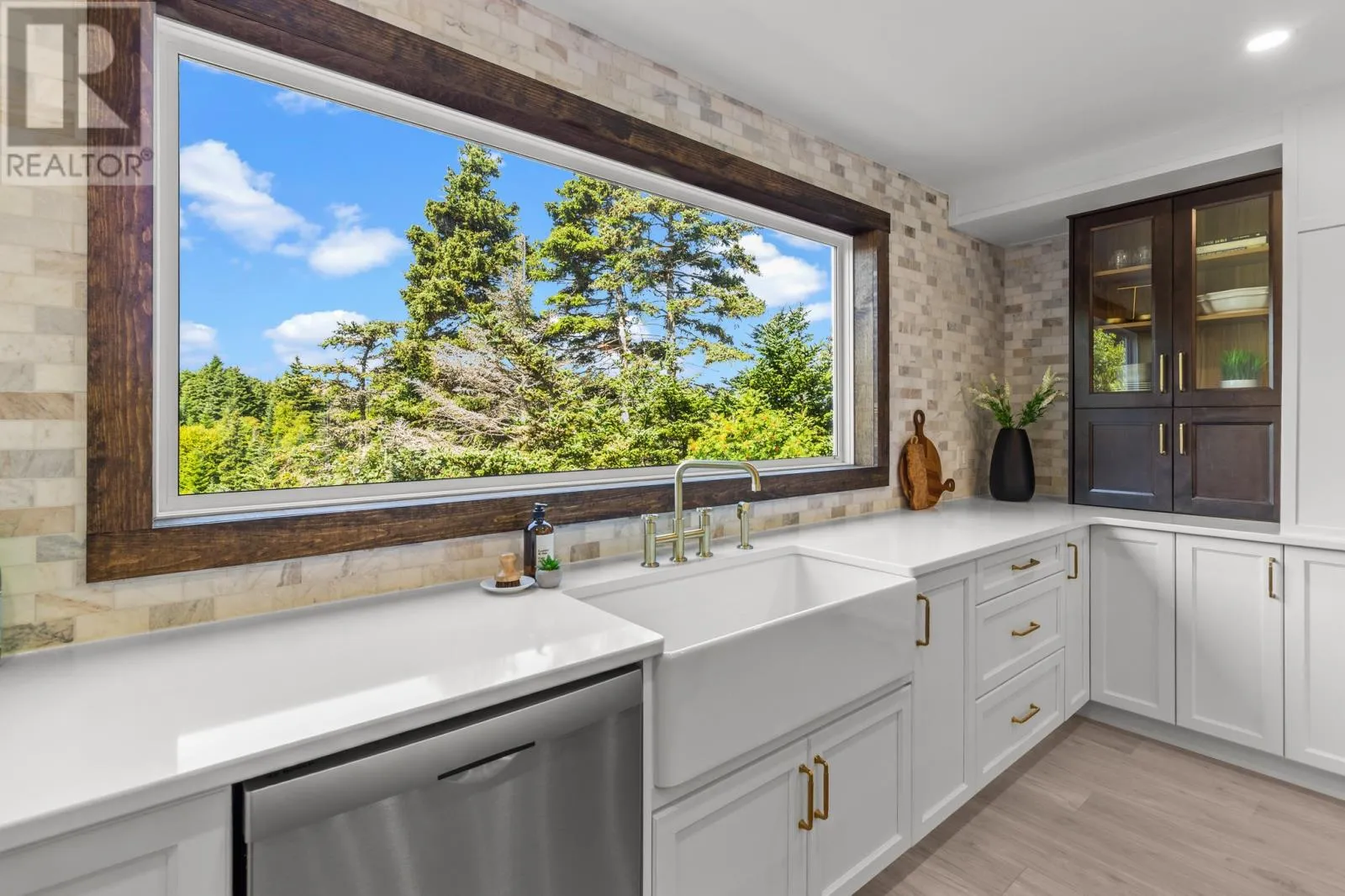 Welcome to 615 Marine Drive, a distinguished neighbourhood where timeless elegance meets modern coastal living. Nestled on a private, over one-acre treed estate complete with ocean views, this 4,100 sq. ft. masterpiece was stripped to the studs and completely reimagined for the most discerning buyer. The heart of the home is a bespoke chefâs kitchen with a striking marble backsplash, handcrafted copper range hood, double fridge, gas range, and coffee bar perfectly blending artistry and function. An abundance of windows and double sliding patio doors flood the interior with natural light, creating a bright and airy flow throughout. Upstairs, the primary suite rivals a five-star retreat. A spa-inspired ensuite with a freestanding soaker tub, a floor-to-ceiling seamless tiled shower, dual vanities, and a custom walk-in closet worthy of a boutique hotel. Three additional bedrooms share a beautifully appointed main bath with a double vanity and opulent tiled bath and shower. The fully finished lower level offers endless possibilities. Complete with a stylish custom bar and lounge space, it also features an additional bedroom, guest bath with standalone tiled shower, and space for a home theatre or gym. Outdoors, an expansive patio sets the stage for sunset cocktails and al fresco dining while overlooking the wild Atlantic, and the detached double garage provides both an estate-like quality and convenience. With all new windows, roofing, and electrical, upgraded plumbing, and an entirely redesigned interior layout, this home combines the peace of mind of a brand-new build with the prestige of coastal living. 615 Marine Drive - a rare opportunity to own Outer Cove luxury at its finest. Vendor is a realtor. (id:27476)