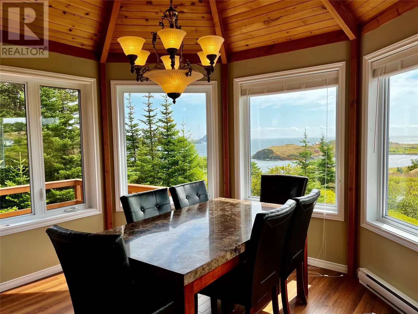 Big House up on the Hill over looking the Brewing Million Dollar View even from the Lower Level. Bright and full of windows. Hardly touched but loved from afar, this immaculate Gem is a must-see. Welcome home or escape to your next paradise. In the heart of Port Rexton lies an elegant estate built by Architect Frank La Pointe. Overlooking the Ocean and Fox Island, nestled above the Bay next to a tranquil small forest by Robin Hood Cove. Excellent location can walk to Post Office, Iconic Port Rexton Brewery and craft beer pub, liquor store and gas. 8km to Trinity. 2017 Interior finishes including 2 massive bedrooms, one master with ensuite and the other a Hollywood. Galley Kitchen, new Bosch Dishwasher and double cast iron sink. Custom maple Cabinets throughout the main. New Washer/dryer with main floor laundry. Heated by electricity with independent thermostats for comfort and regulation. The basement contains ceramic floor and has a separate entrance that could be considered suitable for an in-law suite or 1 bedroom rental. Contains a workshop, Garage, storage, and closet. The shed is Large and matching clapboard, complete with an Antique window. Additional assets to this home are numerous high-end fixtures throughout the home, blinds and valences, All high-end new Cherry Wood Furniture, new mattresses, a New Zealand wool rug, furniture, leather recliners, tv, a patio set, extra slate for landscaping and plenty of extras such as ceramic tile in the garage. Close to #1 of top 10 in Canada Skerwink Trail. (id:27476)