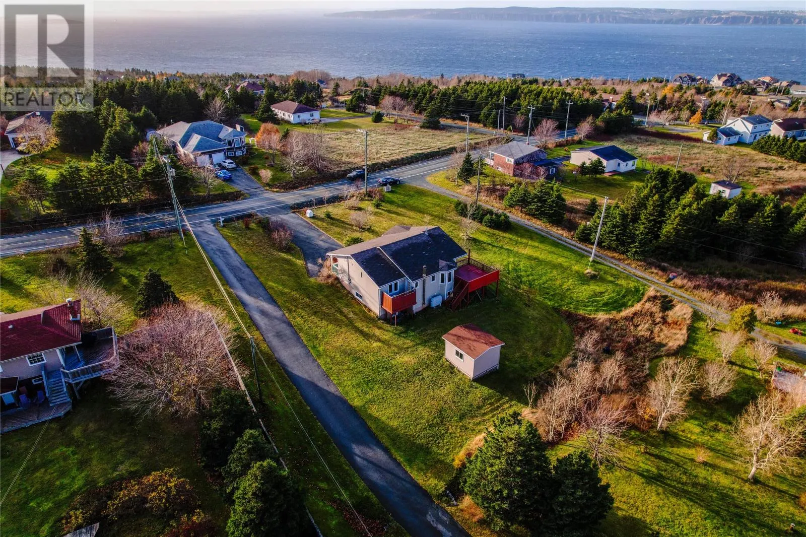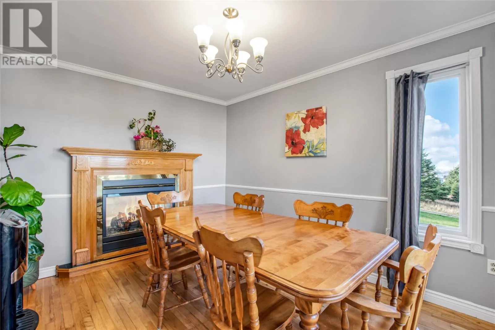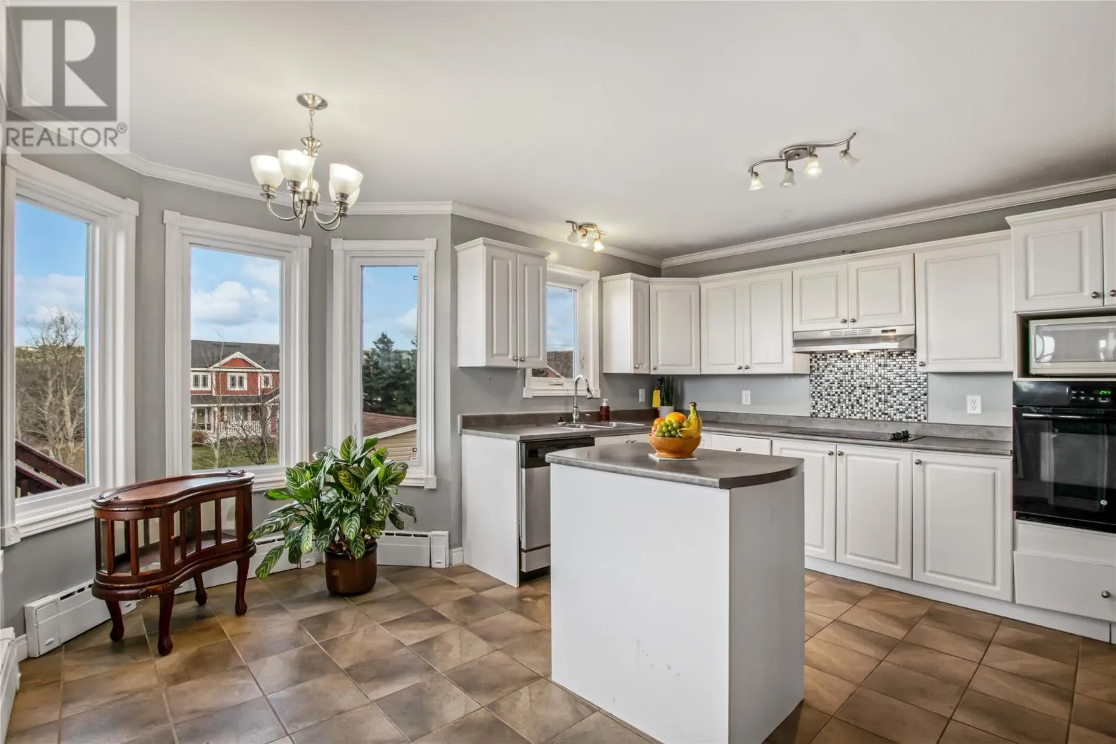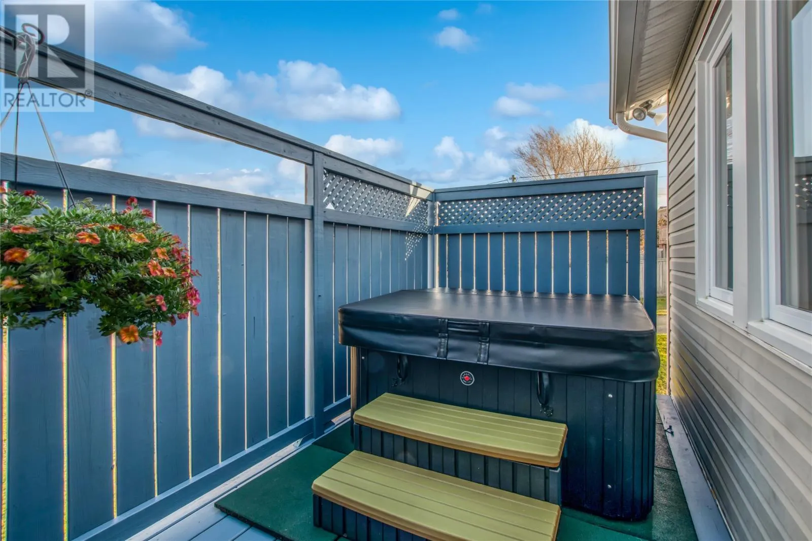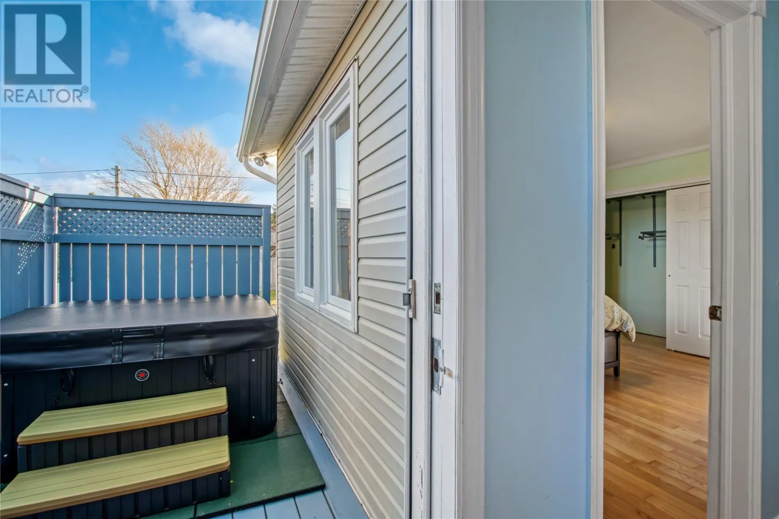 Located in a sought-after, family-friendly area of Portugal CoveâSt. Philips, this well-maintained bungalow offers space, comfort, and charm with oversized windows throughout, filling the interior with natural light and frame stunning ocean views toward Bell Island and Conception Bay South! The bright and spacious main floor features a welcoming layout, including a large living room with recently updated hardwood flooring and a dual-sided propane fireplace shared with the separate dining room. The eat-in kitchen includes an adjoining laundry/pantry room for added convenience, along with direct access to the expansive rear patio and gardenâperfect for entertaining or relaxing outdoors. The main level includes three spacious bedrooms and a main family bathroom with a double vanity. The primary bedroom boasts a private ensuite and direct access to its own patio with a hot tub. The fully developed walk-out basement offers plenty of additional living space, featuring a large rec room with a wet bar and fireplace, two additional bedrooms, an office, powder room, and ample storage. Enjoy the comfort and efficiency of hot water radiation heat, complemented by a newly installed 3-head mini-split system for year-round temperature control. Other recent updates include a new electrical panel and hot tub (2022). Situated on a large, private lot set back from the road, this property combines peaceful surroundings with a convenient locationâan exceptional opportunity to enjoy coastal living in one of Portugal CoveâSt. Philipsâ most desirable neighborhoods. Don't wait! No conveyence of offers until Tuesday, November 18, 2025 @ 12:00pm (noon) and left open for acceptance until 5:00pm the same day (id:27476)