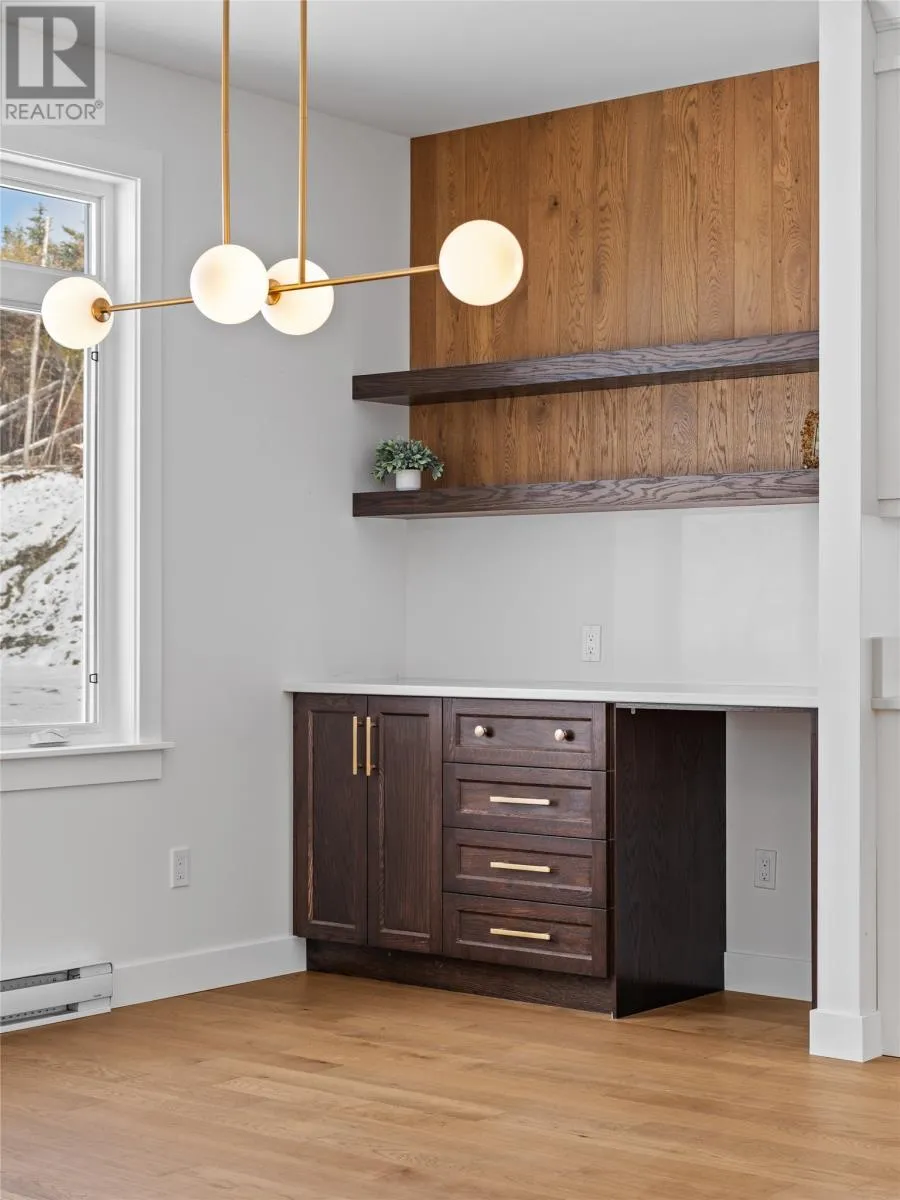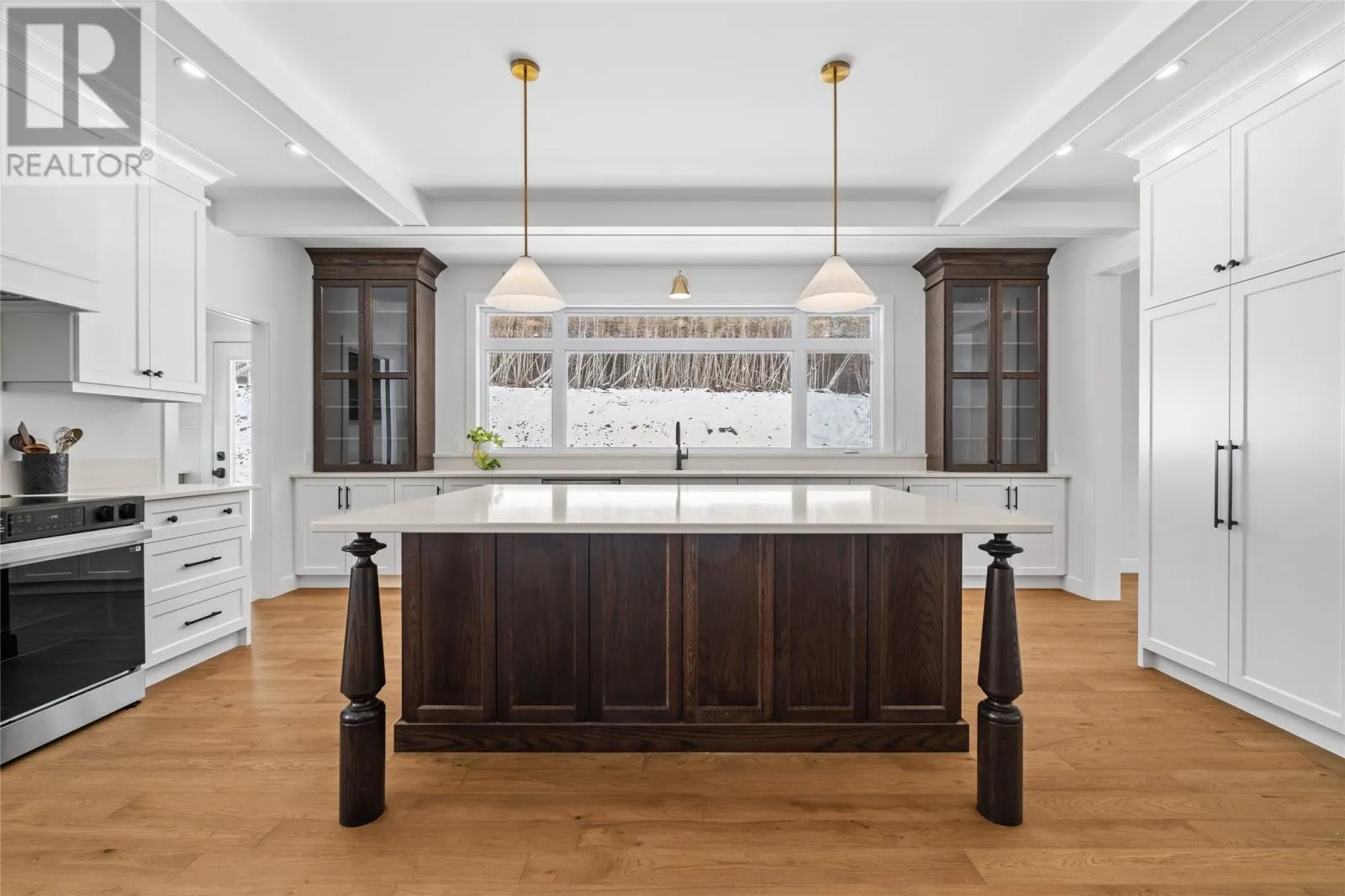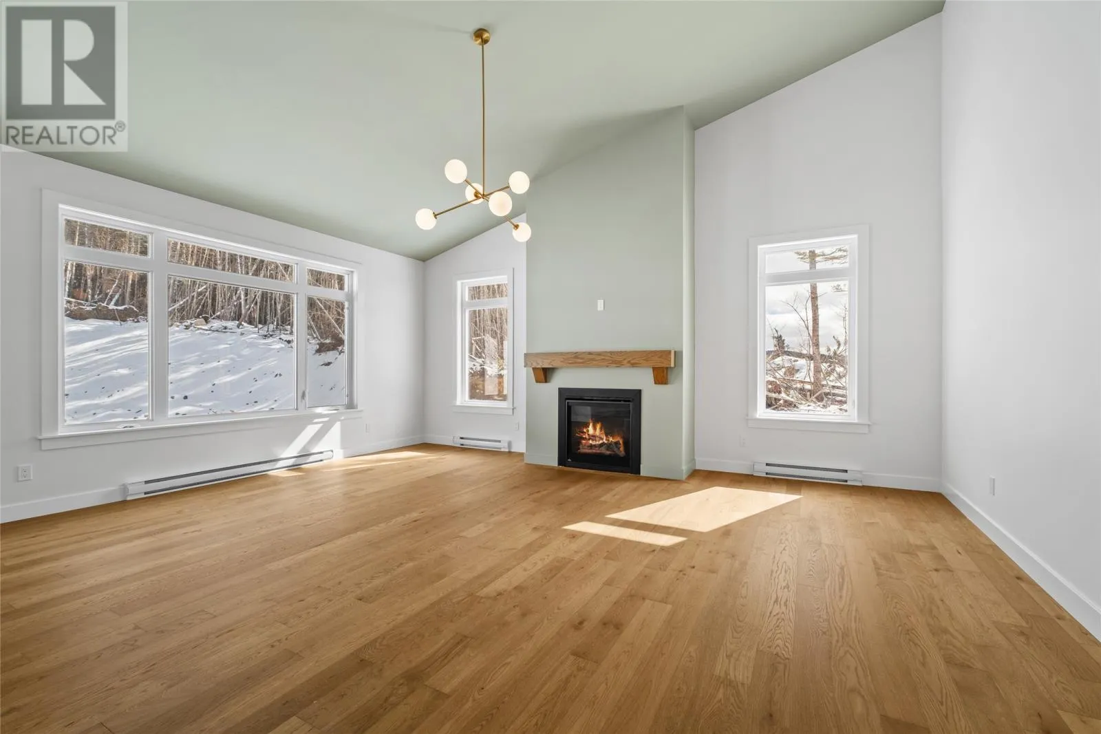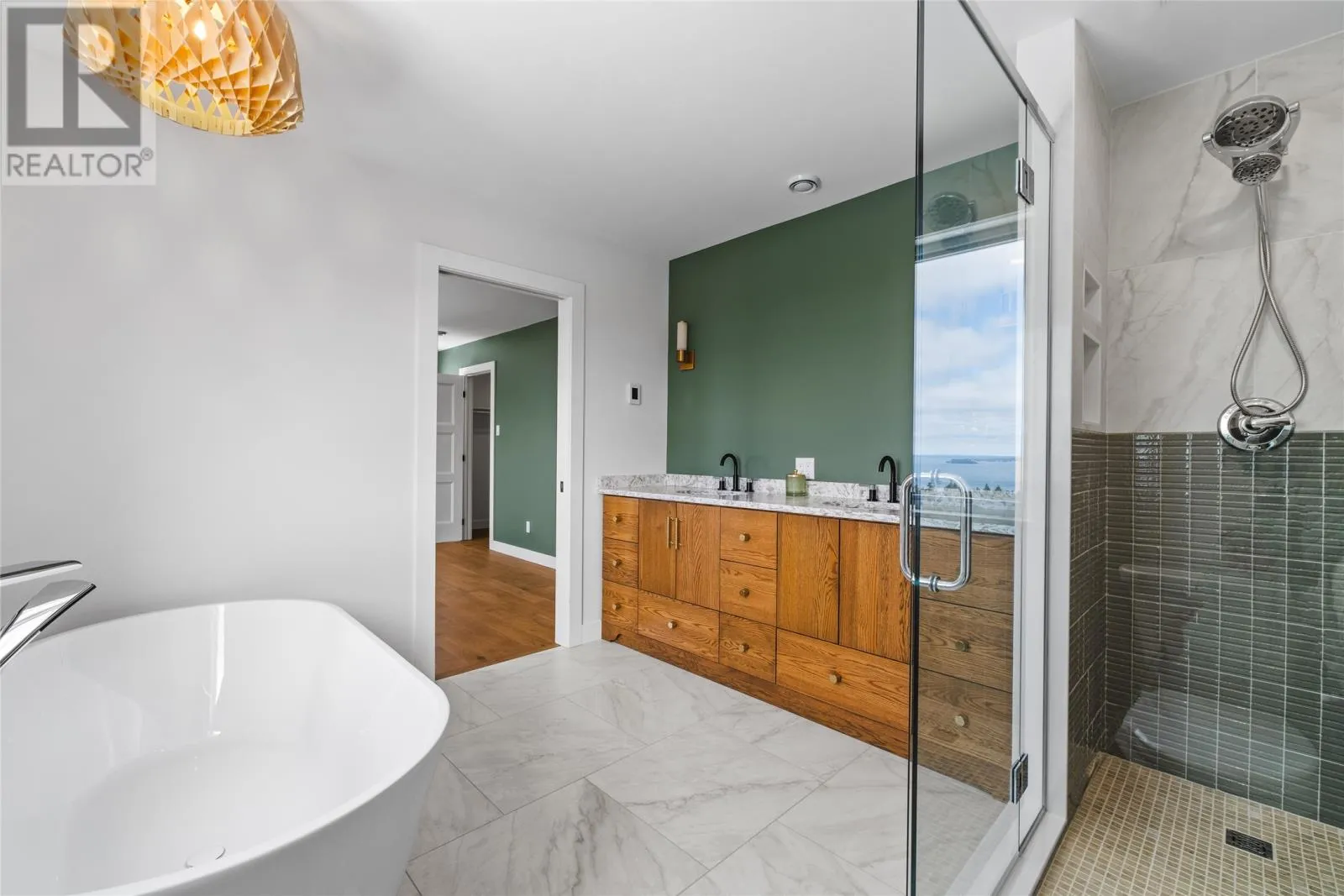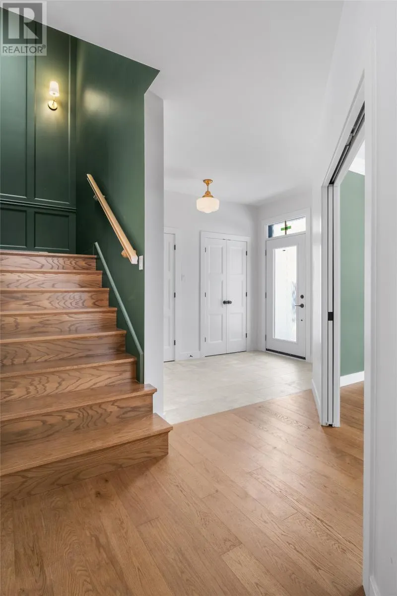 Absolutely stunning 2-storey NP Homes residence, ideally located on a quiet cul-de-sac in a family-friendly neighborhood, offering breathtaking ocean vistas! This newly constructed family home sits on a generously sized lot, providing privacy, panoramic ocean & tree views, & ample parking with potential for side driveway access to the rearâperfect for a future detached garage or additional drive-in access. The inviting front porch & foyer lead into a bright, thoughtfully designed interior, featuring abundant windows that flood the space with natural light & frame the surrounding scenery. The main floor impresses with 9-foot ceilings & spacious open-concept living, dining, & kitchen areas. The living room has a vaulted ceiling & is anchored by a propane fireplace with custom mantle, tile surround, & detailed millwork, while the gourmet kitchen showcases quartz countertops, ceiling-height cabinetry, a large sit-up island, stylish backsplash, & stainless steel appliance package, with an adjoining walk-in pantry with sink & abundant storage & dining area. Completing the main level are a dedicated large office, powder room, foyer & a convenient mudroom with laundry. Upstairs, the hardwood staircase leads to 4 generous bedrooms & a main family bath. The primary suite offers stunning views & features an elegant accent wall, walk-in closet, & spa-inspired ensuite with freestanding soaker tub, double quartz vanity, & custom shower. The large unfinished basement presents endless possibilities for future development. Additional features include a double paved driveway & an 8-year Lux Home Warranty. This exceptional property blends high-quality finishes such as upgraded electrical & plumbing fixture packages, oak hardwood floors, in-floor heat in ensuite & pantry, custom cabinetry throughout, as well as spectacular ocean views, direct access to the East Coast Trail, & a prime cul-de-sac location situated adjacent to elementary school. Truly a must-see! (id:27476)