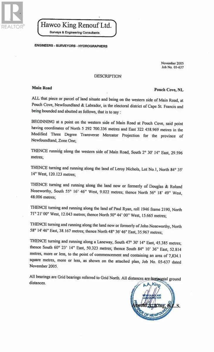 Looking for the perfect place to build your dream home? Look no further! This 1.93-acre parcel in scenic Pouch Cove offers endless possibilities for creating your ideal retreat. With stunning views, close proximity to the ocean, and just steps away from the community recreation ball field, this property combines natural beauty with convenience. Plus, itâs only a 20-minute drive to the capital cityâgiving you the best of both worlds. Currently wooded, the land allows you the freedom to design your home just the way you want it. Keep the mature trees for natural wind protection and privacy, clear a portion for sweeping views, or open it up entirely for a sun-filled oasis. Whatever your vision, this property is ready to bring it to life. Municipal services are available through the town. All permits, drawings, and service connections will be the responsibility of the purchaser. The land is being sold as-is, with a survey available upon request through your agent. HST does apply to the purchase of land and is not included in the listed price. For more details, reach out to your agent. (id:27476)