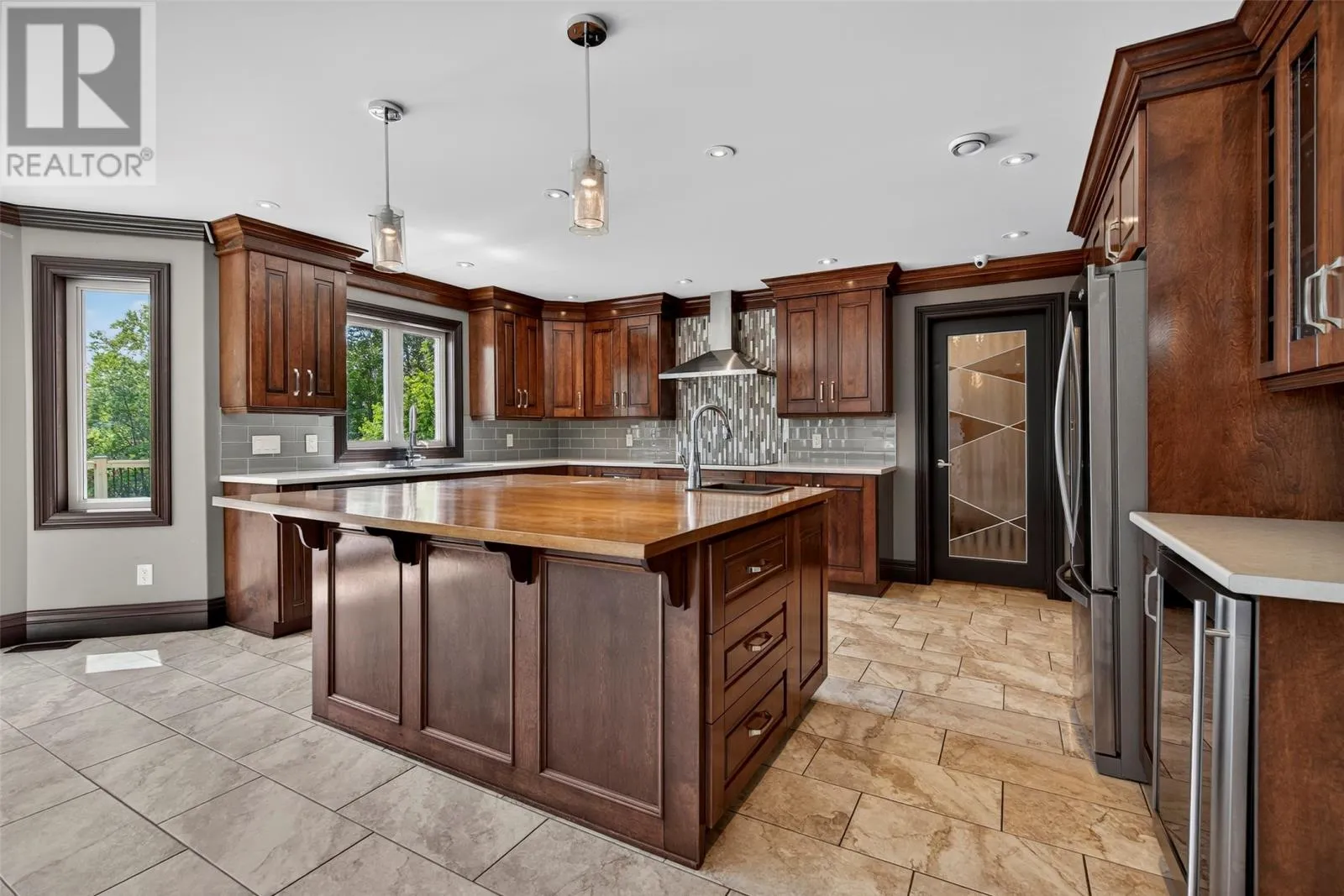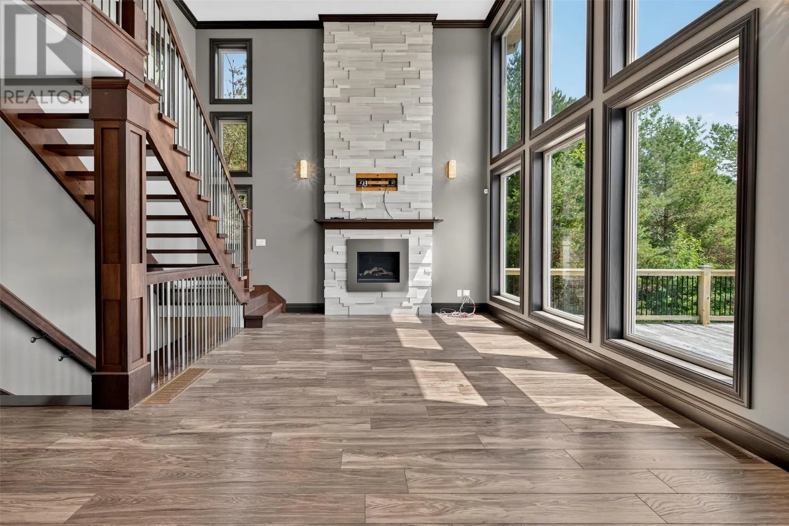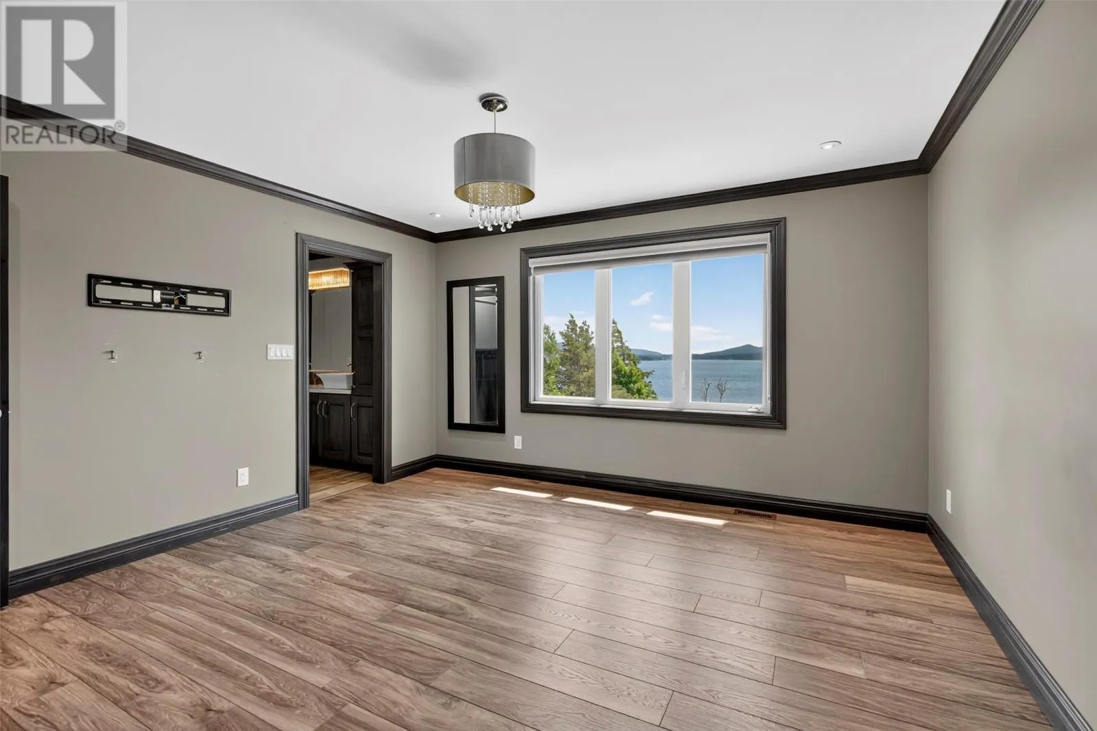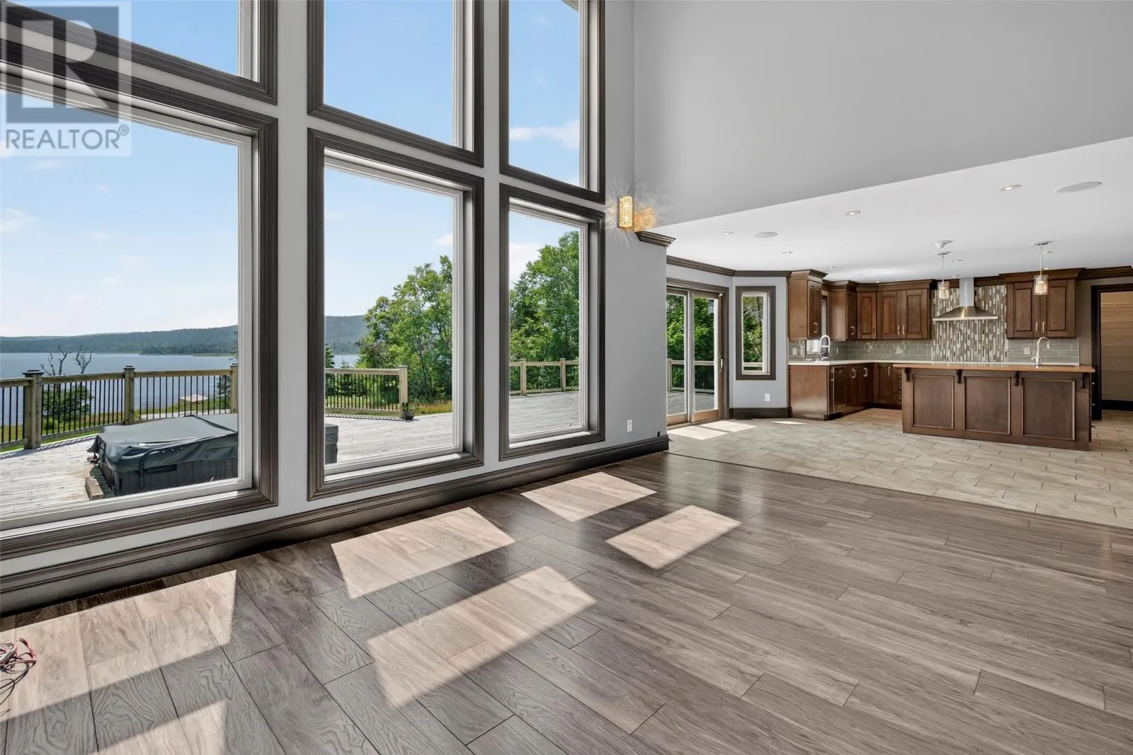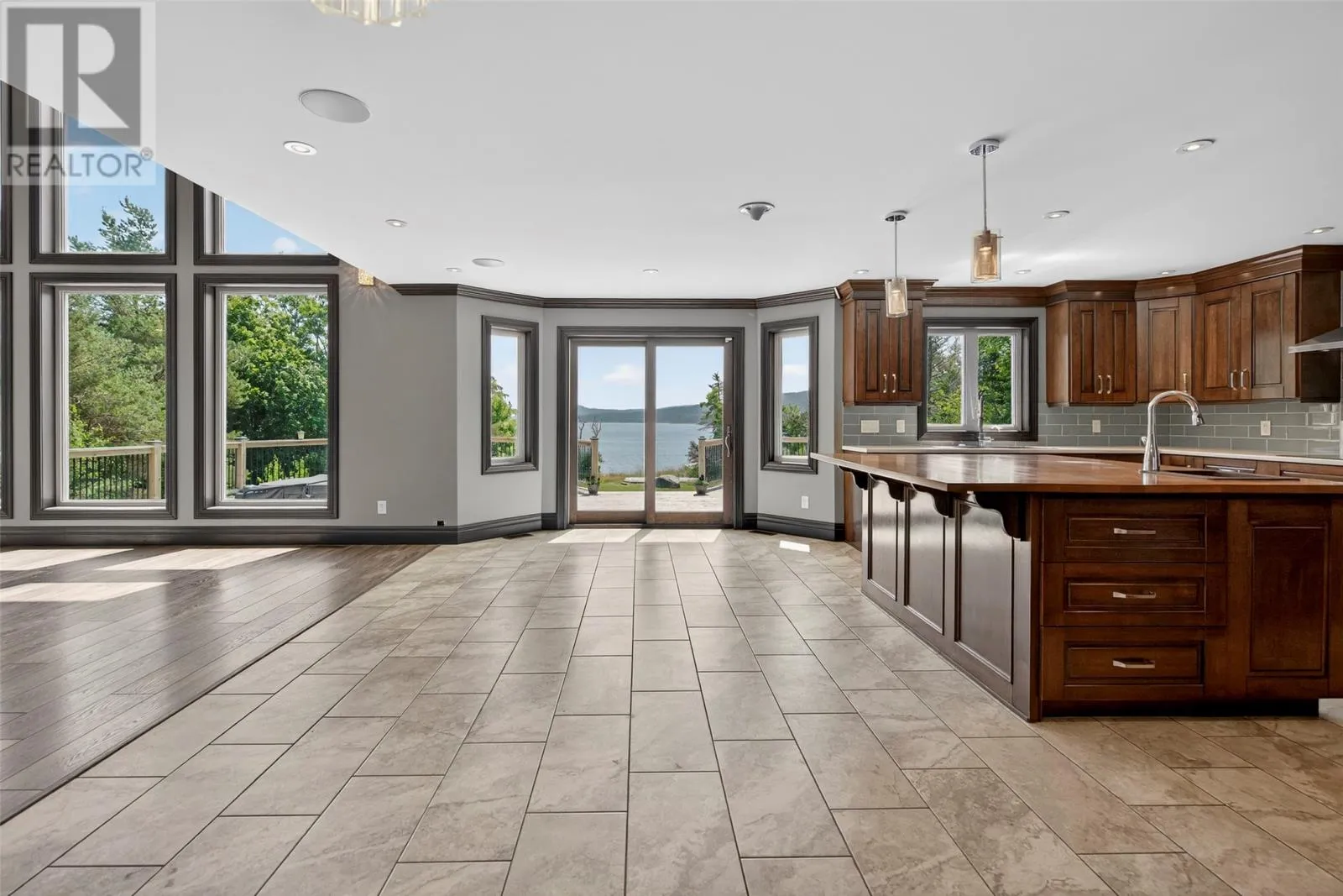 LUXURY PRIVATE WATERFRONT LIVING, 5 BED | 3.5 BATH | 3-BAY GARAGE | 1.25 Acres | 200' FRONTAGE ON SECOND POND. Just 20 Minutes from DOWNTOWN ST. JOHN'S! This executive one-of-a-kind waterfront home offers the perfect blend of privacy, luxury, and outdoor living on a stunning 1-acre lot with 200 feet of private pond frontage. Whether you're launching a Seadoo, paddleboard, or relaxing in the hot tub on your 1,500 sq/ft south-facing deck, this is the lifestyle you've been dreaming of! Featuring 5 spacious bedrooms, 3.5 bathrooms, and over 3800 sq/ft of living space, this home is a showstopper from the moment you enter. The grand foyer includes a convenient mudroom with direct access to the attached 2-car garage. A custom floating staircase and 16â ceilings highlight the breathtaking open-concept living area, all designed to maximize those panoramic lake views. The chefâs kitchen includes a massive walk-in pantry and flows beautifully into the dining and living areas. Upstairs, the primary suite features beautiful views, a spa-inspired ensuite, and a generous walk-in closet. Three additional bedrooms, full bath, and laundry complete the upper level. The fully developed basement includes a large family room, office, additional bedroom, full bath, and ample storage space. An additional 3-bay detached garage (heated with mini split) offers the perfect space for your collector car, ATVs, or watercraft. Efficient dual-zone forced air heat pump system ensures year round comfort. (id:27476)