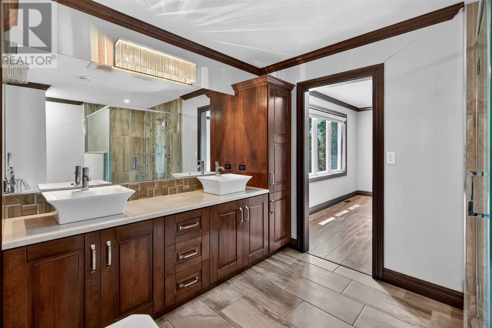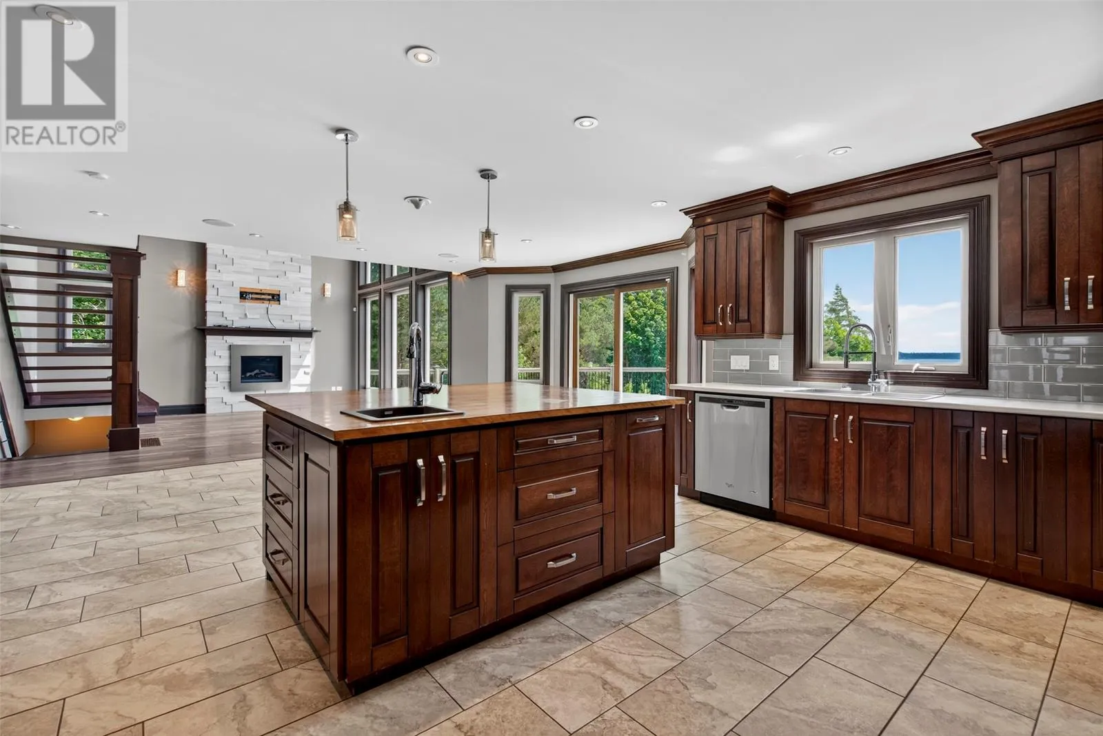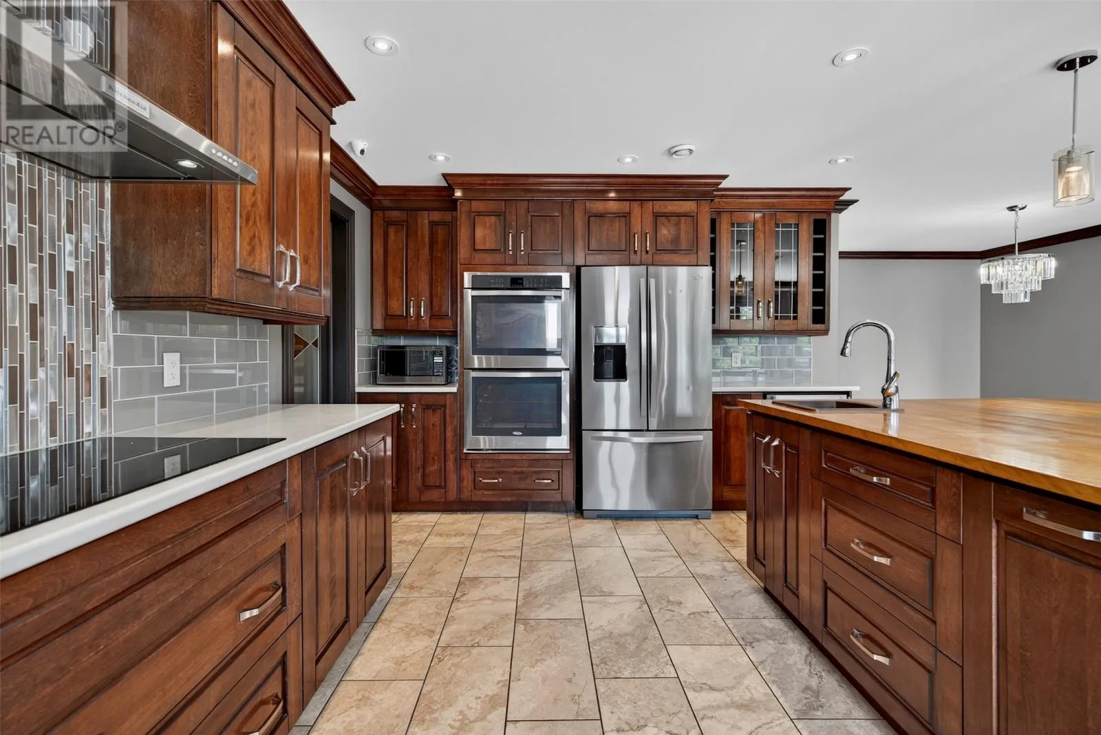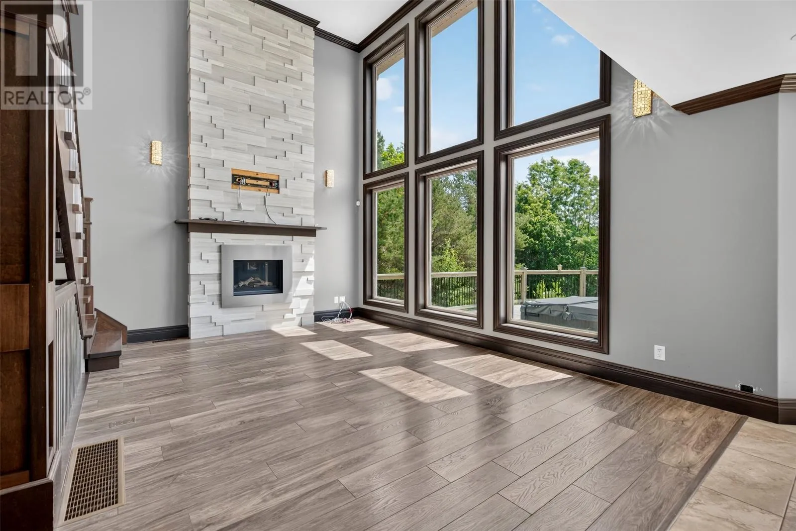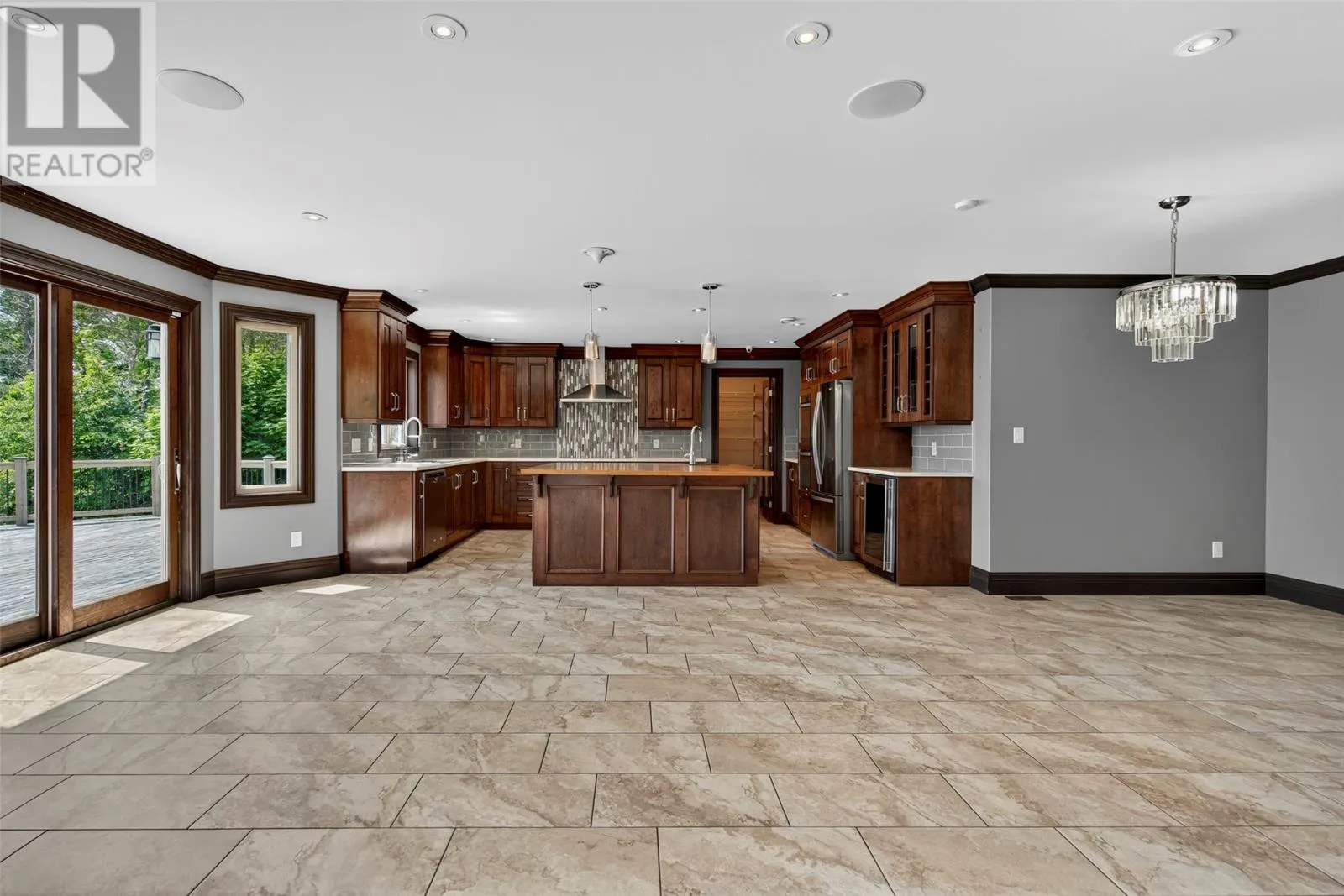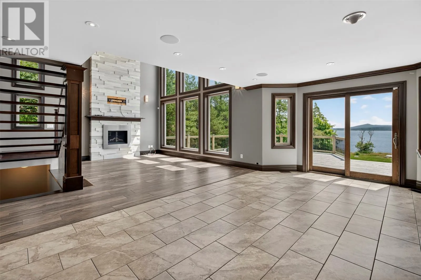 LUXURY PRIVATE WATERFRONT LIVING, 5 BED | 3.5 BATH | 3-BAY GARAGE | 1.25 Acres | 200' FRONTAGE ON SECOND POND. Just 20 Minutes from DOWNTOWN ST. JOHN'S! This executive one-of-a-kind waterfront home offers the perfect blend of privacy, luxury, and outdoor living on a stunning 1-acre lot with 200 feet of private pond frontage. Whether you're launching a Seadoo, paddleboard, or relaxing in the hot tub on your 1,500 sq/ft south-facing deck, this is the lifestyle you've been dreaming of! Featuring 5 spacious bedrooms, 3.5 bathrooms, and over 3800 sq/ft of living space, this home is a showstopper from the moment you enter. The grand foyer includes a convenient mudroom with direct access to the attached 2-car garage. A custom floating staircase and 16â ceilings highlight the breathtaking open-concept living area, all designed to maximize those panoramic lake views. The chefâs kitchen includes a massive walk-in pantry and flows beautifully into the dining and living areas. Upstairs, the primary suite features beautiful views, a spa-inspired ensuite, and a generous walk-in closet. Three additional bedrooms, full bath, and laundry complete the upper level. The fully developed basement includes a large family room, office, additional bedroom, full bath, and ample storage space. An additional 3-bay detached garage (heated with mini split) offers the perfect space for your collector car, ATVs, or watercraft. Efficient dual-zone forced air heat pump system ensures year round comfort. (id:27476)